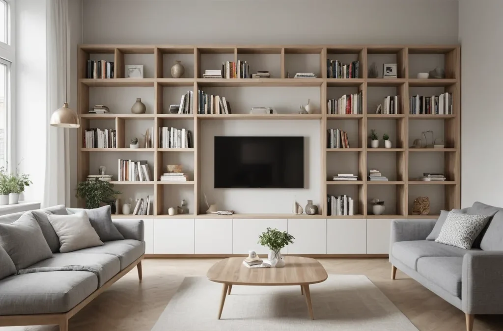 Совет дизайнеров: Для небольших комнат отдавайте предпочтение стеллажам светлых оттенков, открытым моделям или моделям с зеркальными или стеклянными элементами. Они отражают свет и создают ощущение простора. Рассмотрите также угловые стеллажи, которые эффективно используют свободное пространство.