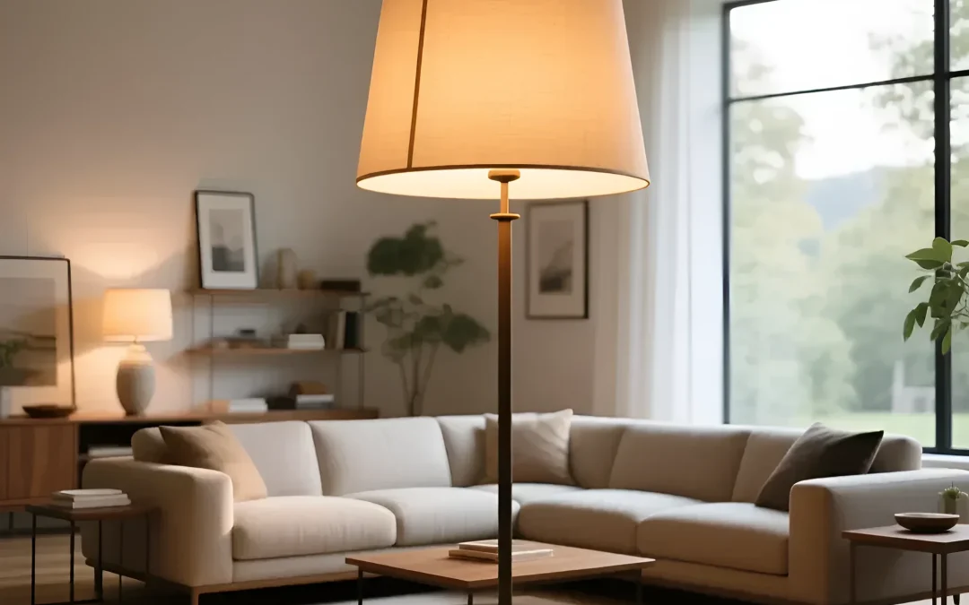 Высокий напольный торшер с широким бежевым абажуром, создающий мягкий теплый свет в современном интерьере гостиной с угловым диваном.