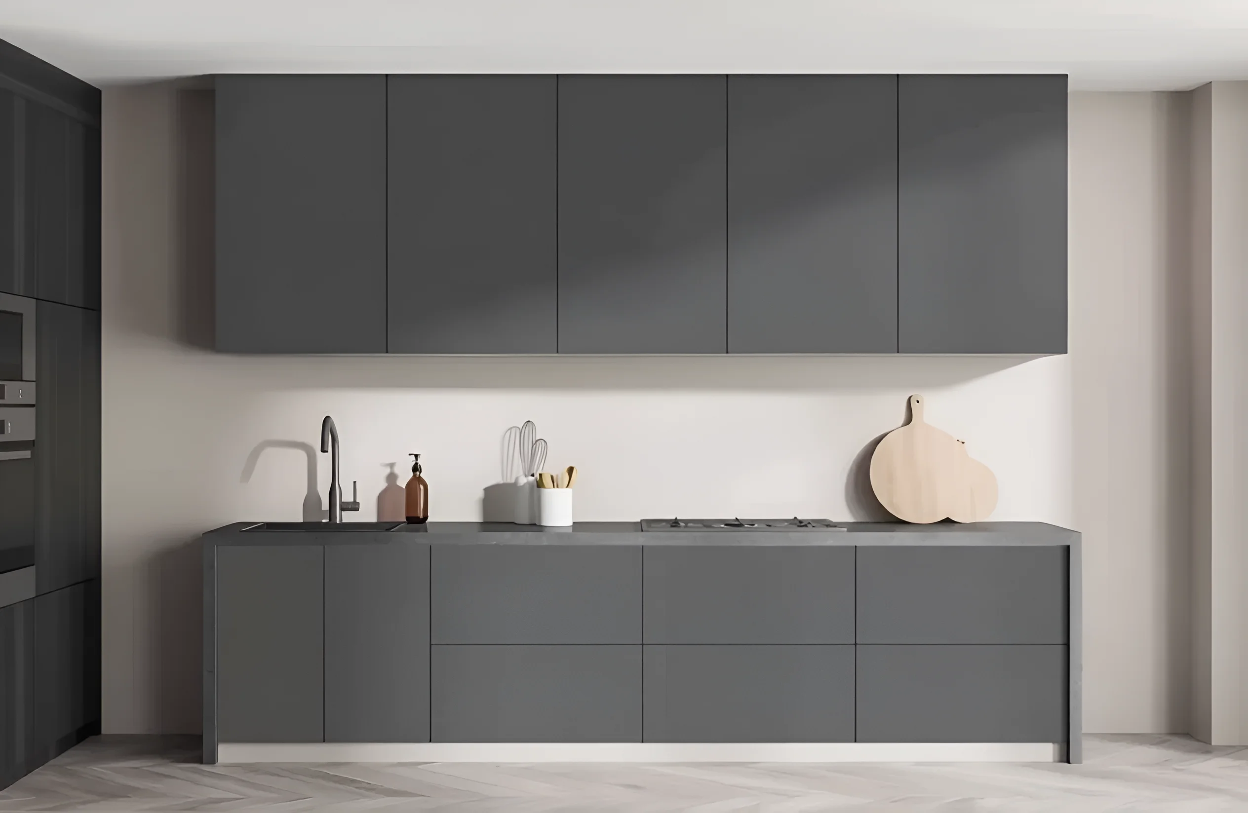 Центральным элементом этой кухни является ее уникальный цвет фасадов — «Угольный камень». Это глубокий, насыщенный оттенок серого, который придает интерьеру изысканность и современный шарм. «Угольный камень» прекрасно гармонирует как со светлыми, так и с яркими акцентами, позволяя вам экспериментировать с декором и создавать по-настоящему уникальное пространство. Прямая планировка длиной 2,4 метра является универсальным решением для большинства стандартных кухонь, обеспечивая максимальную эффективность использования пространства. Серия «Эко» ориентирована на практичность и современный минимализм, что делает ее идеальным выбором для тех, кто ценит чистоту линий и функциональность.
