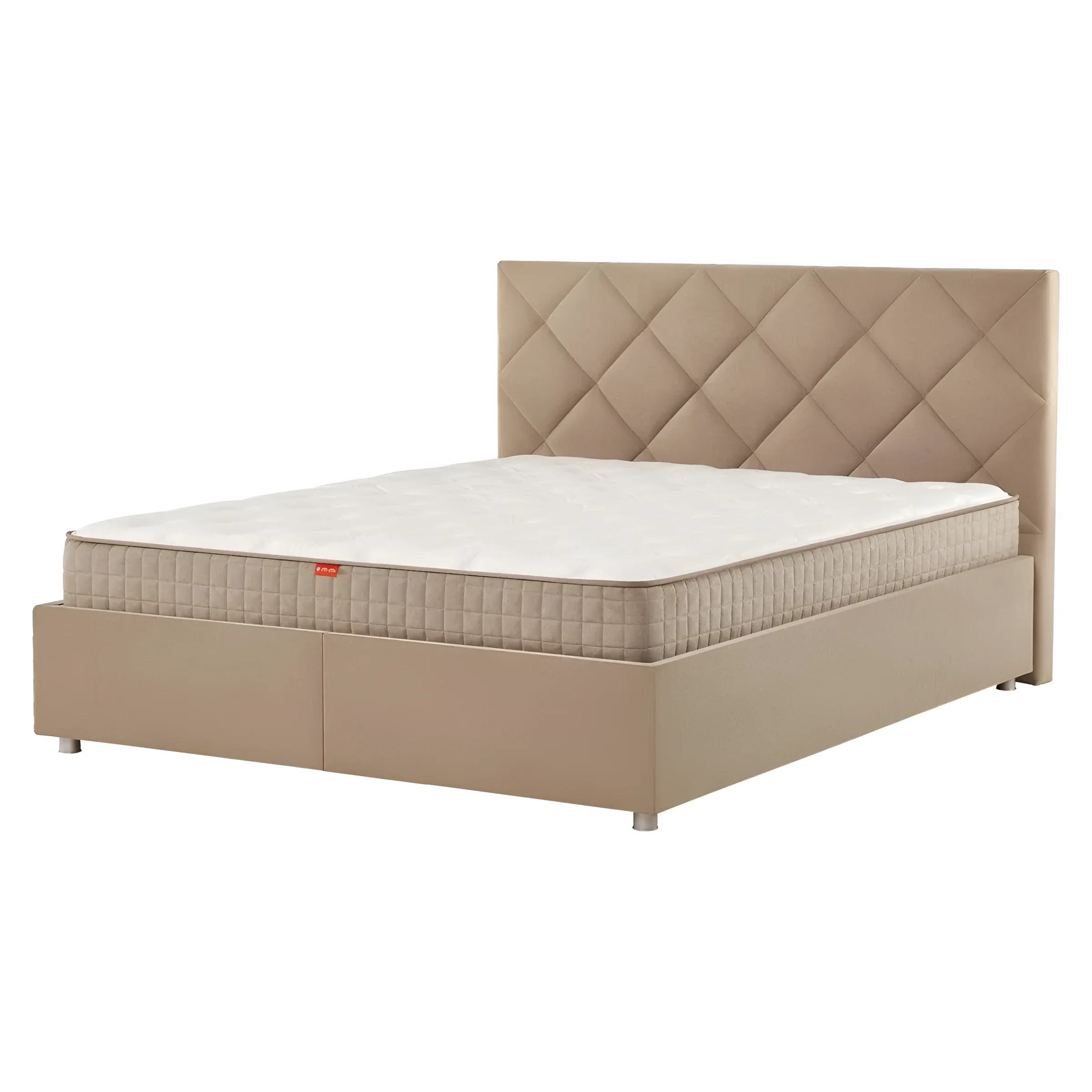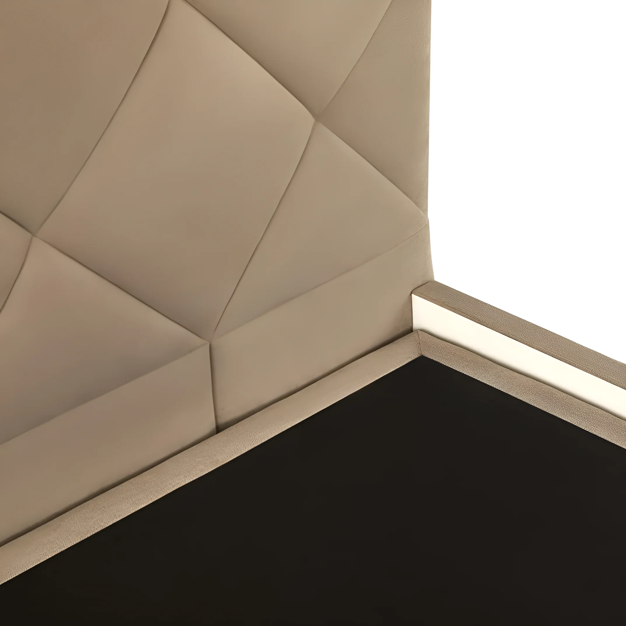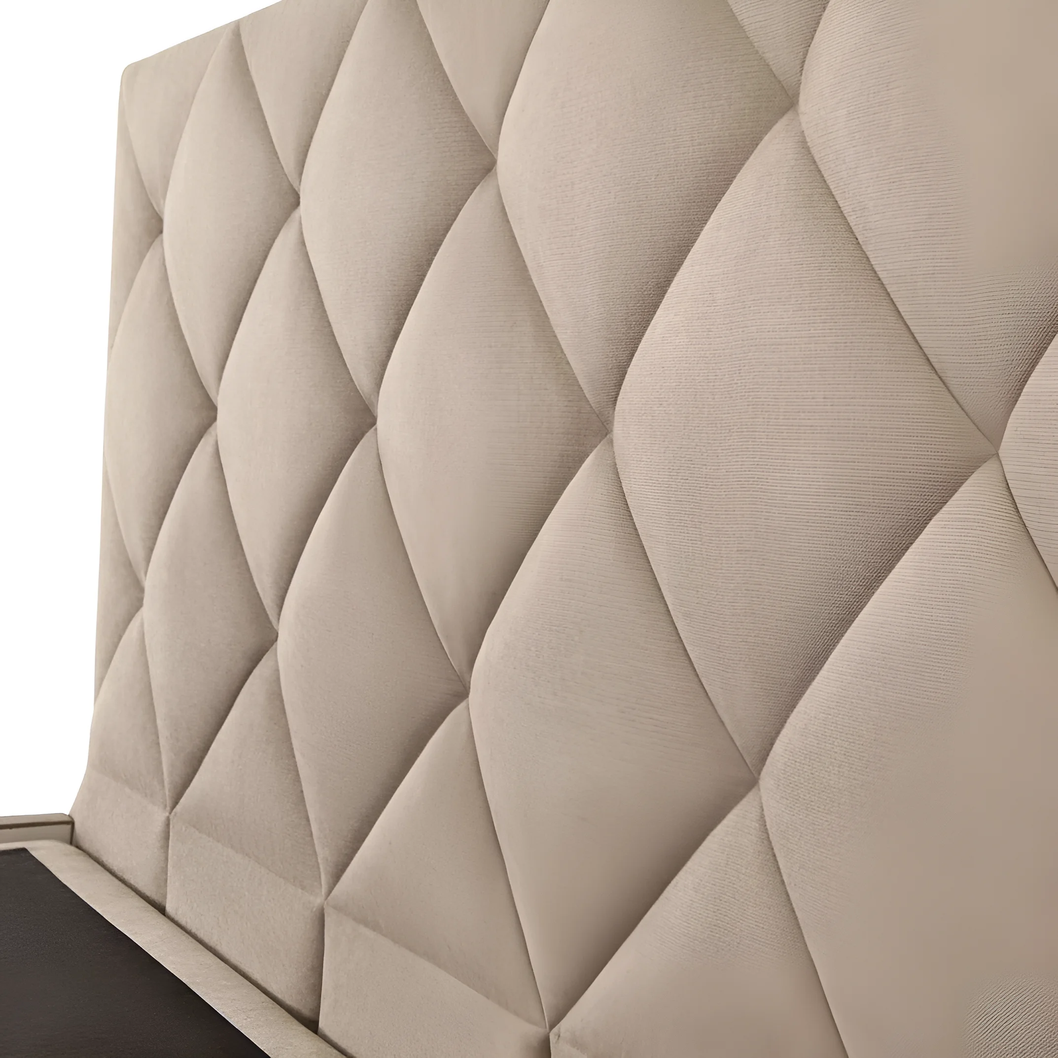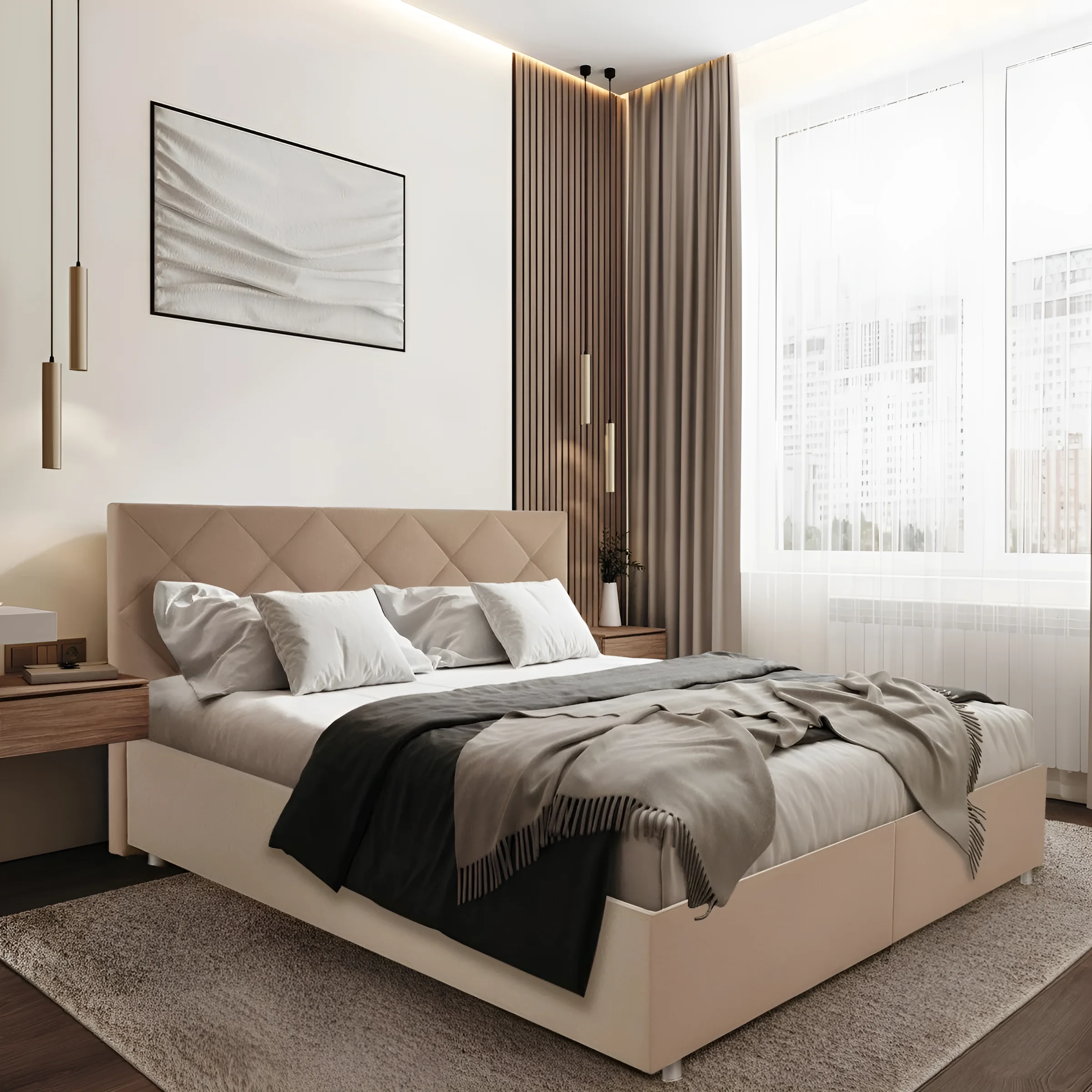 Особое внимание в модели Eva уделено внешнему виду. Изысканное мягкое изголовье с декоративной прострочкой в виде ромбов придает кровати утонченный и роскошный вид. Эта деталь не только эстетична, но и функциональна – она обеспечивает дополнительный комфорт, когда вы читаете книгу или смотрите телевизор перед сном. Обивка выполнена из высококачественной мебельной ткани, приятной на ощупь и устойчивой к износу. Нейтральный бежевый или светло-коричневый оттенок, представленный на изображении, является универсальным и легко сочетается с различными цветовыми палитрами в интерьере. Чистые линии и отсутствие лишних деталей подчеркивают современный характер кровати, делая ее актуальной на долгие годы. Это выбор для тех, кто ценит минимализм, но не готов жертвовать элегантностью и функциональностью, стремясь создать идеальное пространство для отдыха.