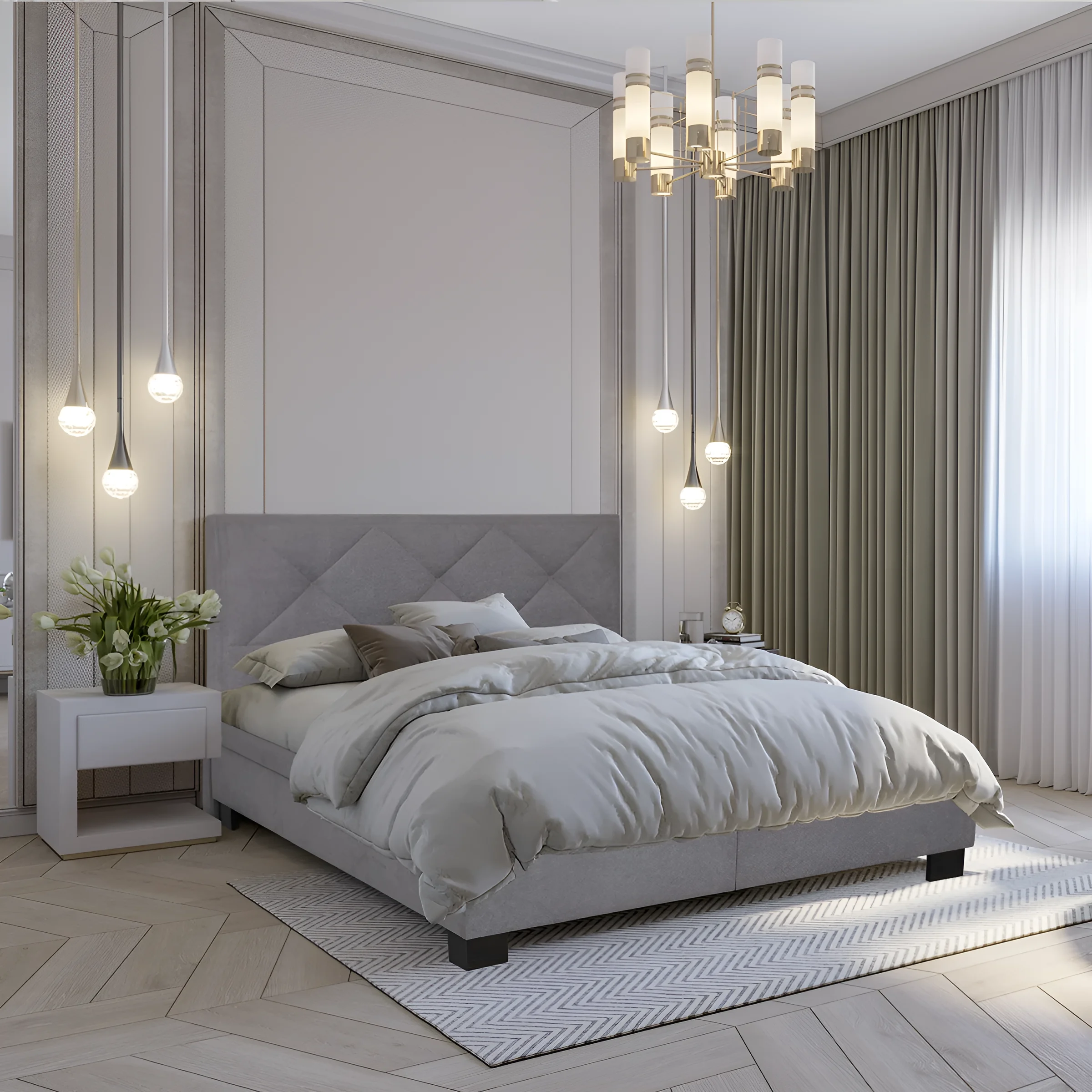 Дизайн кровати Naomi 160X200 разработан с учетом последних тенденций в мире интерьера. Ее главное украшение – это высокое, мягкое изголовье, обитое качественной тканью приятного серого оттенка. Изголовье имеет оригинальную ромбовидную стежку, которая придает модели утонченность и изысканность, создавая при этом ощущение мягкости и объемности. Этот элемент не только служит декоративной цели, но и обеспечивает дополнительный комфорт, когда вы читаете книгу или смотрите фильм перед сном. Сдержанная цветовая гамма позволяет кровати Naomi легко вписаться как в классические, так и в более современные интерьеры, становясь гармоничной частью общего ансамбля спальни. Плавные линии и отсутствие лишних деталей подчеркивают минималистичный, но при этом роскошный характер изделия.