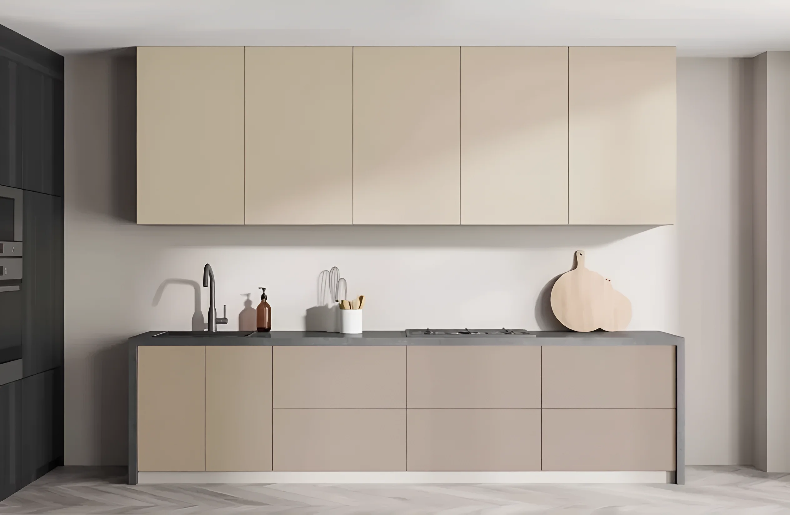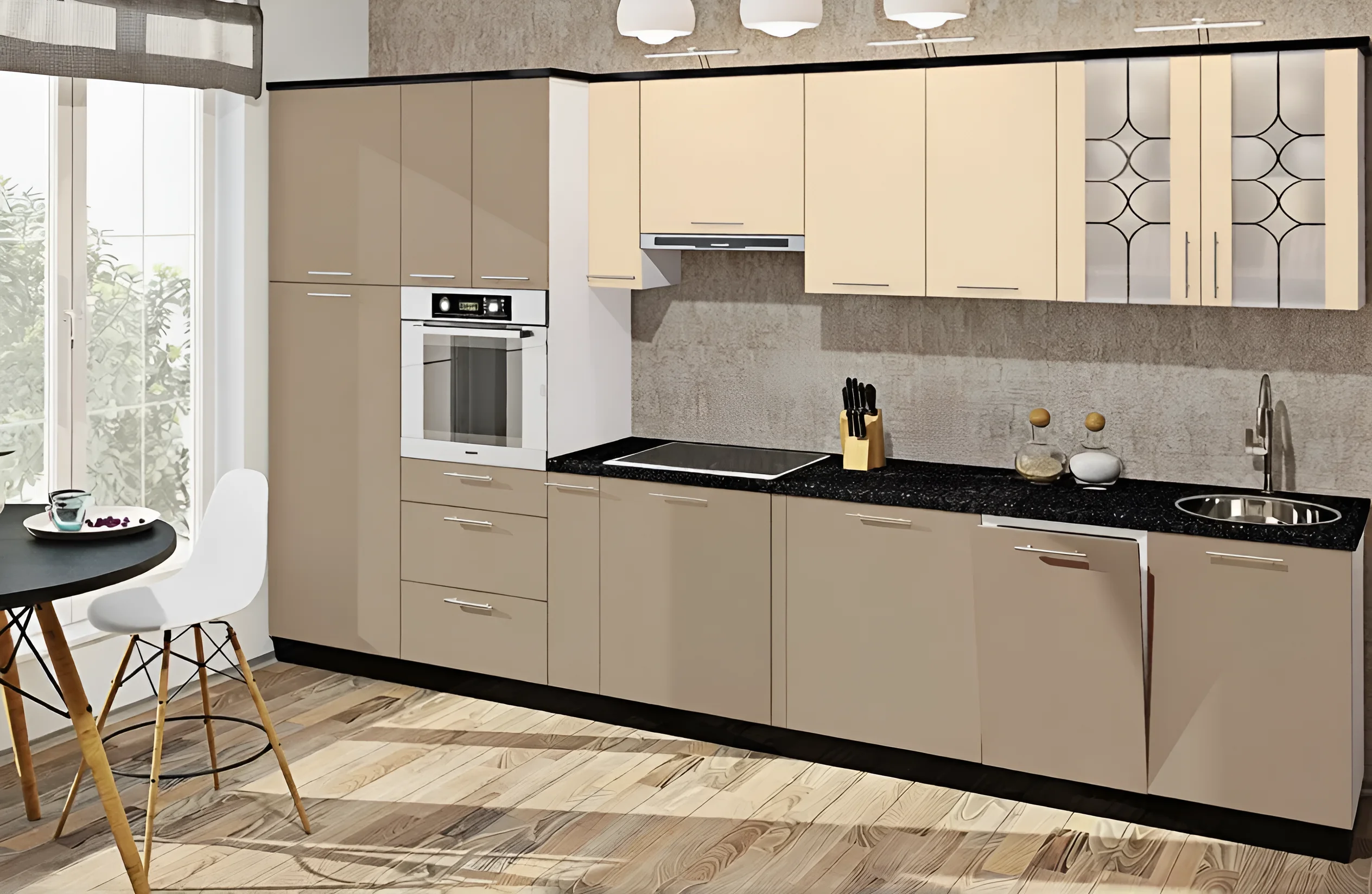 Кухня «Эко» Ваниль продумана до мельчайших деталей для максимального удобства в использовании. Стандартная высота кухни в 2,15 метра позволяет комфортно разместить все необходимые элементы и бытовую технику. Верхние шкафы предлагаются в двух вариантах высоты: 720 мм и 920 мм. Это дает возможность выбрать оптимальное решение в зависимости от ваших потребностей в хранении и высоты потолков. Шкафы высотой 920 мм идеально подходят для тех, кому требуется максимум места для посуды и кухонных принадлежностей. Глубина нижних тумб составляет 450 мм, что является стандартным и очень удобным размером для размещения встроенной техники и хранения крупной посуды. Глубина столешницы – 600 мм – обеспечивает просторную рабочую зону, где удобно готовить, размещать мелкую бытовую технику и наслаждаться процессом. Эргономичное расположение всех элементов способствует созданию «рабочего треугольника», минимизируя лишние движения и делая процесс приготовления пищи максимально эффективным и приятным. Наличие большого количества функциональных отделений и ящиков позволит поддерживать порядок и легко находить нужные предметы.