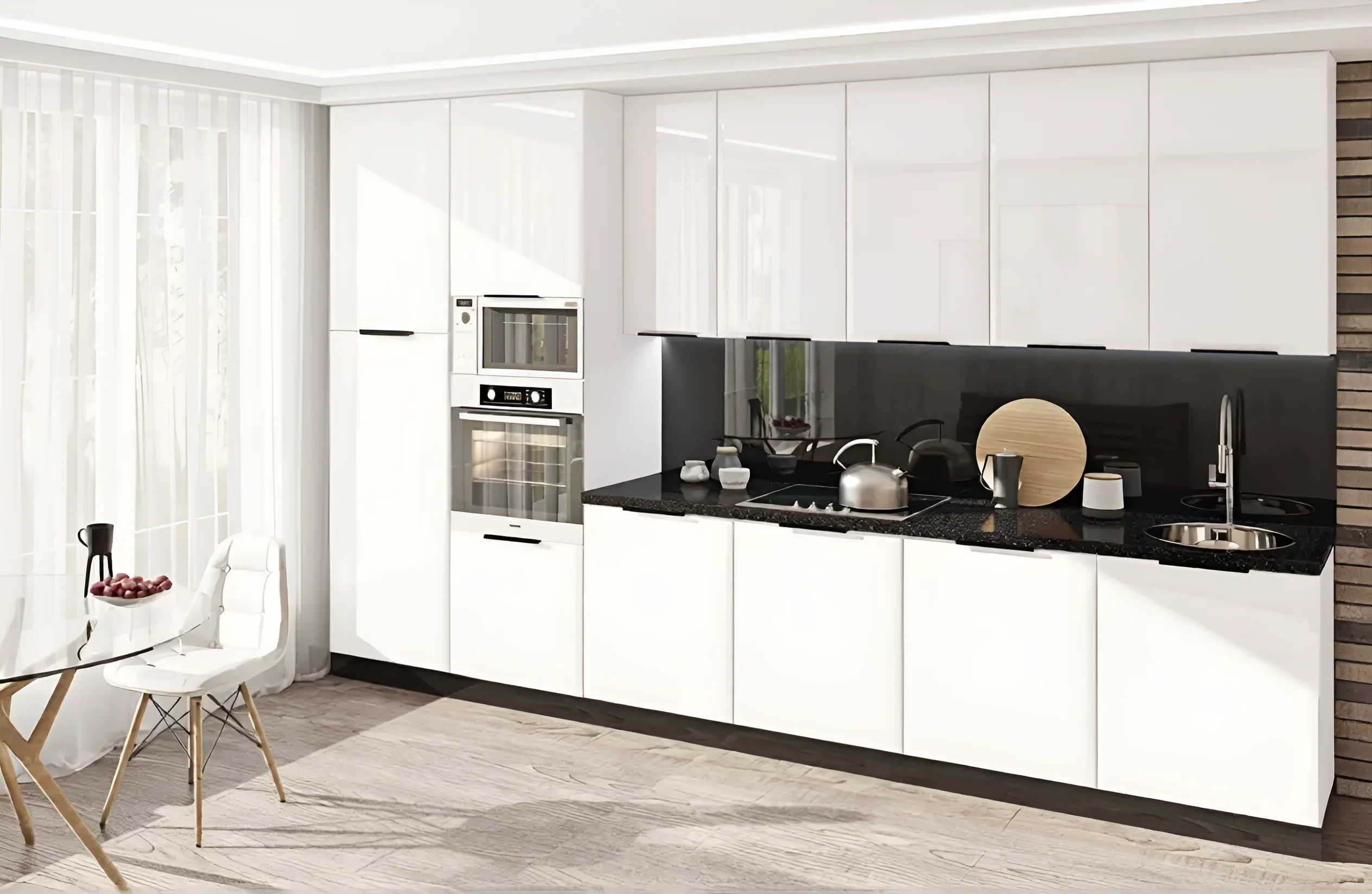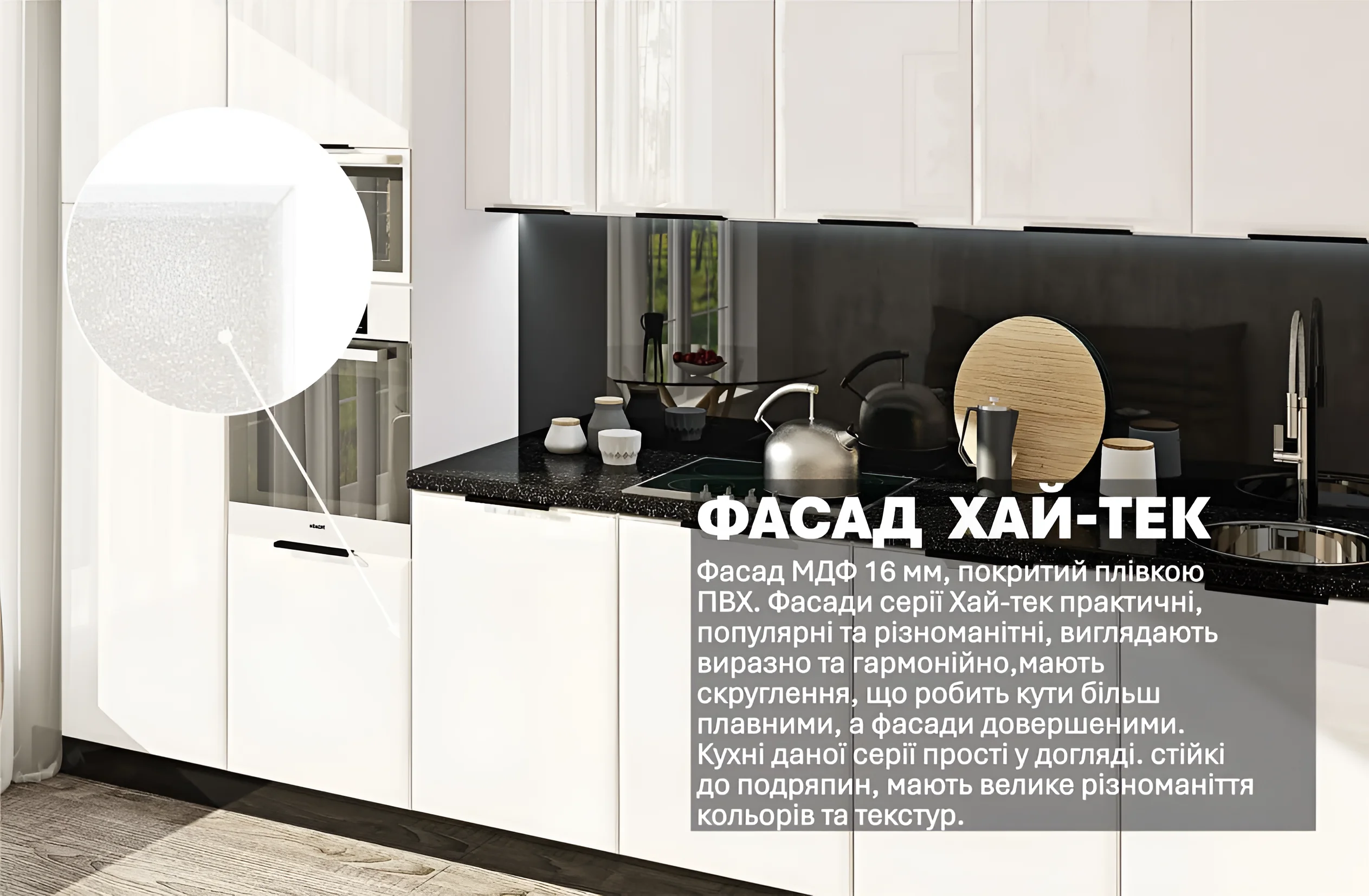 Модель «Хай-тек» — это воплощение минимализма, чистоты линий и функциональности, присущих современному стилю. Белый цвет фасадов придает кухне особую свежесть, визуально расширяя пространство и наполняя его светом. Глянцевое покрытие фасадов, выполненных из высококачественного МДФ с плёнкой ПВХ, добавляет интерьеру изысканности и легкости. Такая поверхность не только выглядит очень эффектно, но и удивительно практична в уходе, легко очищается от загрязнений, сохраняя свой первозданный блеск на долгие годы. Серия «Хай-тек глянец» подчеркивает стремление к совершенству в каждой детали.