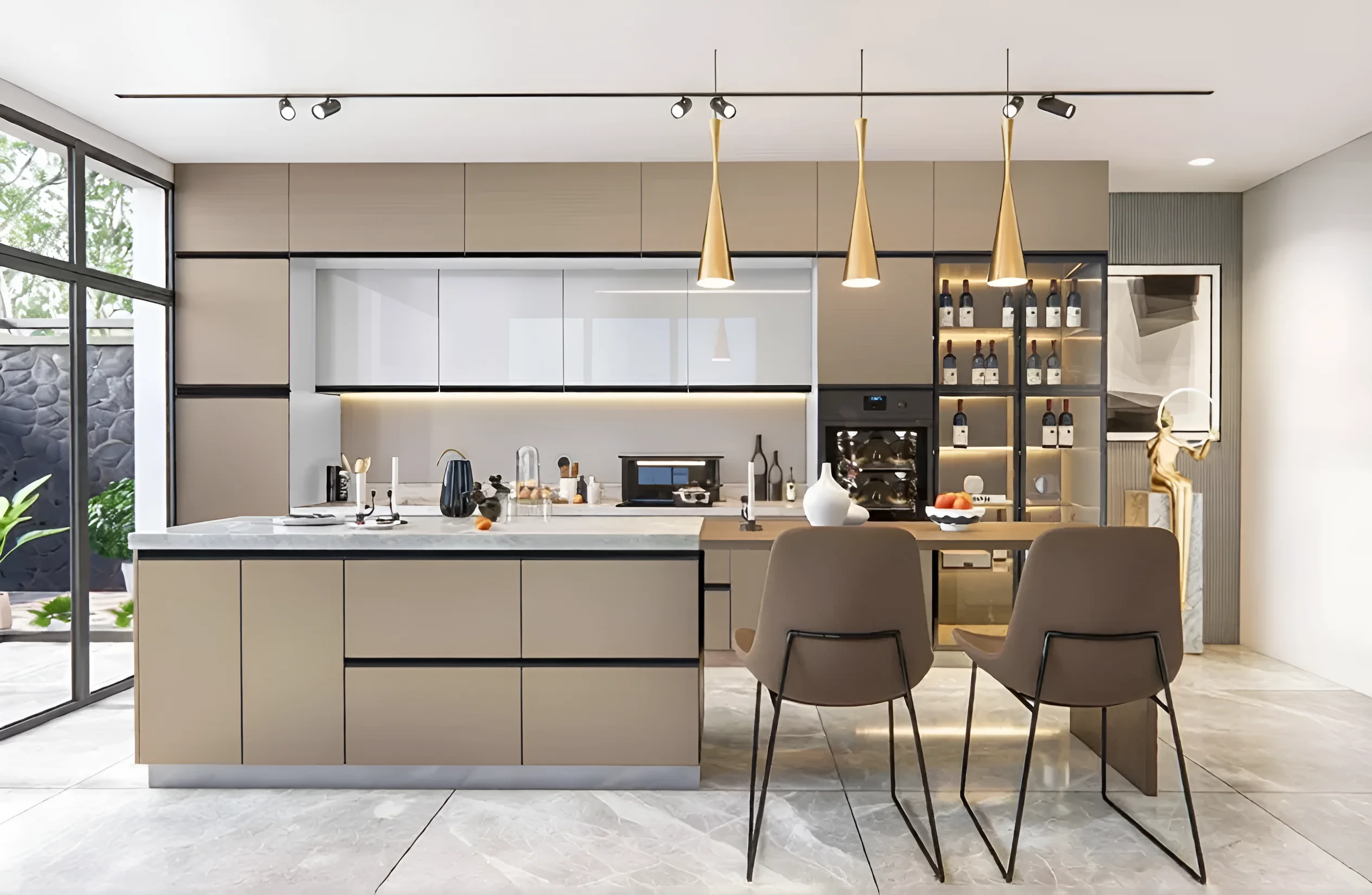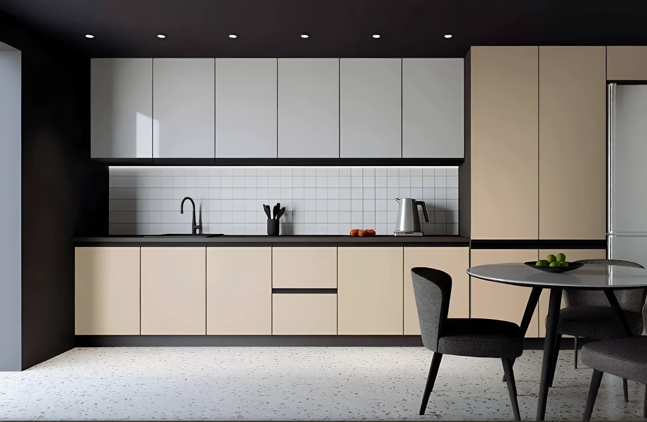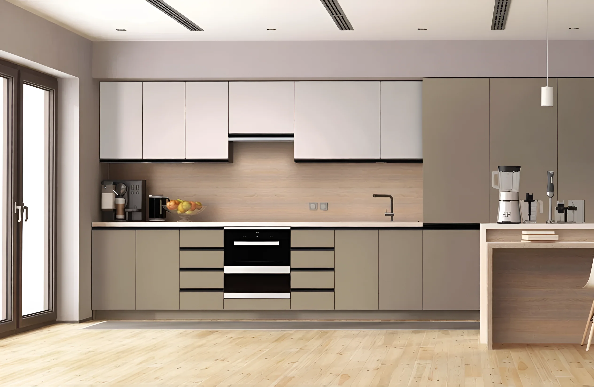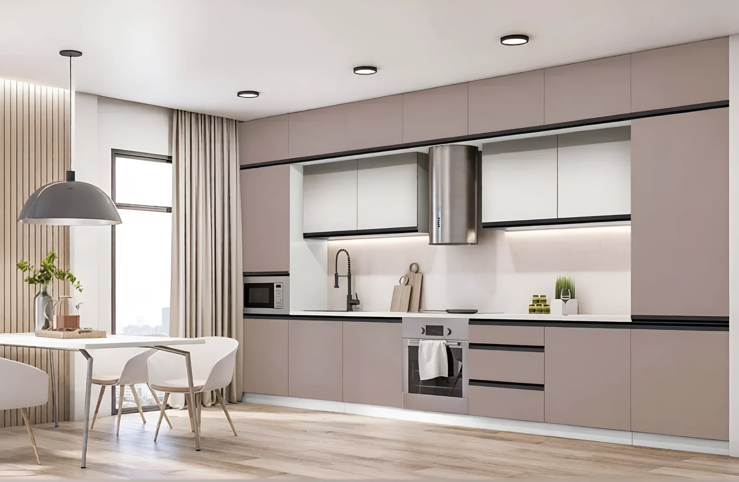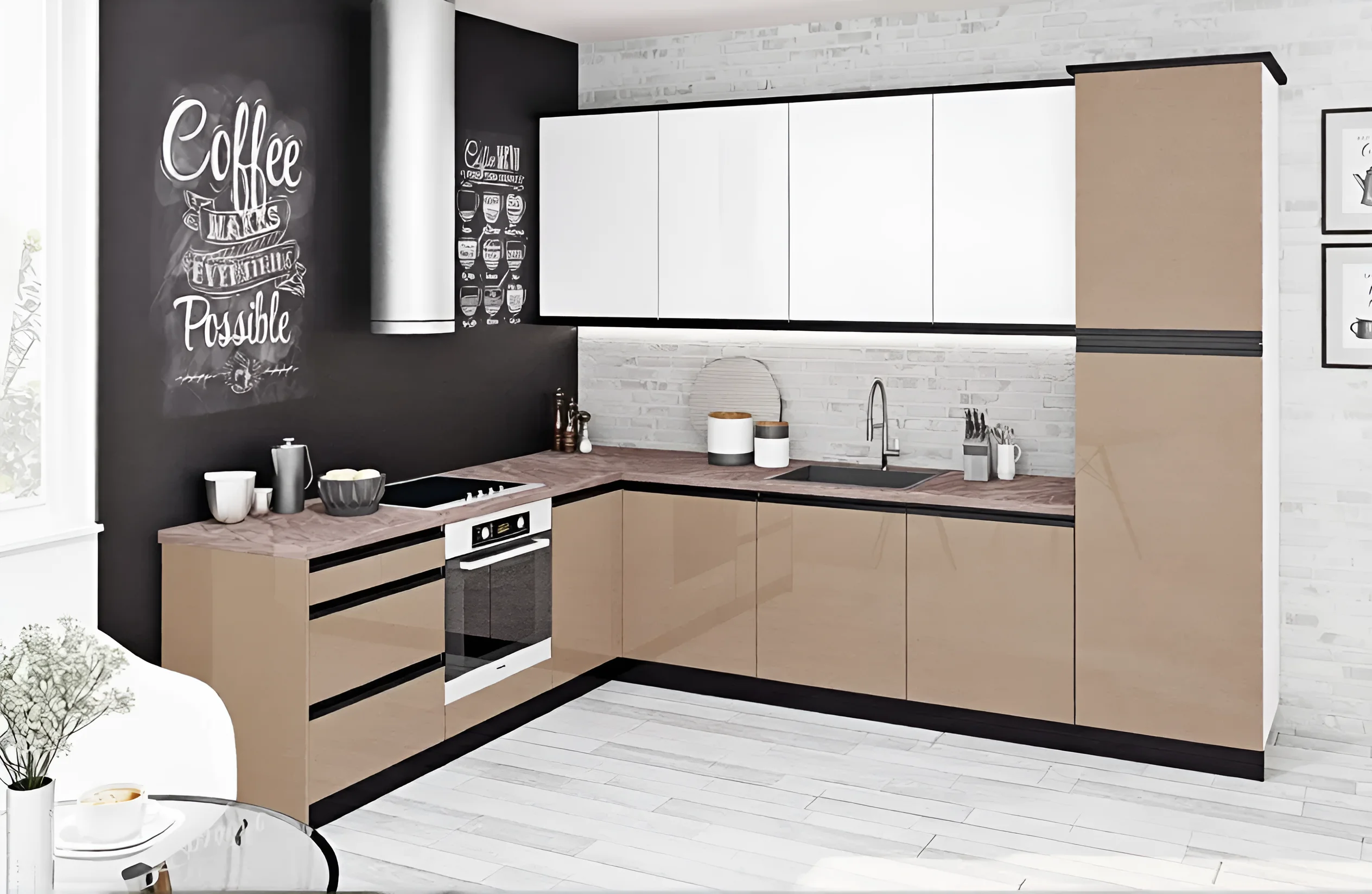 Кухня «Sigma ручка» является образцом современного минимализма с акцентом на чистоту линий и гармонию цвета. Представленная модель выполнена в изысканном сочетании Белого и Капучино, что позволяет легко интегрировать её в любой интерьер, от классического до ультрасовременного. Белые фасады, как правило, используются для верхних шкафов, визуально расширяя пространство и добавляя света, а фасады цвета Капучино для нижних тумб создают теплоту и уют. Такое цветовое решение не только выглядит стильно, но и практично в повседневном использовании. Серия «Sigma ручка» отличается элегантными встроенными ручками, которые подчеркивают гладкость фасадов и обеспечивают удобство открывания, сохраняя при этом лаконичный внешний вид.