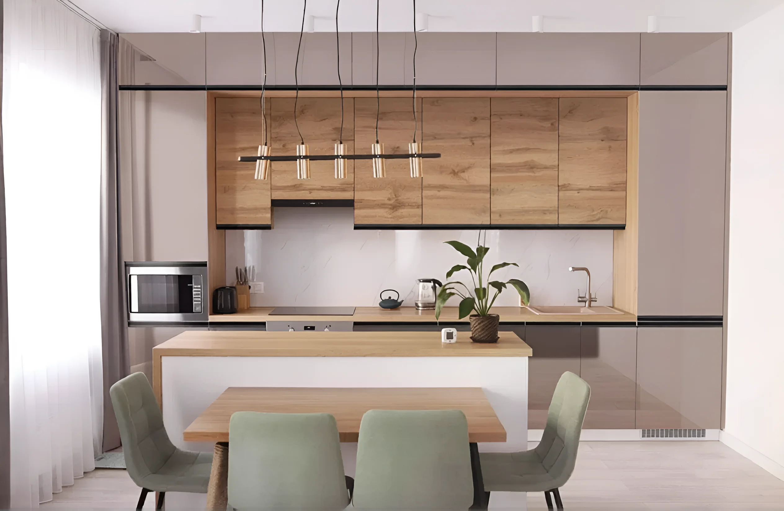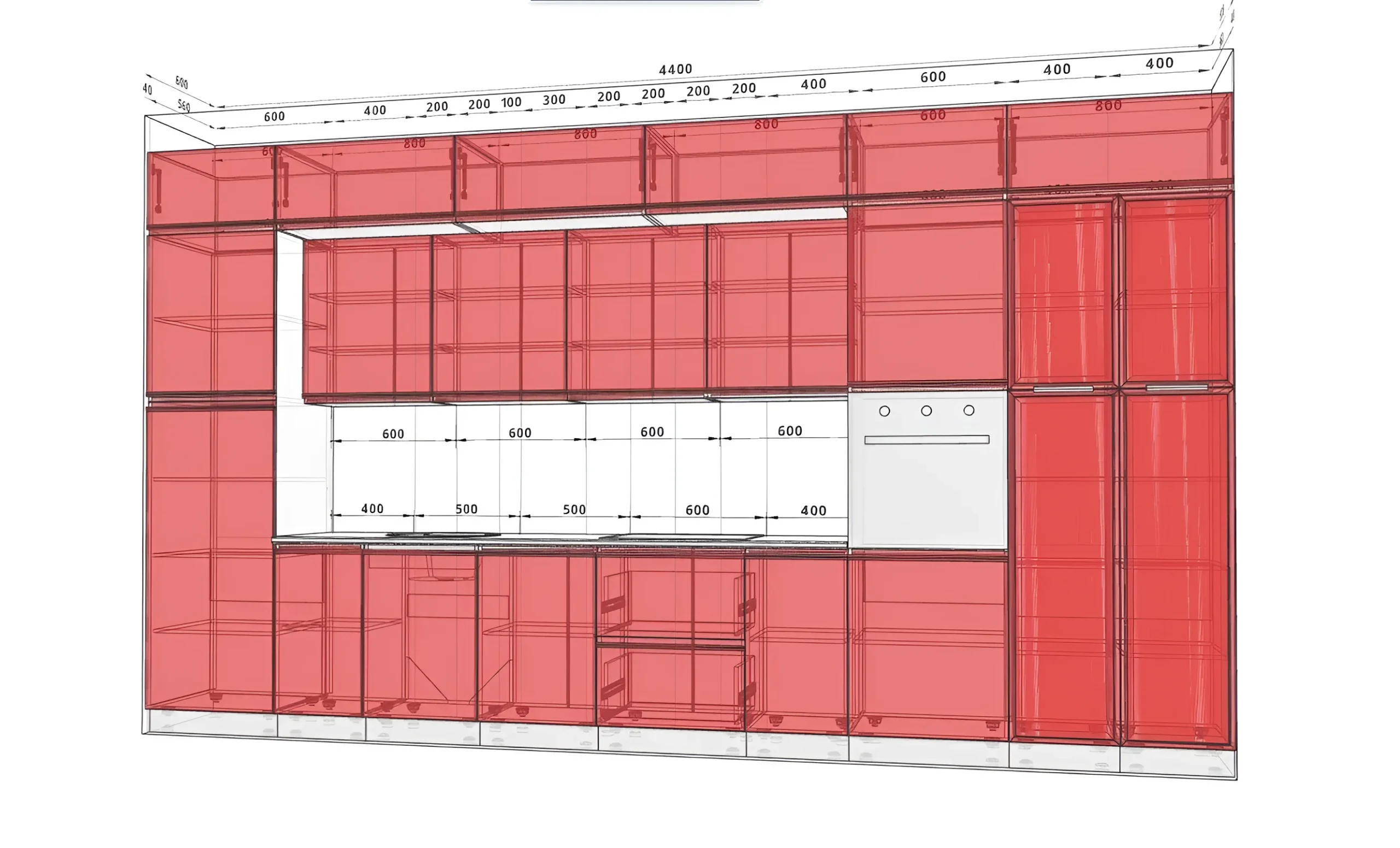 Эта кухня длиной 4.4 метра с островом предоставляет обширное рабочее пространство и множество мест для хранения. Высота кухни составляет впечатляющие 2.5 метра, что означает «до потолка», включая антресоли. Такое решение максимально эффективно использует вертикальное пространство, предоставляя дополнительное место для редко используемой утвари или сезонных предметов. Высота верхних шкафов предлагается в двух вариантах: 1080 мм и 1280 мм, что позволяет выбрать оптимальную конфигурацию под ваши потребности и высоту потолков. Глубина нижних тумб составляет стандартные 450 мм, обеспечивая удобный доступ к содержимому, а глубина столешницы в 600 мм создает комфортное пространство для готовки и размещения кухонной техники. Наличие острова значительно увеличивает функциональность кухни, предлагая дополнительную рабочую поверхность, место для завтраков или обедов, а также дополнительное хранение.