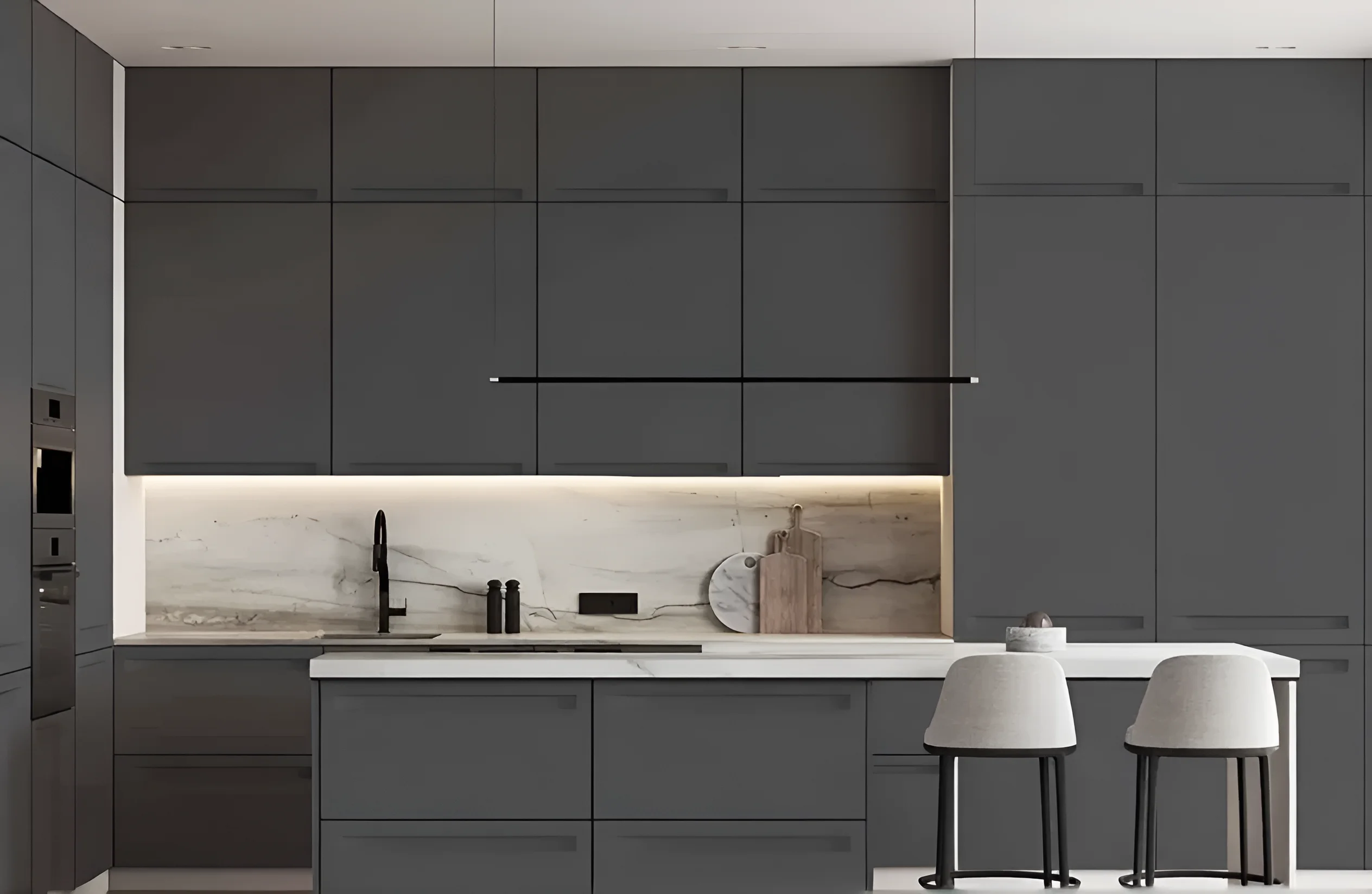 Нижние тумбы имеют стандартную глубину 450 мм, обеспечивая удобный доступ ко всему содержимому, при этом оставляя достаточно места для комфортного передвижения по кухне. Глубина столешницы также стандартная – 600 мм, что является оптимальным для размещения встроенной бытовой техники и комфортной рабочей поверхности. Серия «Альфа ручка» предполагает современное решение для открывания дверей, обеспечивающее чистые линии и минималистичный внешний вид, характерный для актуальных дизайнерских трендов.