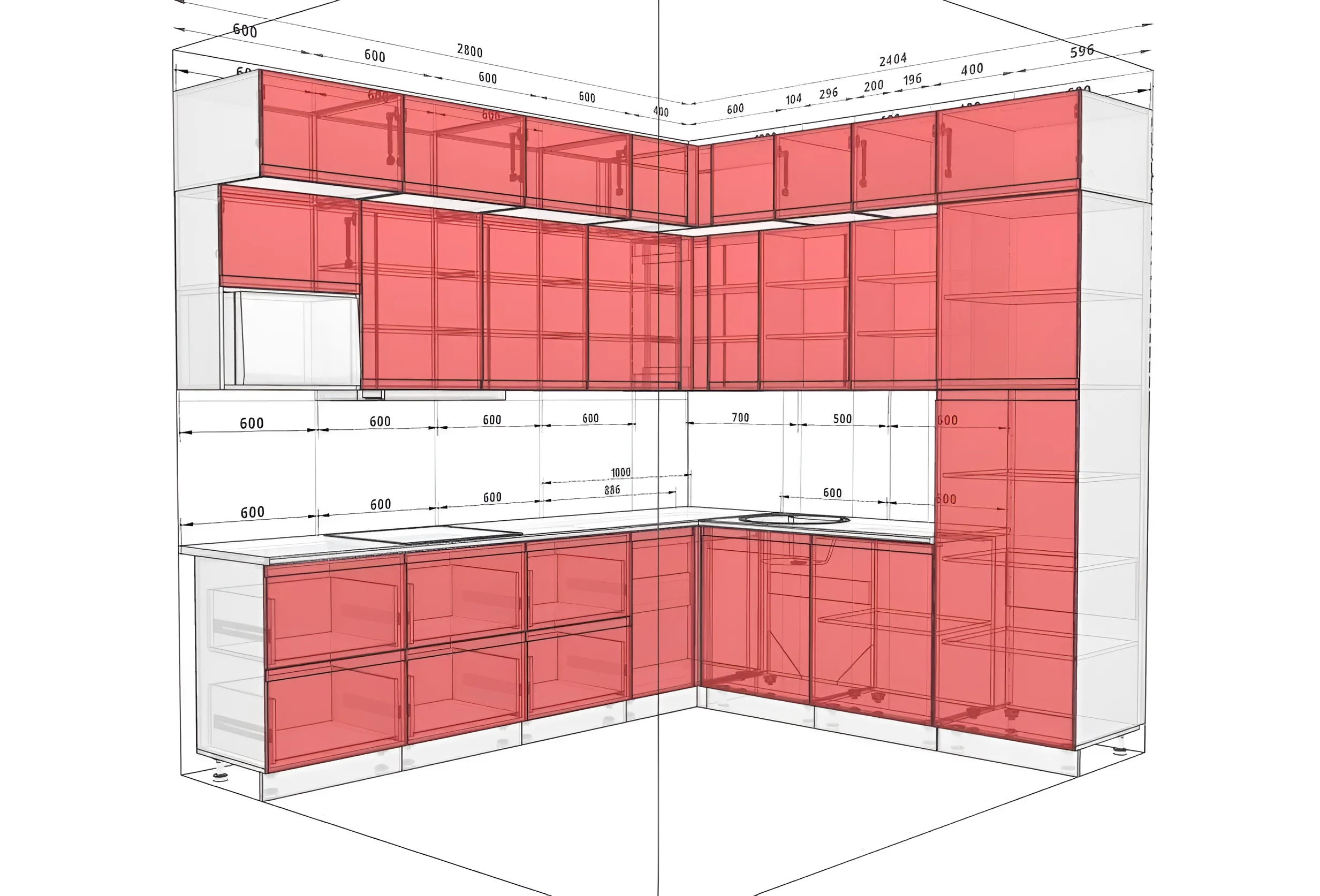 Высота кухни составляет 2,5 метра, что соответствует концепции «до потолка» и включает в себя антресоли. Это решение максимально использует вертикальное пространство, предоставляя обширные возможности для хранения посуды, утвари и прочих кухонных принадлежностей, избавляя вас от необходимости беспокоиться о недостатке места. Верхние шкафы предлагаются в двух вариантах высоты: 1080 мм и 1280 мм, что позволяет создать индивидуальную композицию, идеально соответствующую вашим потребностям и высоте потолков.