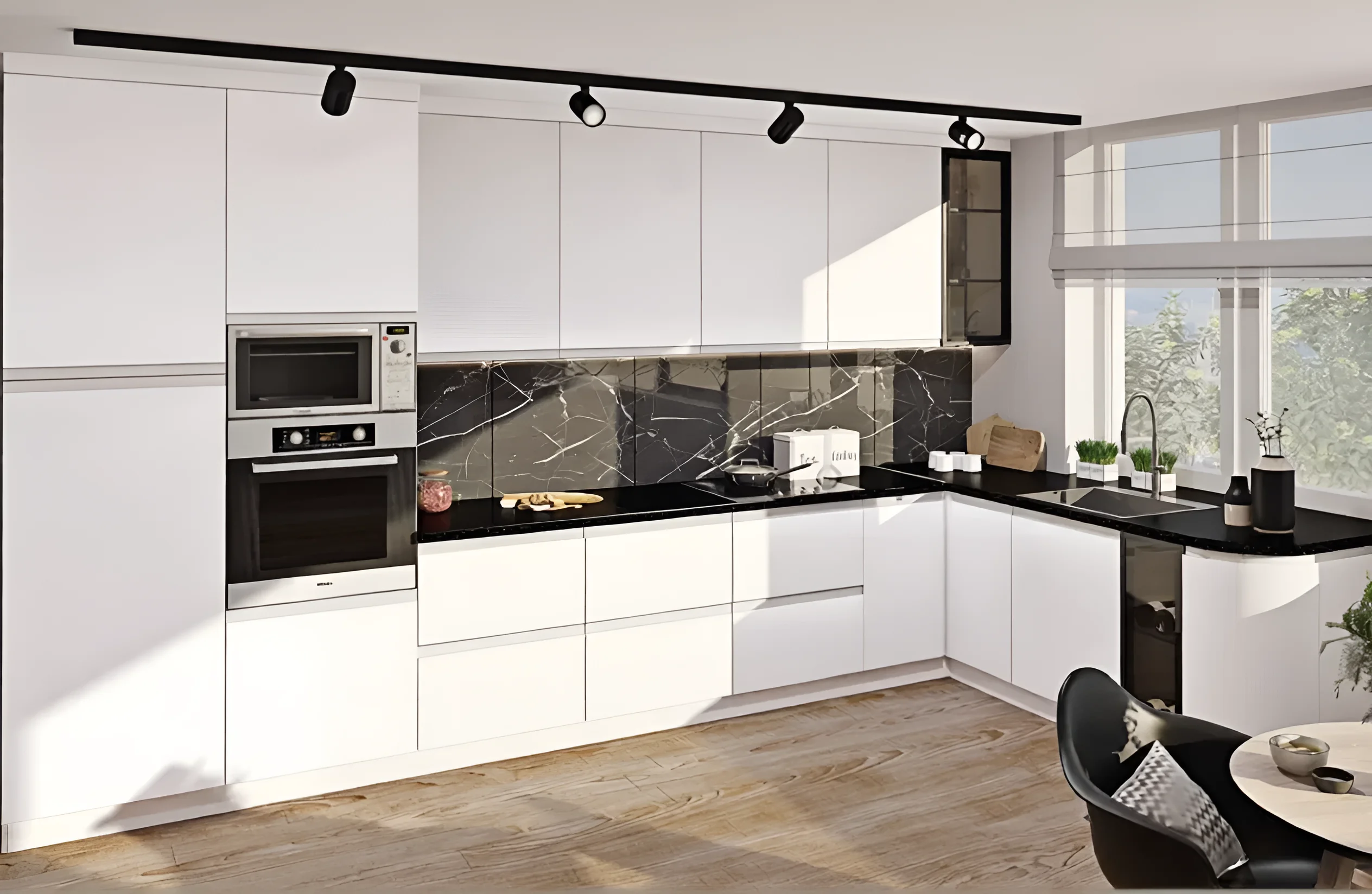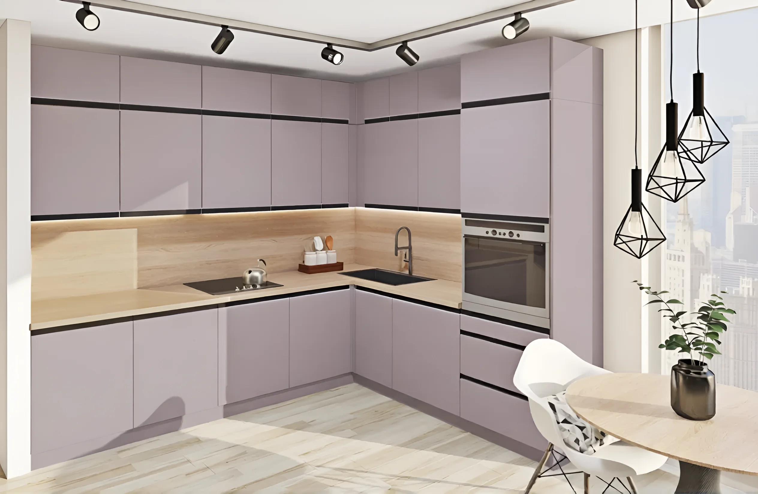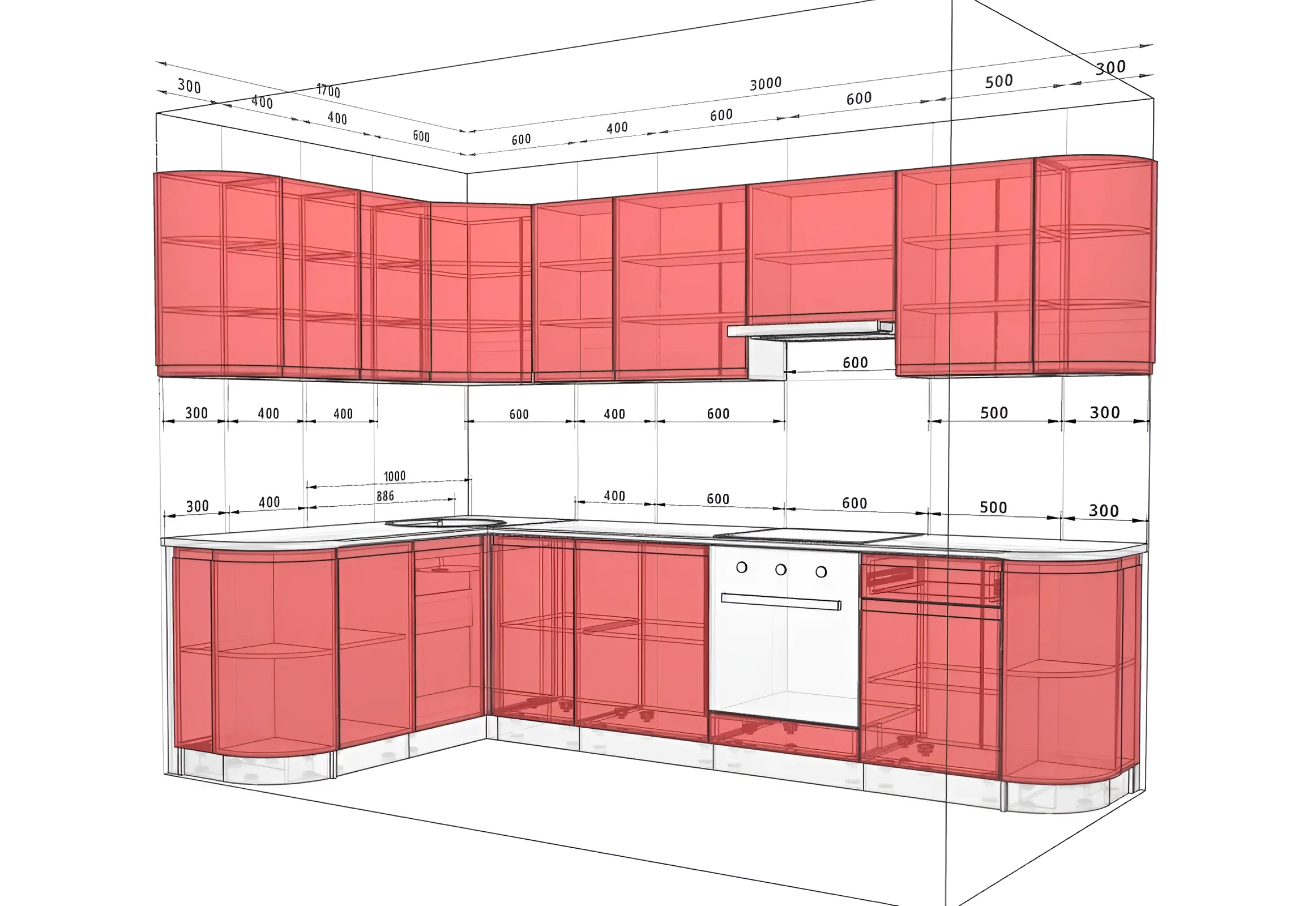 Кухня «Альфа ручка» имеет удобную угловую конфигурацию размером 3х1,7 метра, что делает ее идеальной для большинства современных планировок. Такая форма эффективно использует углы помещения, создавая максимально функциональный «рабочий треугольник» между холодильником, мойкой и плитой. Стандартная высота кухни в 2,15 метра обеспечивает комфортный доступ ко всем элементам как для высоких, так и для низких пользователей. Глубина нижних тумб составляет 450 мм, что является «стандартным» размером и позволяет удобно разместить кухонную утварь, посуду и бытовую технику, сохраняя при этом достаточно пространства для свободного перемещения по кухне. Столешница глубиной 600 мм предоставляет обширную рабочую поверхность для приготовления пищи, установки мелкой бытовой техники и проведения кулинарных экспериментов. Верхние шкафы предлагаются в двух вариантах высоты – 720 мм и 920 мм, что дает возможность выбрать оптимальное решение в зависимости от ваших потребностей в хранении и высоты потолков. Это позволяет создать индивидуальный дизайн и обеспечить максимально эффективное использование вертикального пространства.