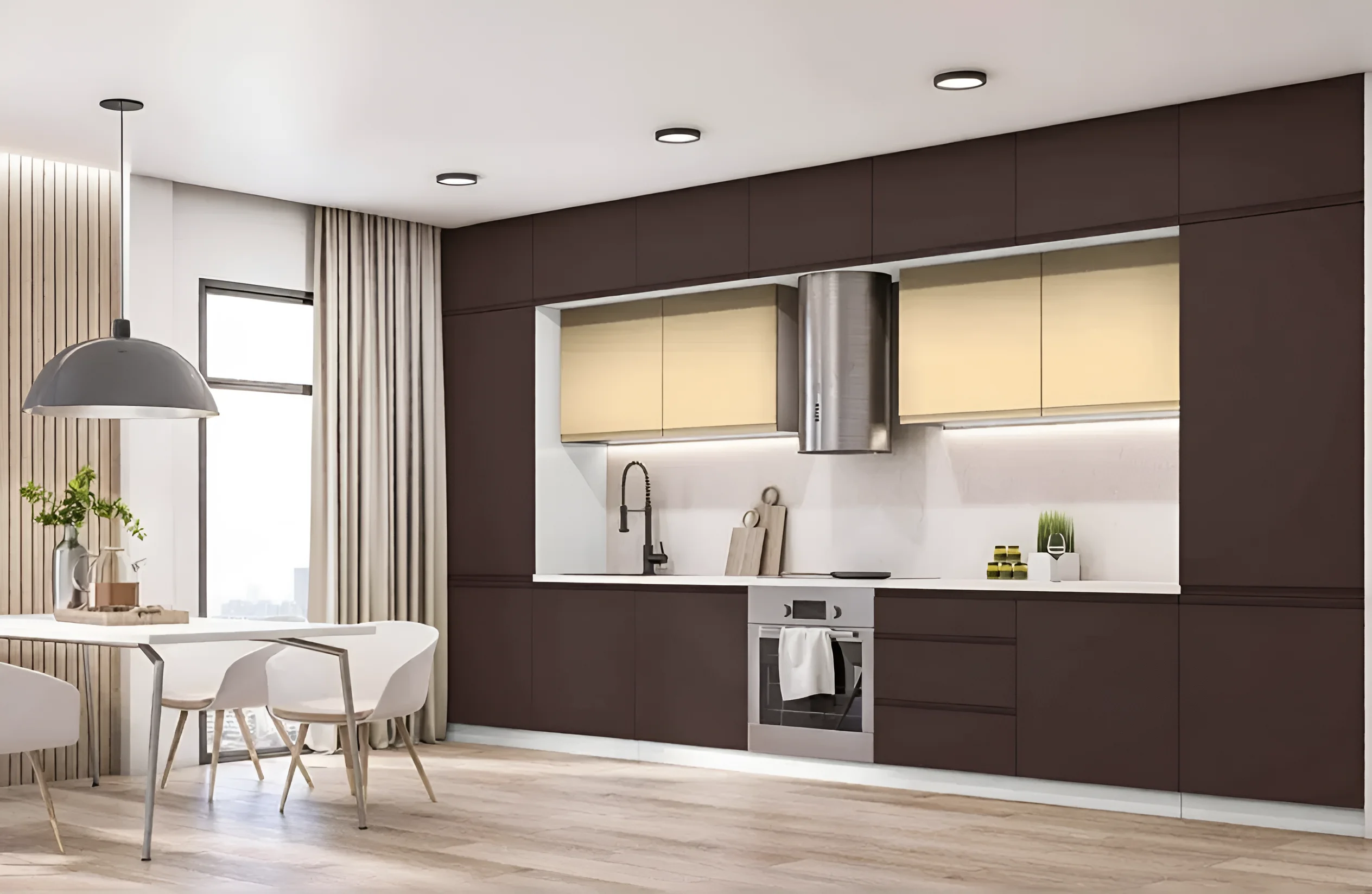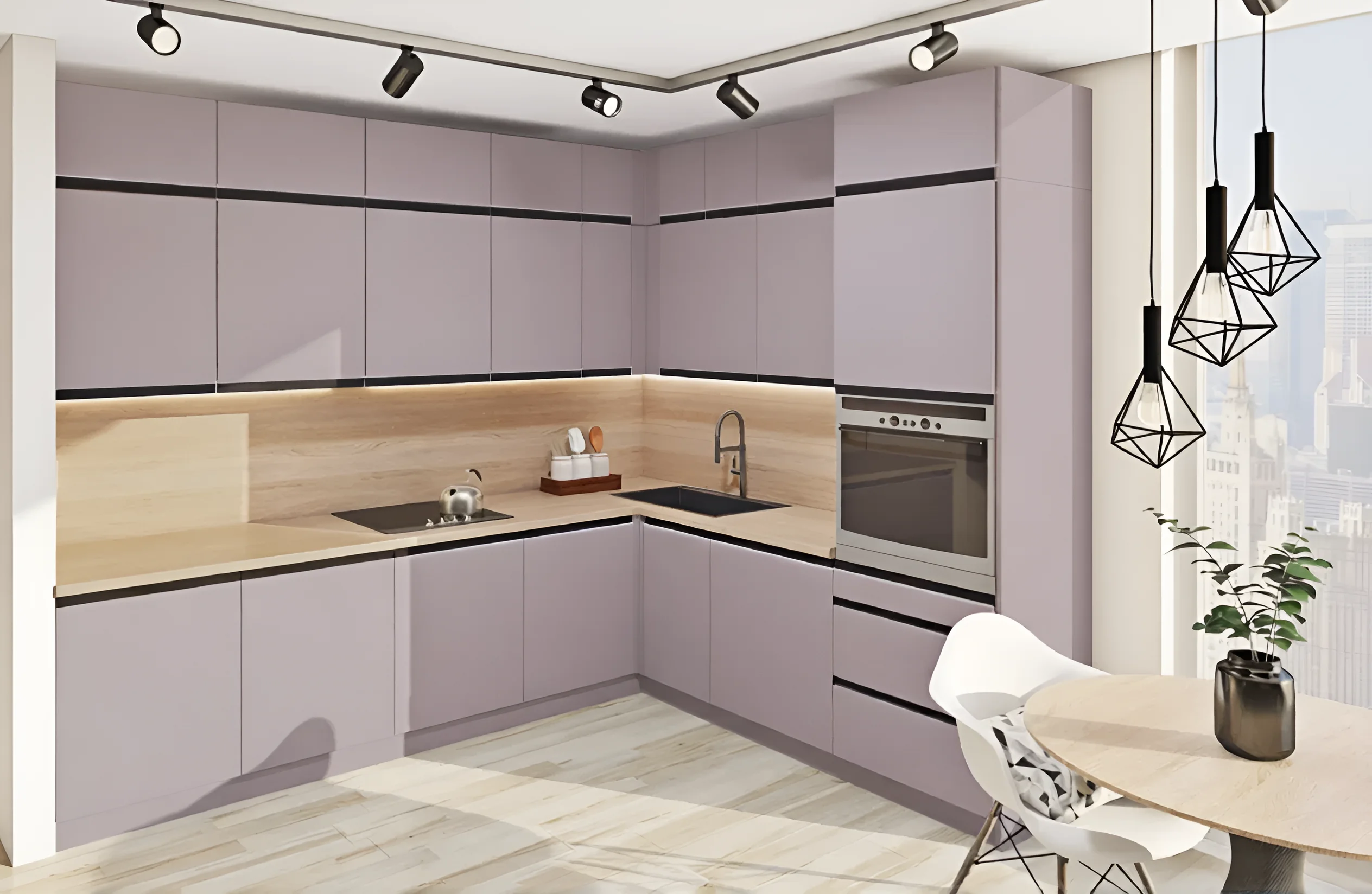 Кухня «Альфа ручка» мгновенно приковывает взгляд своим благородным и универсальным цветом «Бархат бежевый». Этот оттенок не только придает помещению теплоту и уют, но и позволяет легко интегрировать кухню в любой интерьерный стиль – от классики до минимализма. Фасады из крашеного МДФ имеют матовое покрытие, что не только выглядит современно и стильно, но и практично в уходе. Матовая поверхность менее подвержена появлению отпечатков пальцев и мелких царапин, что значительно упрощает поддержание чистоты. Серия «Альфа ручка» отличается лаконичным дизайном и интегрированными ручками, подчеркивающими чистоту линий и современный облик гарнитура. Благодаря своей угловой конфигурации (3х2.2м), эта кухня оптимально использует доступное пространство, создавая комфортную и эффективную рабочую зону.