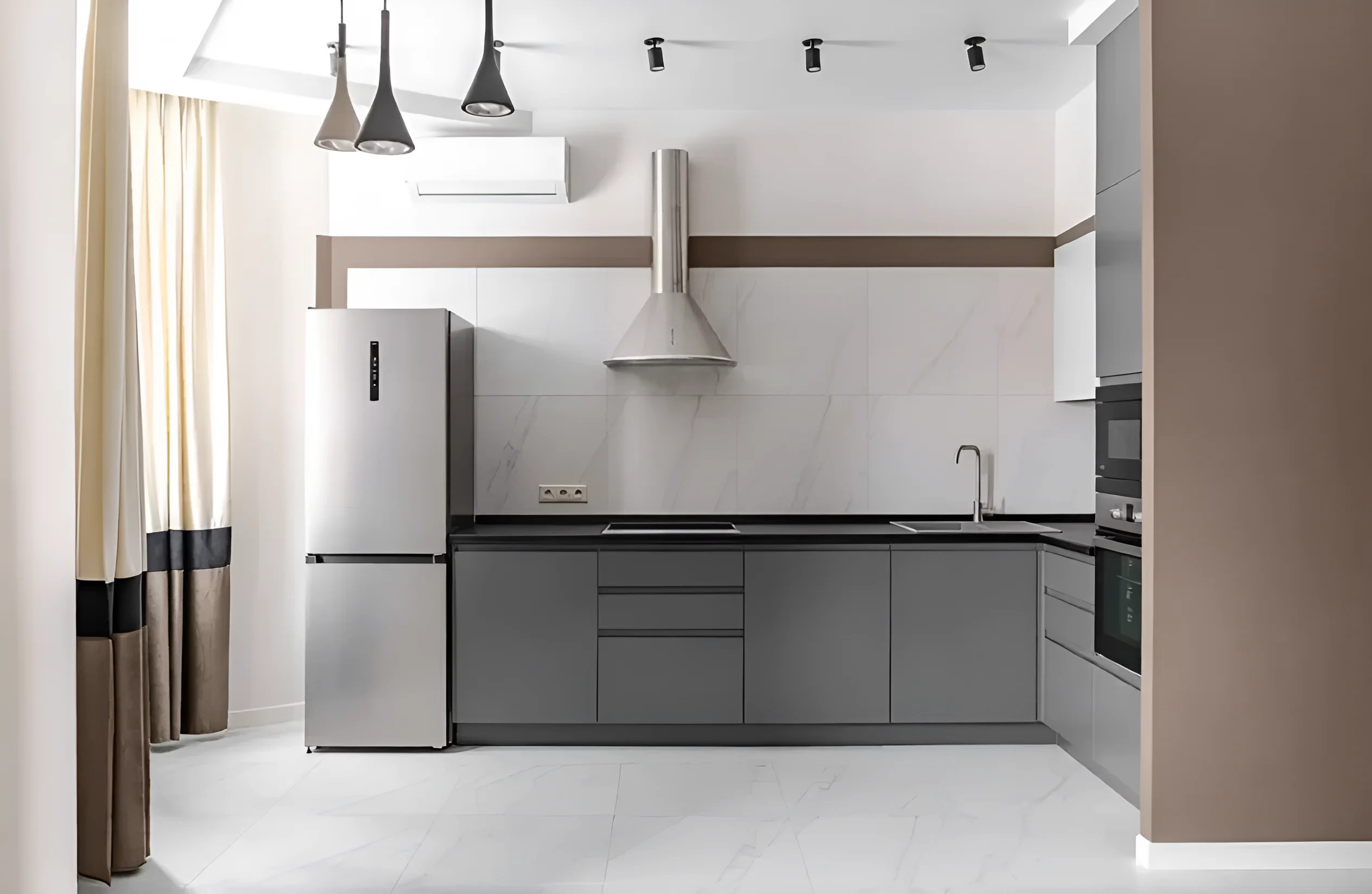 Представляем вашему вниманию элегантную и функциональную угловую кухню из серии «Альфа ручка» от MebelTops.com, которая станет настоящим сердцем вашего дома. Эта модель, выполненная в модном цвете Титан, сочетает в себе современные тенденции дизайна, безупречное качество материалов и продуманную эргономику, создавая идеальное пространство для кулинарных экспериментов и уютных семейных вечеров.
