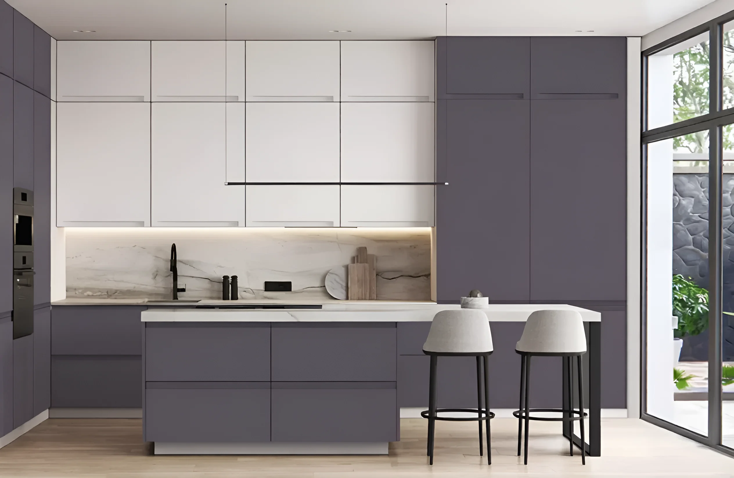 Эта модель кухни отличается уникальной высотой в 2,5 метра, что позволяет использовать пространство «до потолка». Такая конструкция с антресолями не только выглядит современно и монументально, но и предоставляет максимальное количество мест для хранения кухонных принадлежностей, редко используемой посуды или бытовой техники. Верхние шкафы представлены в двух вариантах высоты: 1080 мм и 1280 мм, что дает возможность создать интересную и динамичную композицию, а также адаптировать кухню под индивидуальные потребности, размещая в них, например, встроенную вытяжку или дополнительную подсветку.