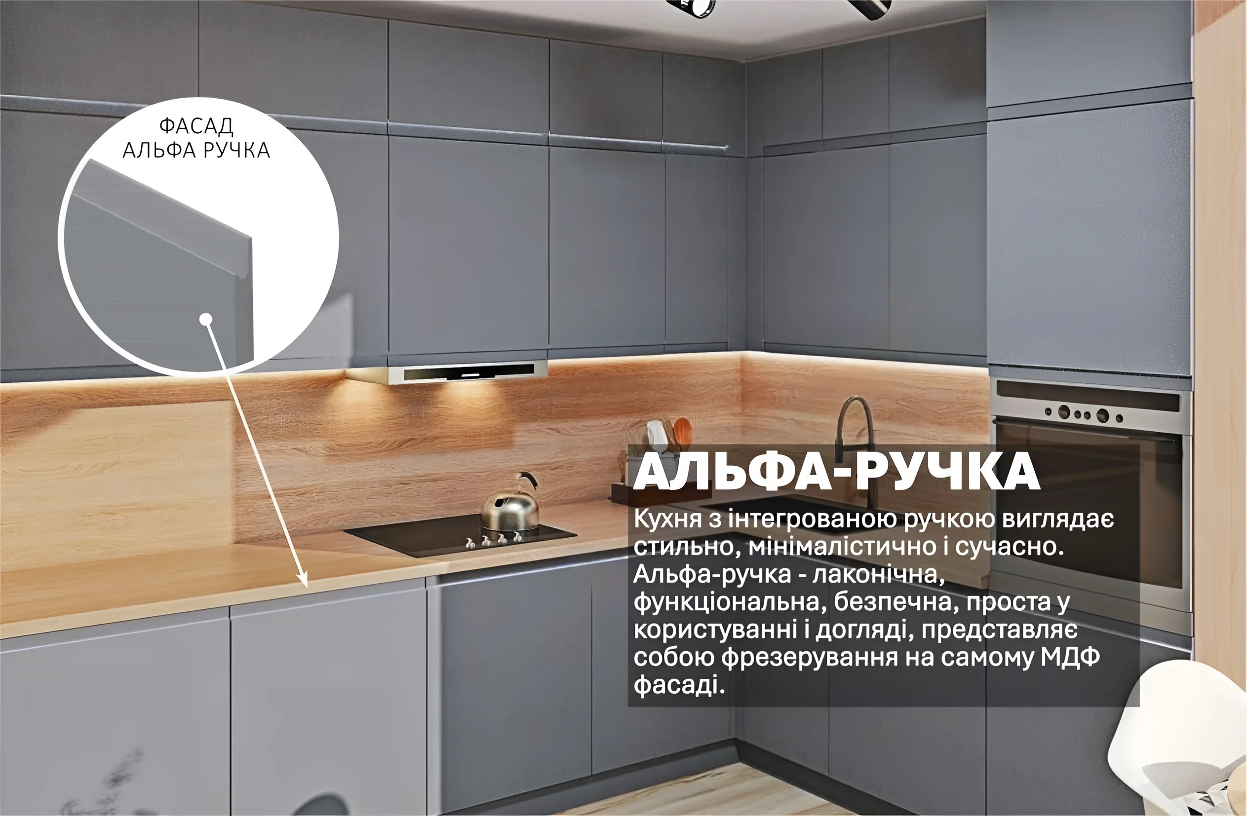 Купить Кухня «Альфа ручка» 3х2.2м угловая крашеный МДФ Титан в Украине вы можете на сайте MebelTops.com.