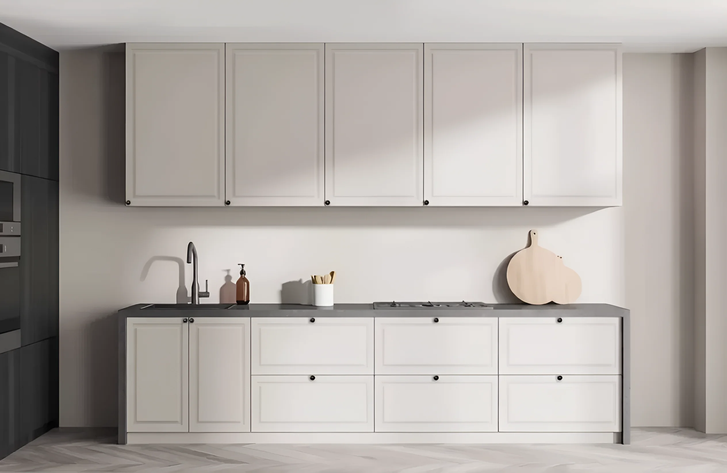 Для производства кухни «Атланта» используются только проверенные и долговечные материалы. Материал фасадов – МДФ (мелкодисперсная фракция), известный своей прочностью, влагостойкостью и экологичностью. Фасады МДФ, крашеные матовые, отличаются повышенной износостойкостью и устойчивостью к температурным перепадам, что особенно важно для кухонного пространства. Они не выцветают со временем и легко чистятся, сохраняя первоначальный вид на долгие годы.