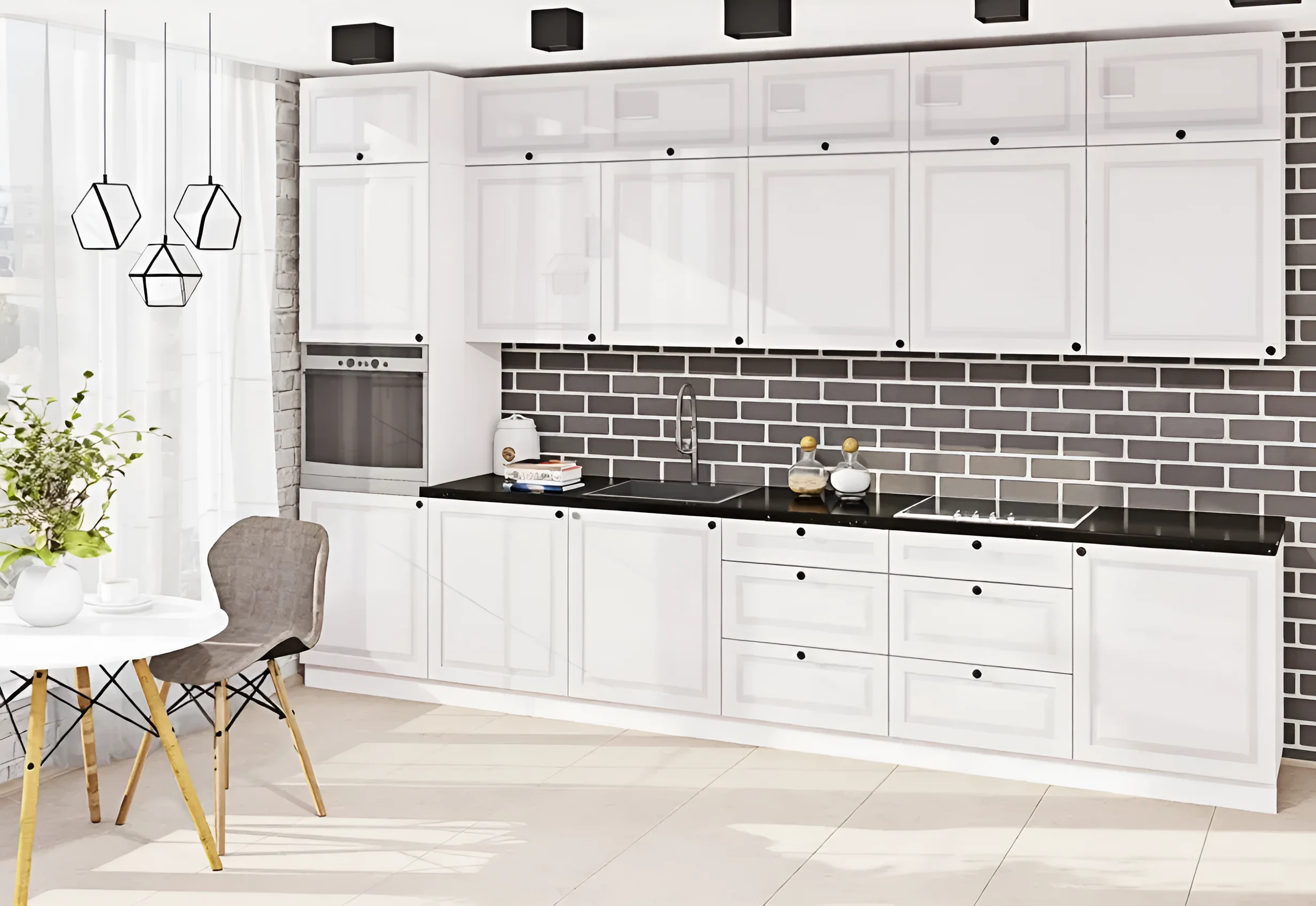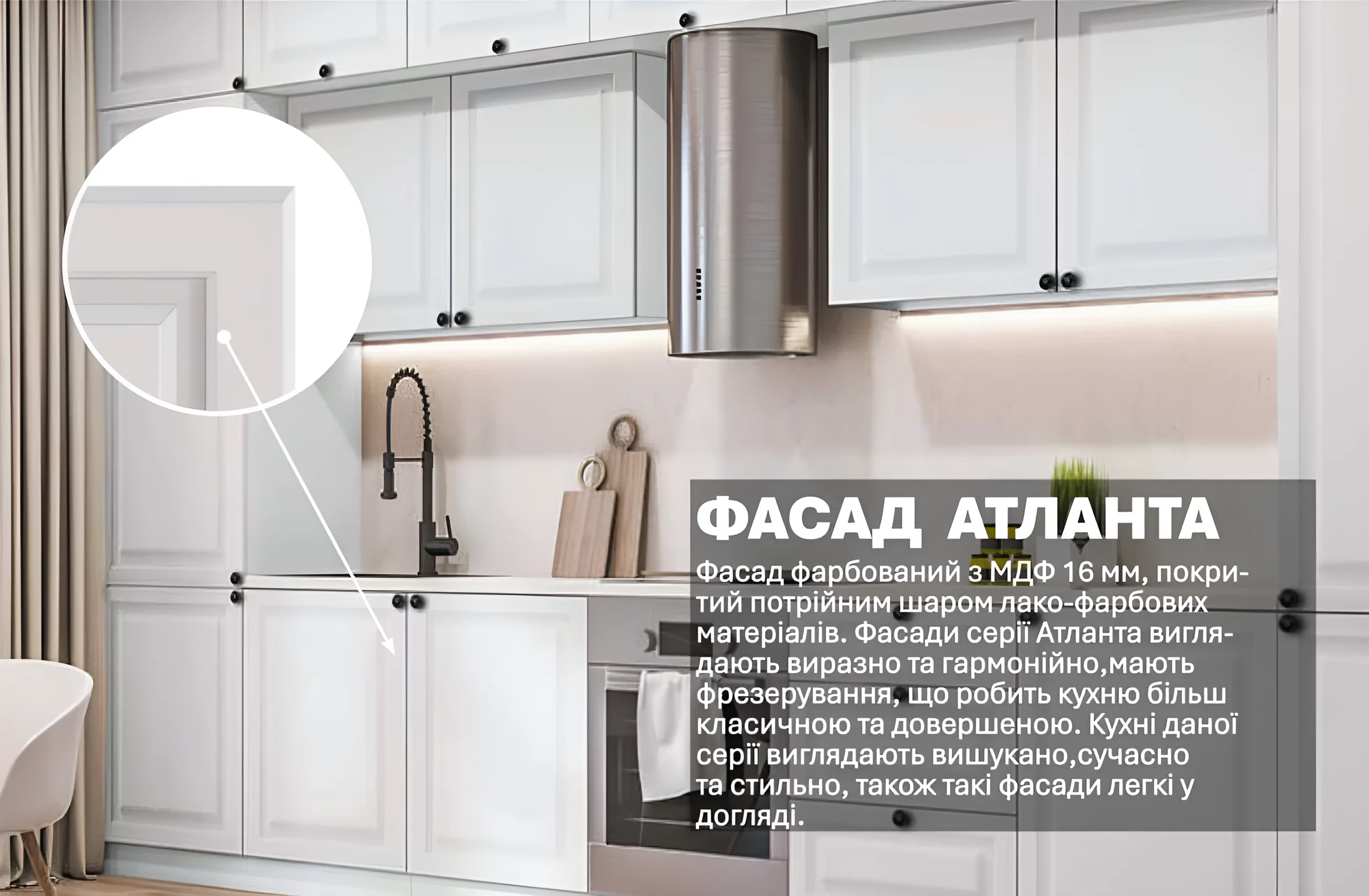 Кухня «Атланта» выполнена в классическом, но всегда актуальном белом цвете фасада, который визуально расширяет пространство, наполняет его светом и чистотой. Матовое покрытие фасадов из крашеного МДФ придает кухне особую изысканность, предотвращает появление бликов и отпечатков, что значительно облегчает уход за мебелью. Общая длина кухни составляет 4,2 метра, что делает ее универсальным решением как для просторных помещений, так и для комнат средних размеров, позволяя эффективно организовать рабочие зоны.