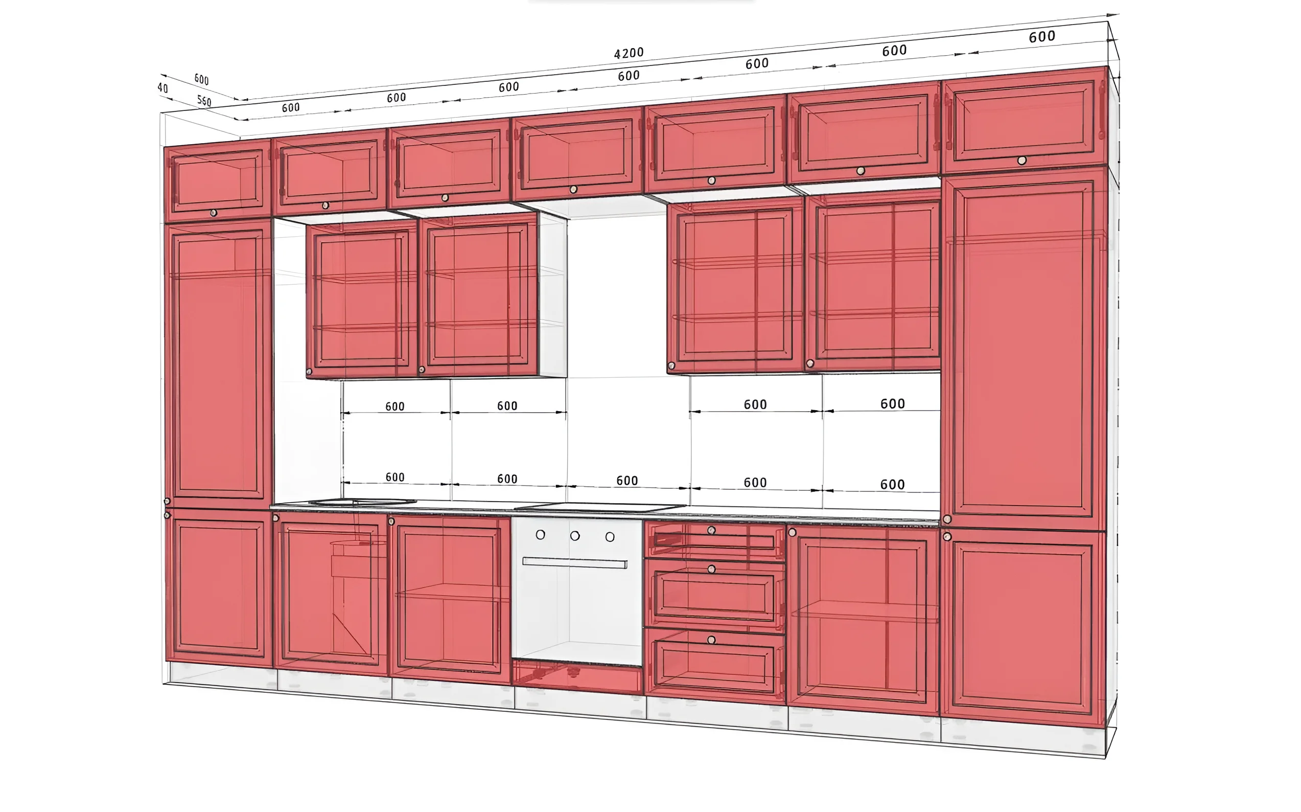 Стандартная высота кухни в 2,15 метра обеспечивает удобный доступ ко всем элементам гарнитура. Продуманная конструкция включает в себя высокие верхние шкафы, доступные в двух вариантах: 1080 мм и 1280 мм. Это предоставляет дополнительные возможности для хранения кухонной утвари, посуды и продуктов, помогая поддерживать порядок и чистоту. С такой высотой верхних модулей вы сможете максимально использовать вертикальное пространство кухни.