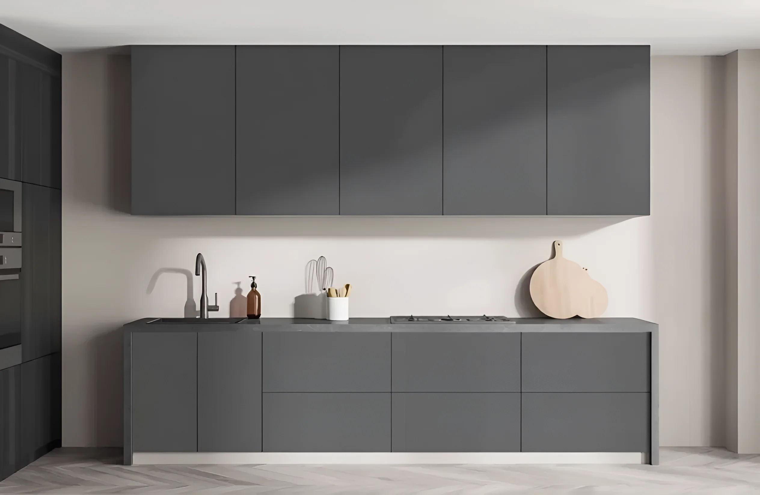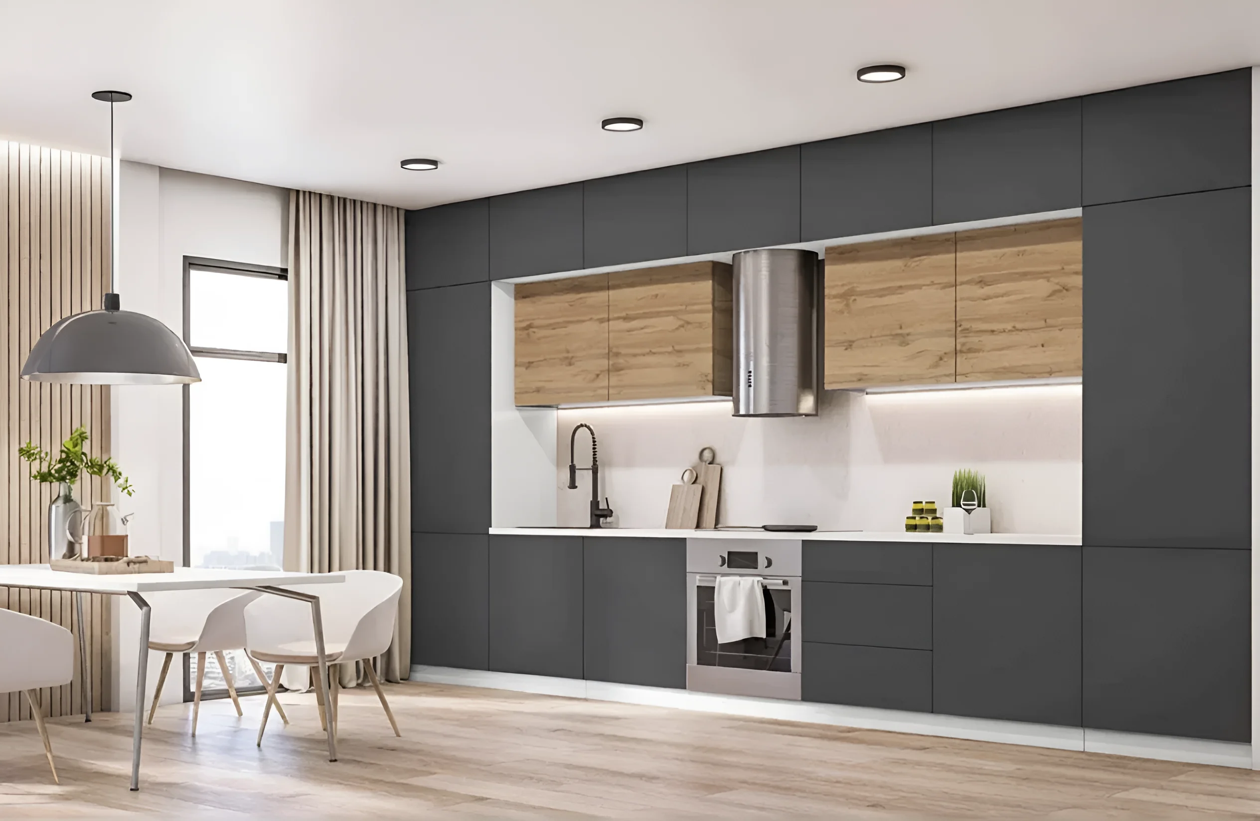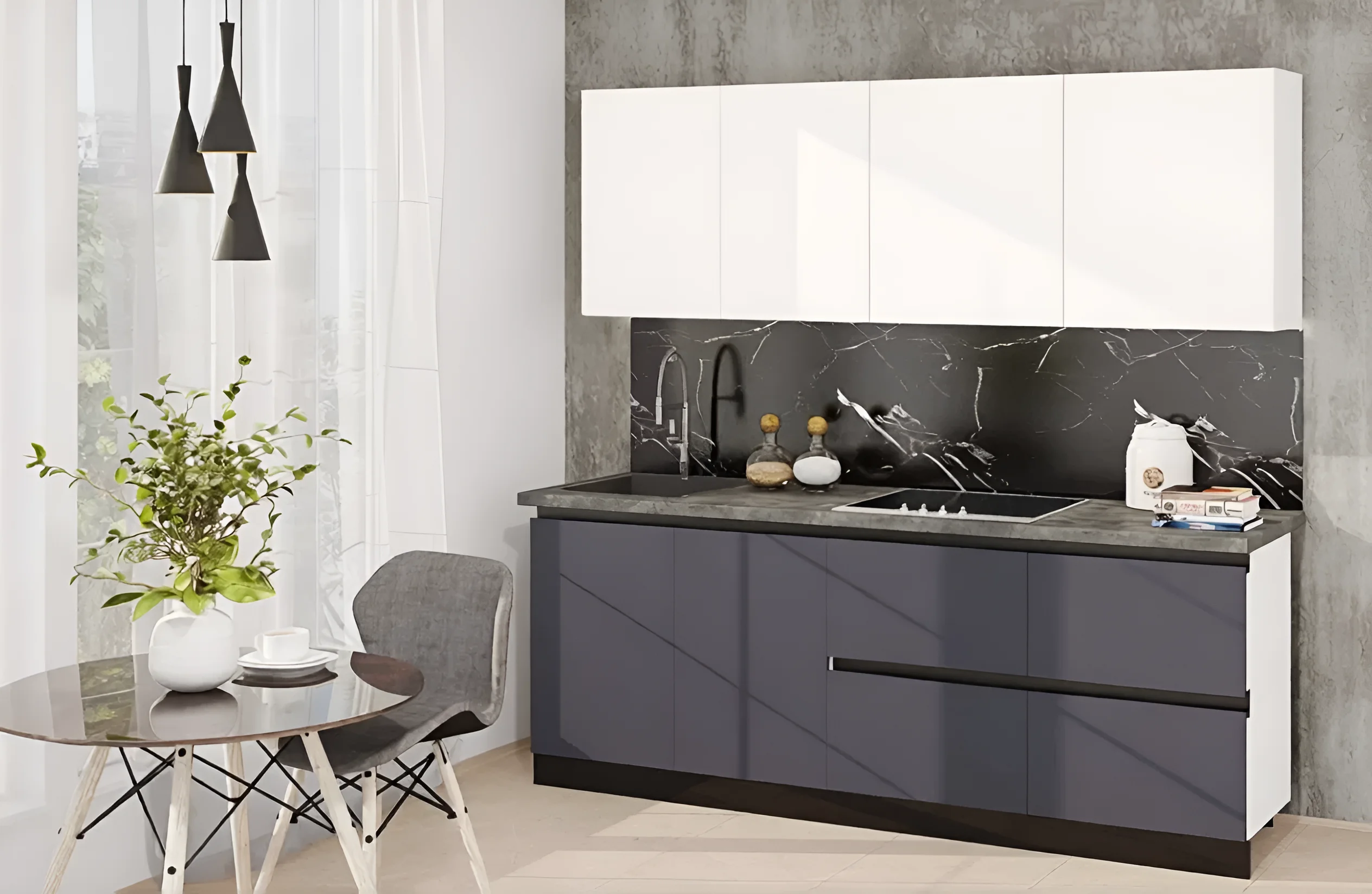 Цветовая гамма кухни «Эко» – это беспроигрышное сочетание Белого и Графита темного. Белый цвет верхних фасадов придает кухне легкость, воздушность и визуально расширяет пространство, наполняя его светом. Графит темный в нижней части создает контраст, добавляет глубины и подчеркивает современный характер интерьера. Это классическое, но в то же время очень актуальное сочетание, которое идеально вписывается в стили минимализм, хай-тек, лофт и скандинавский. Такая цветовая палитра позволяет легко подобрать сопутствующие элементы декора, бытовую технику и мебель, создавая единое и гармоничное пространство.