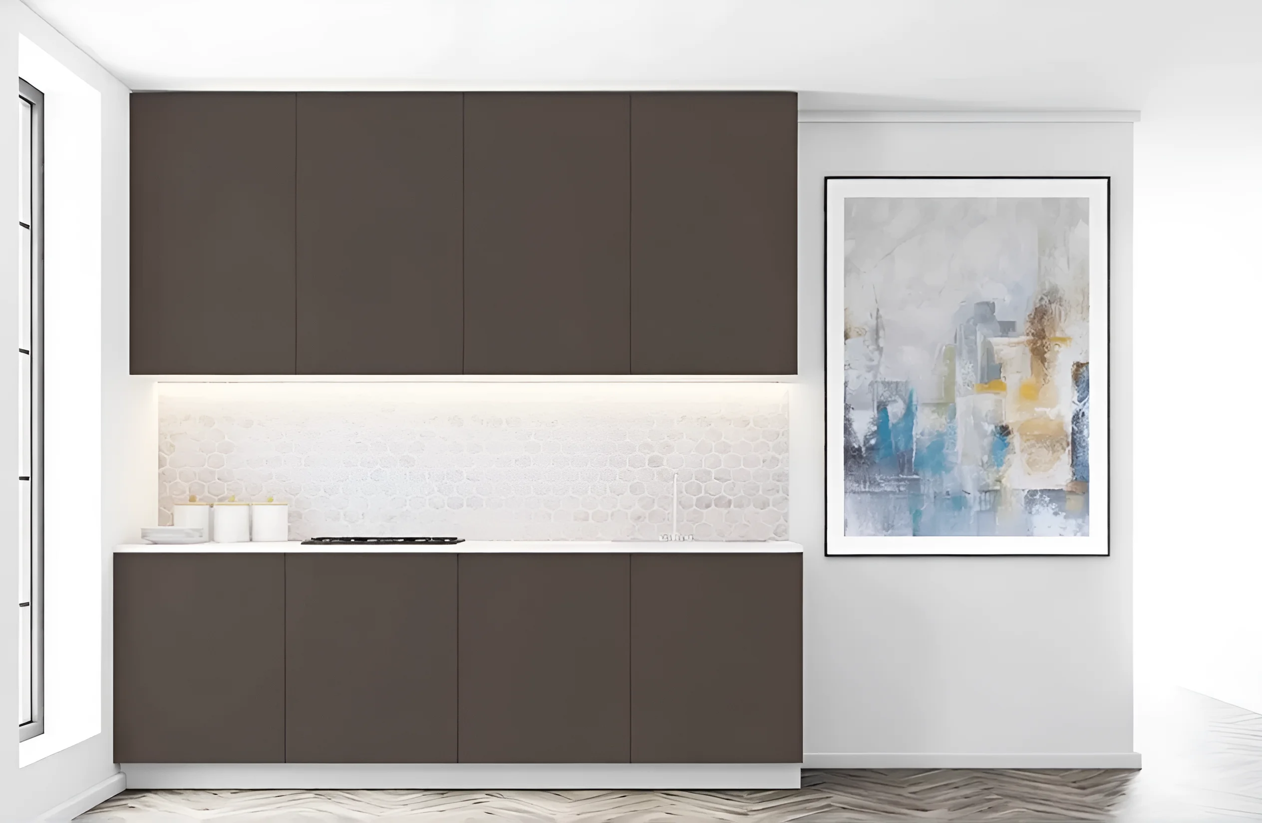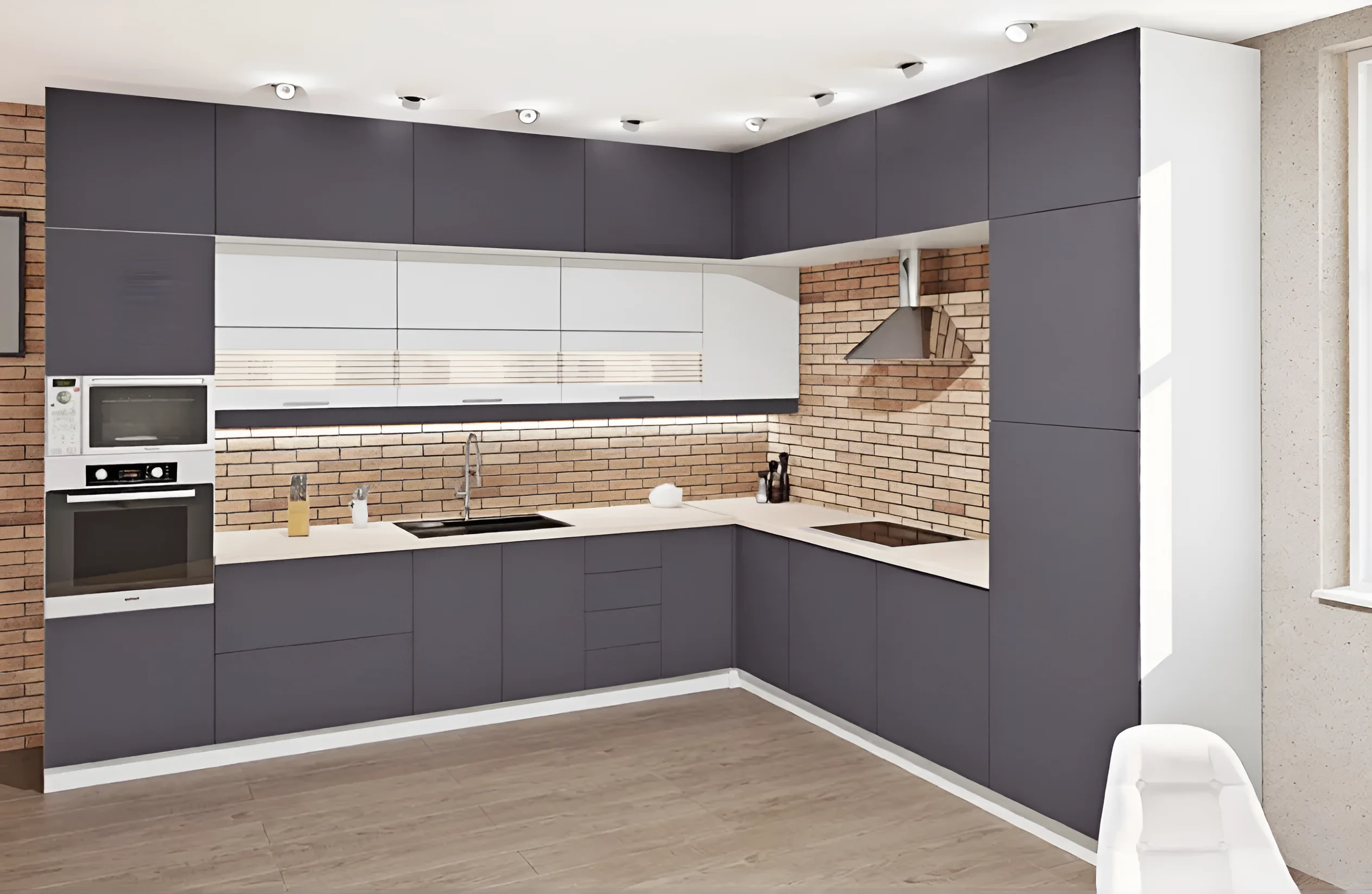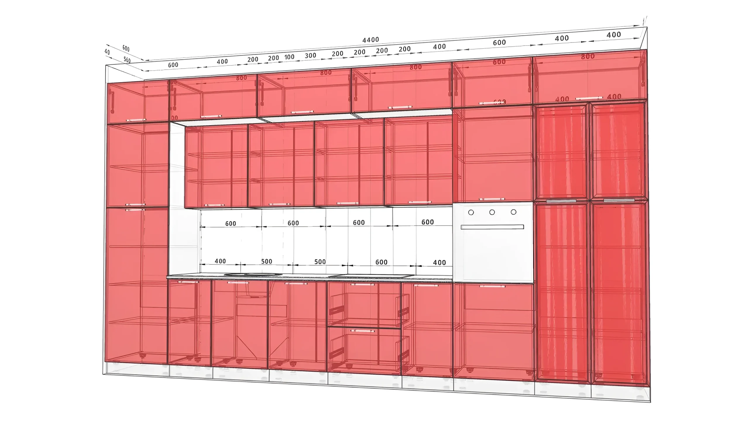 Высота кухни составляет 2.5 метра, что означает «до потолка», и включает в себя антресоли. Такое решение позволяет максимально использовать вертикальное пространство, предоставляя обширные возможности для хранения редко используемых предметов или запасов. Высота верхних шкафов представлена в двух вариантах: 1080 мм и 1280 мм, что дает возможность выбора и комбинации для создания индивидуального дизайна и удобства доступа. Стандартная глубина нижних тумб в 450 мм оптимальна для большинства кухонных принадлежностей и посуды, обеспечивая удобство использования без излишнего выступа. Глубина столешницы в 600 мм является стандартом, что позволяет легко интегрировать в нее большинство видов встраиваемой бытовой техники, а также предоставляет достаточно места для комфортной работы.