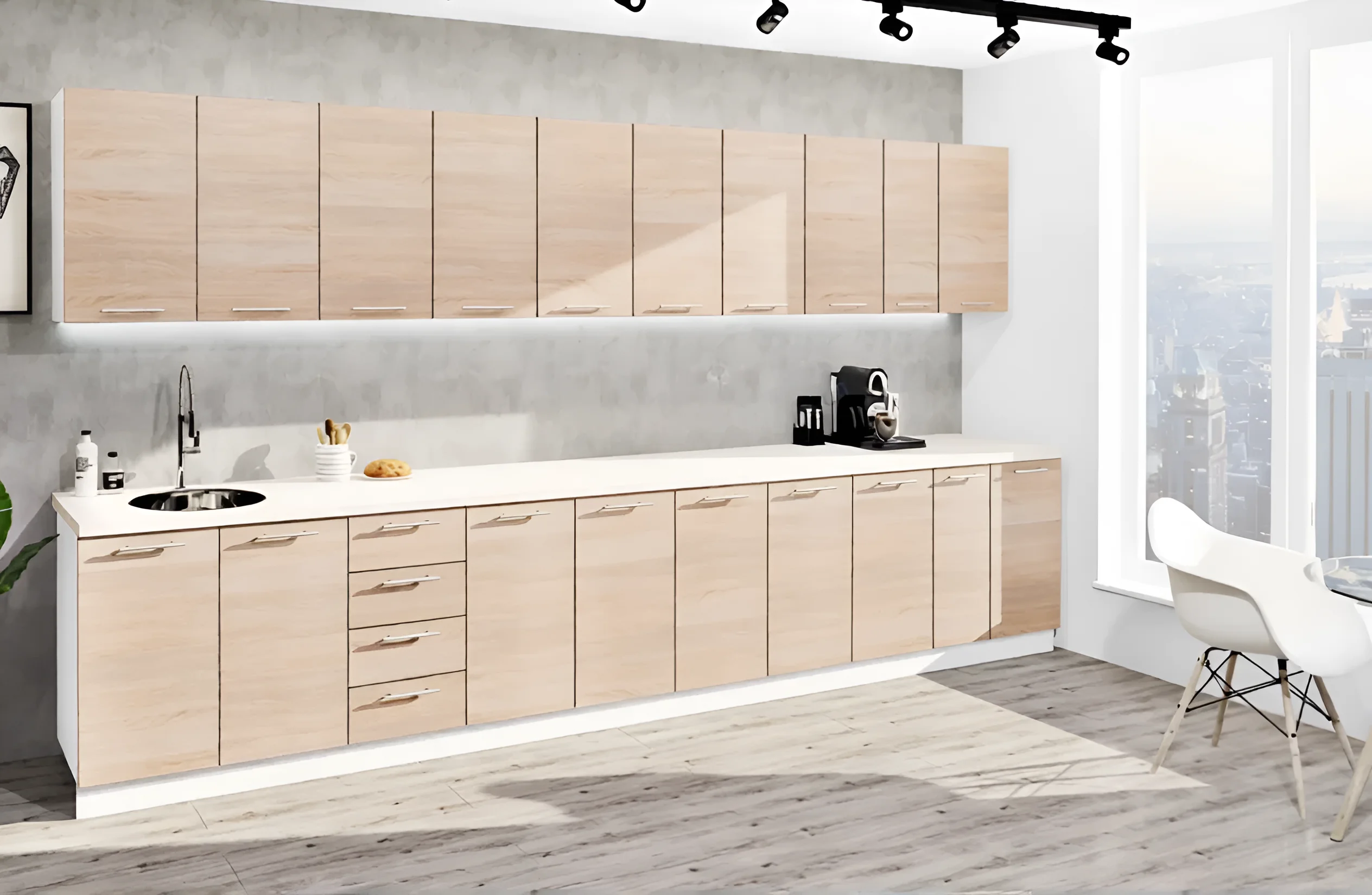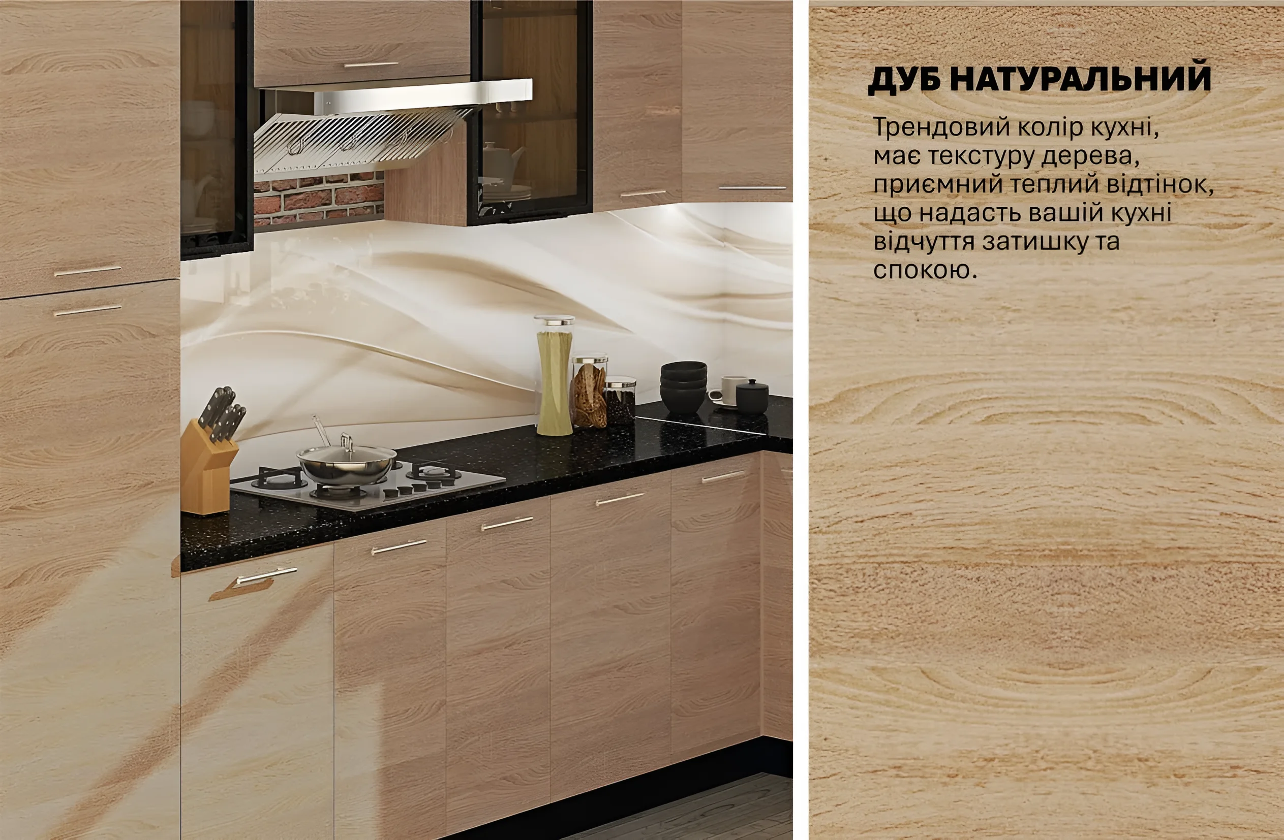 В производстве кухни «Эко» используются только проверенные и надежные материалы, гарантирующие долгий срок службы и неизменный внешний вид. Корпус кухни выполнен из высококачественной ДСП, известной своей прочностью и устойчивостью к деформации. Фасады кухни представляют собой стильное сочетание МДФ рамки и ламинированной ДСП вставки. Такое решение не только придает мебели современный и изысканный вид, но и обеспечивает повышенную износостойкость. Ламинированное покрытие защищает фасады от влаги, перепадов температур и механических повреждений, что особенно важно для кухонного пространства. Цвет «Дуб сонома» – это светлый, теплый оттенок, который легко сочетается с различными стилями интерьера, от скандинавского минимализма до классики. Он визуально расширяет пространство и наполняет его светом.