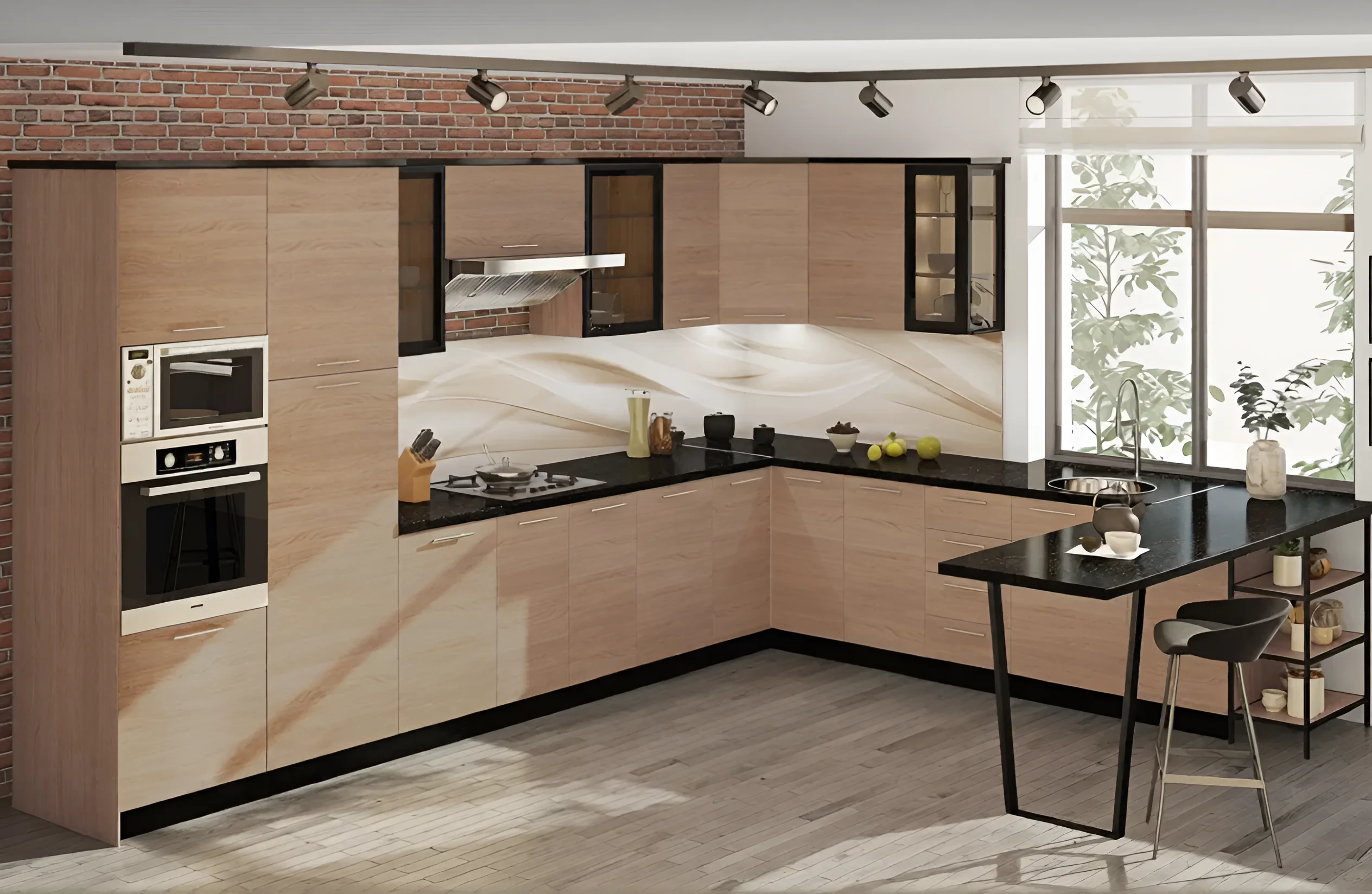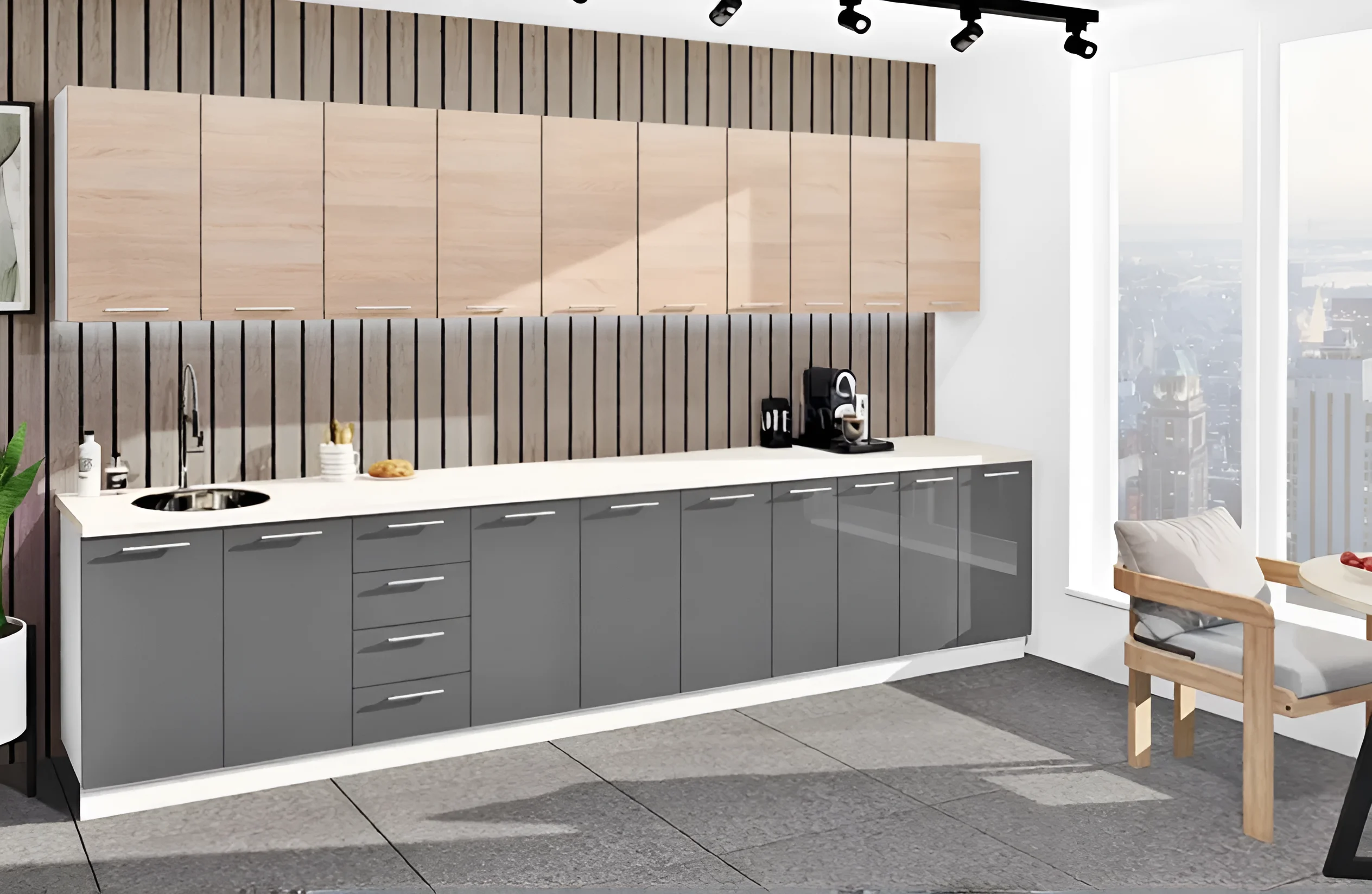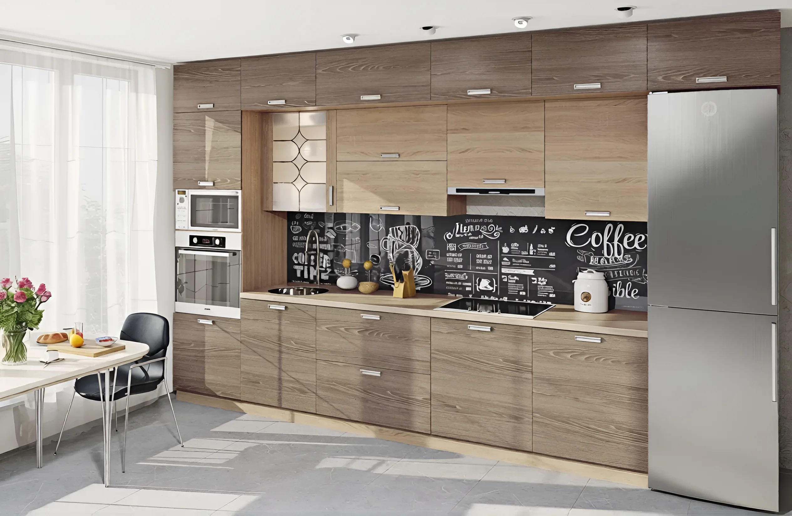 Кухня «Эко» разработана с учетом потребностей самых требовательных пользователей. Ее общие габариты 4000 х 3000 мм позволяют создать вместительное и удобное рабочее пространство. Это может быть как длинная, функциональная прямая кухня, идеально подходящая для вытянутых помещений, так и элегантная П-образная композиция, максимально использующая углы и создающая эргономичный «рабочий треугольник». Высота кухни составляет стандартные 2,15 метра, что обеспечивает удобный доступ ко всем элементам и гармонично вписывается в большинство современных интерьеров. Гибкость планировки – одно из ключевых преимуществ этой модели. Вы сможете адаптировать расположение модулей под особенности вашей планировки, будь то открытое студийное пространство или классическое закрытое кухонное помещение.