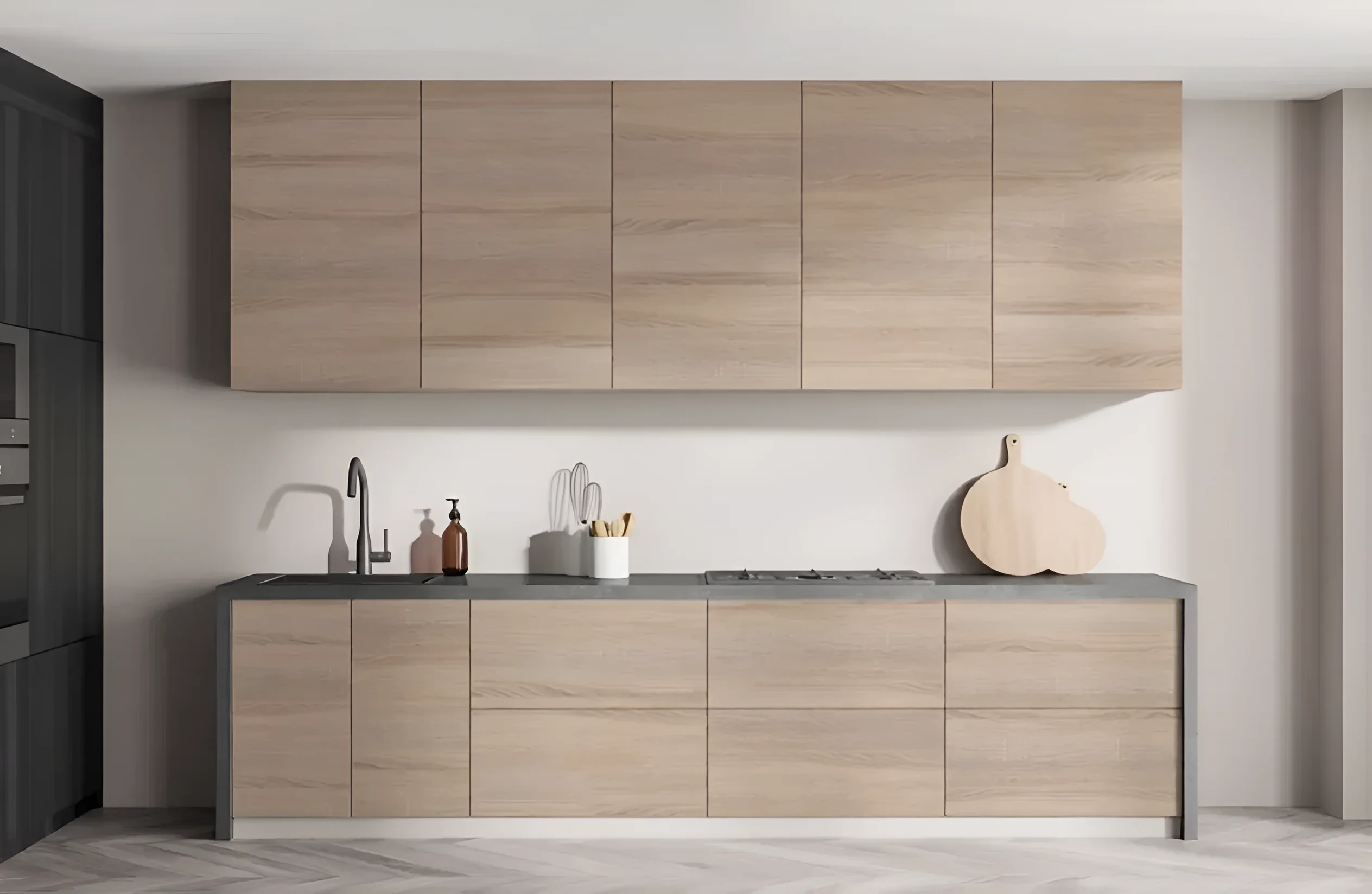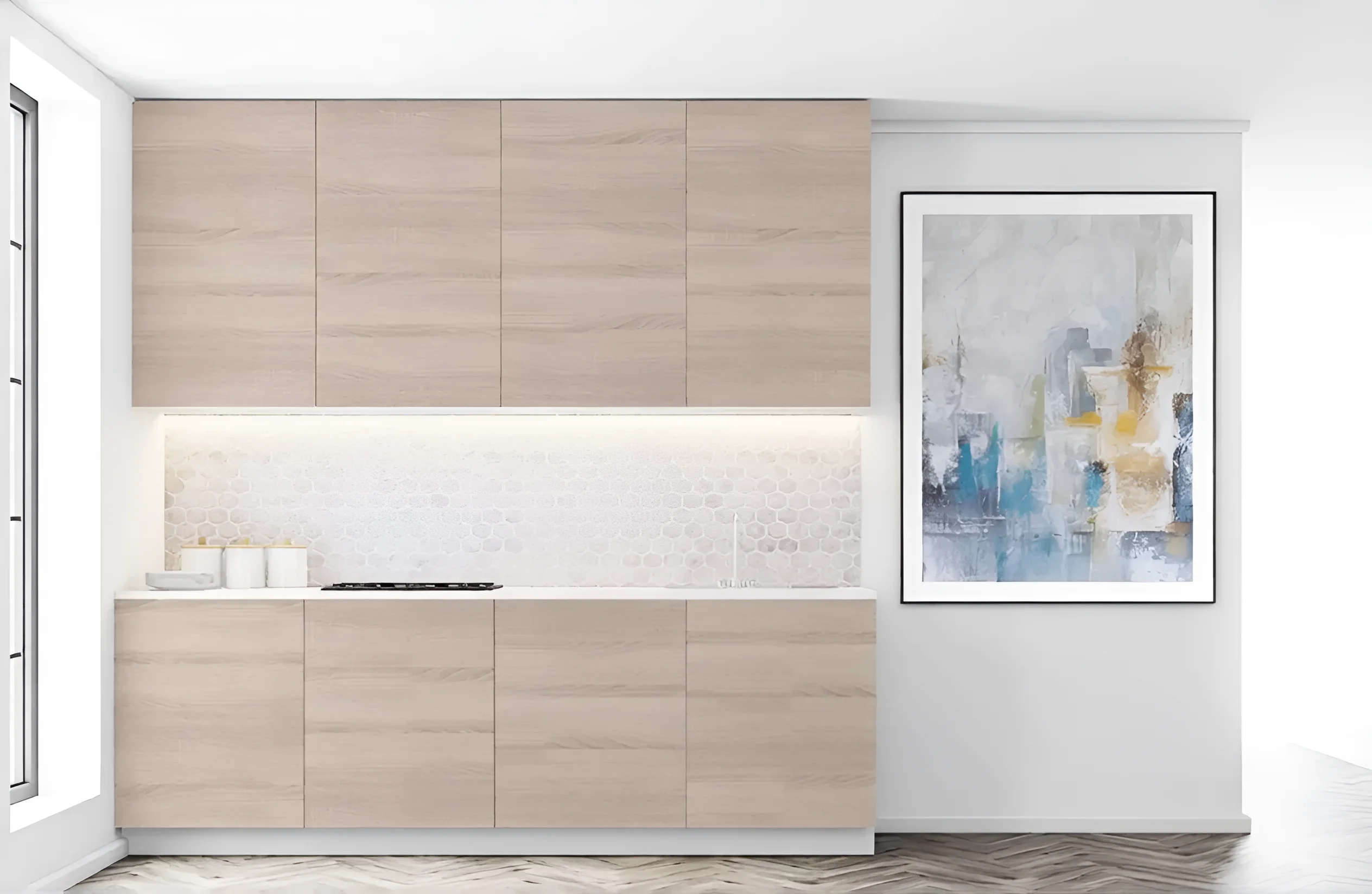 Каждый элемент кухни «Эко» спроектирован для максимального удобства. Глубина нижних тумб составляет 450 мм, что является «стандартным» и оптимальным решением для размещения крупной кухонной утвари, посуды и бытовой техники. При этом глубина столешницы – 600 мм – обеспечивает достаточно места для комфортной готовки, размещения мелкой бытовой техники и свободной работы. Верхние шкафы предлагаются в двух вариантах высоты: 720 мм и 920 мм. Это позволяет не только использовать вертикальное пространство максимально эффективно, но и создать индивидуальный дизайн, комбинируя шкафы разной высоты. Более высокие шкафы идеально подходят для хранения редко используемых предметов, а также для создания эффекта «парящей» кухни, если расположить их по всей длине. Продуманная внутренняя организация шкафов и ящиков позволит вам поддерживать идеальный порядок.
