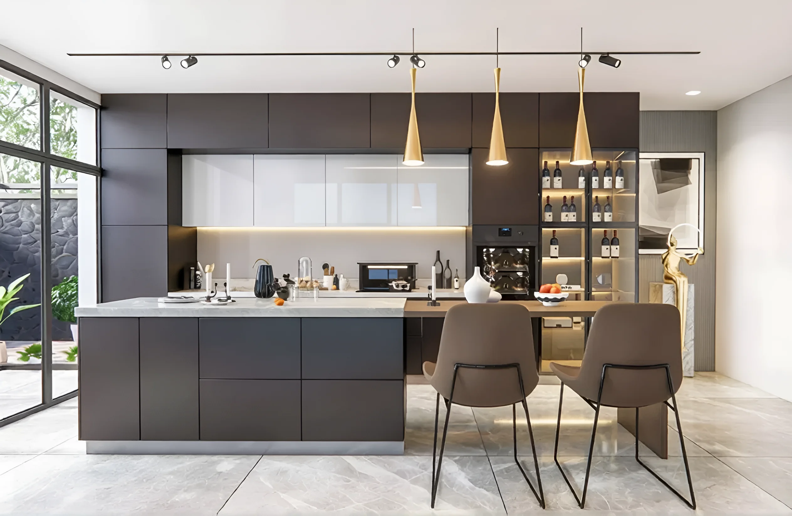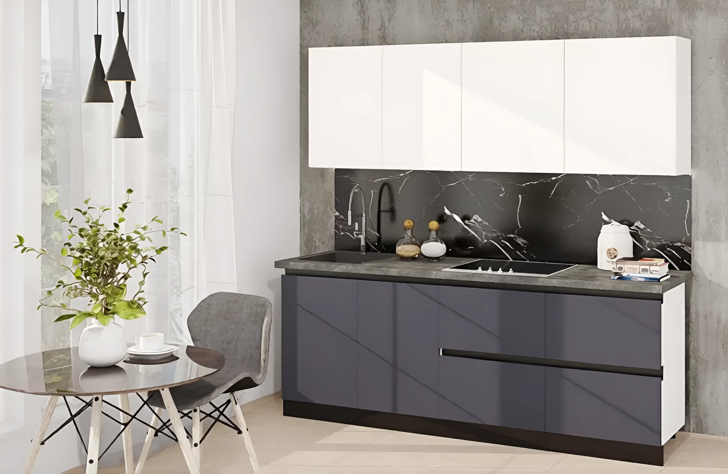 Кухня «Эко» длиной 4,5 метра предлагает прямую планировку, идеально подходящую для просторных помещений. Ее дизайн, выполненный в трендовой комбинации белого и угольного камня, легко интегрируется в различные стили интерьера – от минимализма до лофта. Фасады, изготовленные из ДСП с МДФ рамкой и ламинированной вставкой, обладают не только привлекательным внешним видом, но и высокой устойчивостью к повседневному износу, влаге и температурным перепадам. Серия «Эко» подчеркивает стремление к созданию практичных, но в то же время стильных и долговечных решений для вашего дома. Дополнительным акцентом является кухонный остров, который значительно расширяет функциональные возможности кухни, предоставляя дополнительное место для приготовления пищи, хранения утвари или организации уютной обеденной зоны.