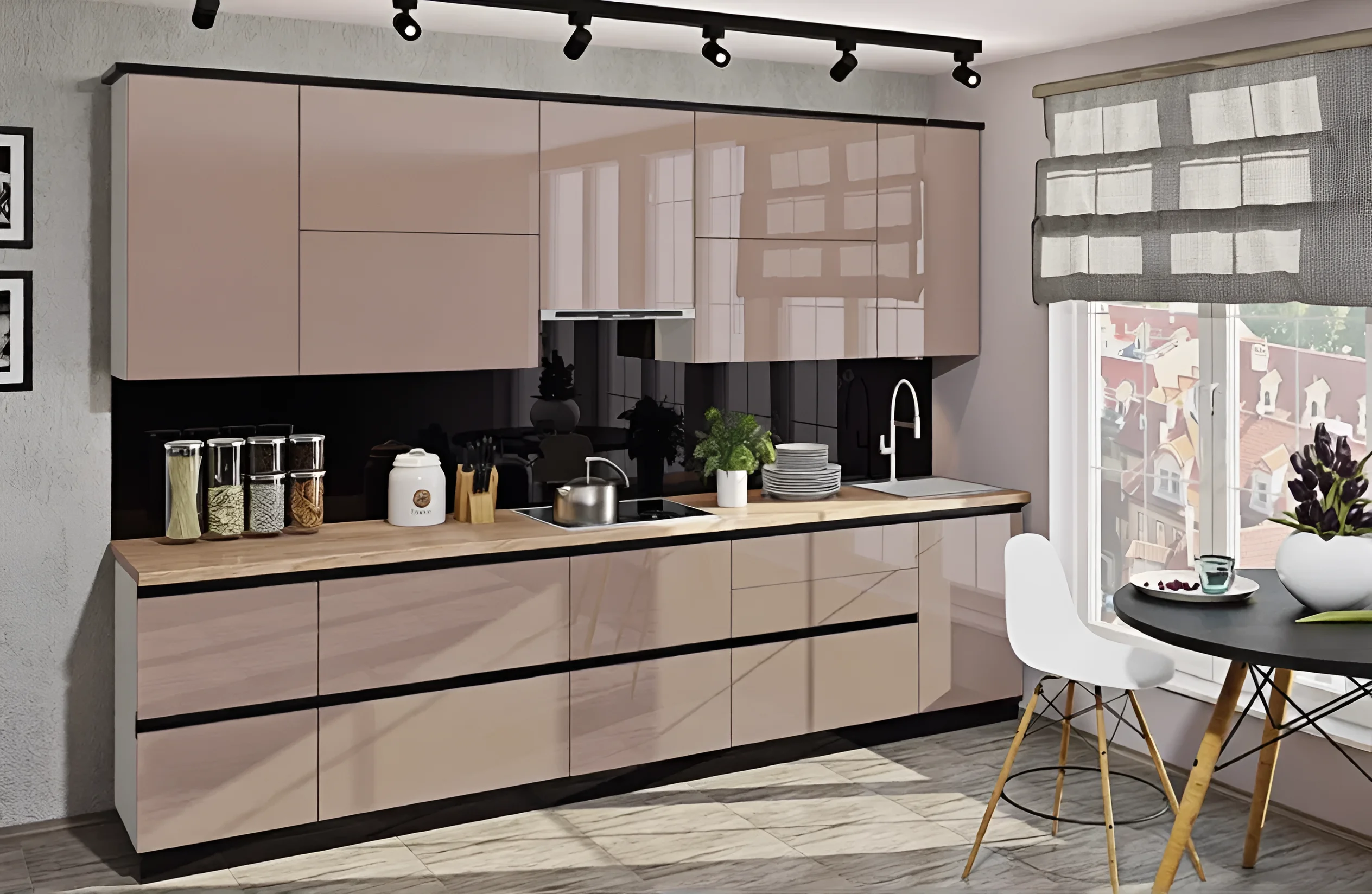 Высота этой кухни составляет 2,5 метра, что соответствует концепции «до потолка». Такое решение с антресолями позволяет максимально эффективно использовать вертикальное пространство, предоставляя огромное количество мест для хранения. Вы сможете разместить всю необходимую кухонную утварь, посуду и бытовую технику, избегая беспорядка и поддерживая идеальный порядок.