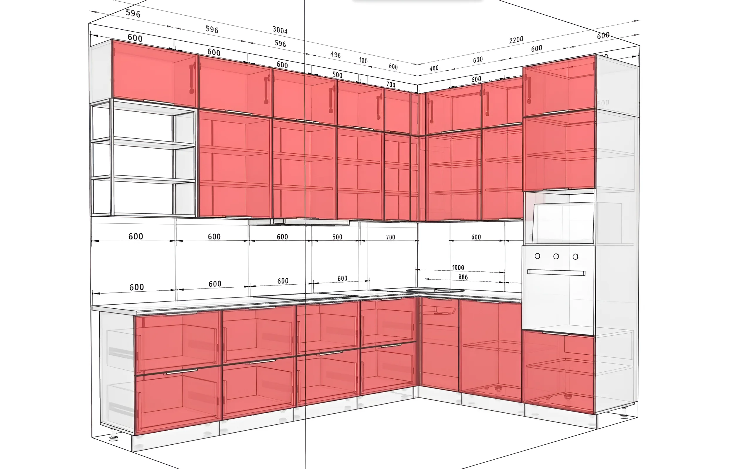 - Высота верхних шкафов: В этой модели предусмотрены верхние шкафы двух стандартных высот – 1080 мм и 1280 мм. Это позволяет создать разнообразные композиции и адаптировать хранение под различные предметы, от высоких бокалов до мелкой кухонной утвари.