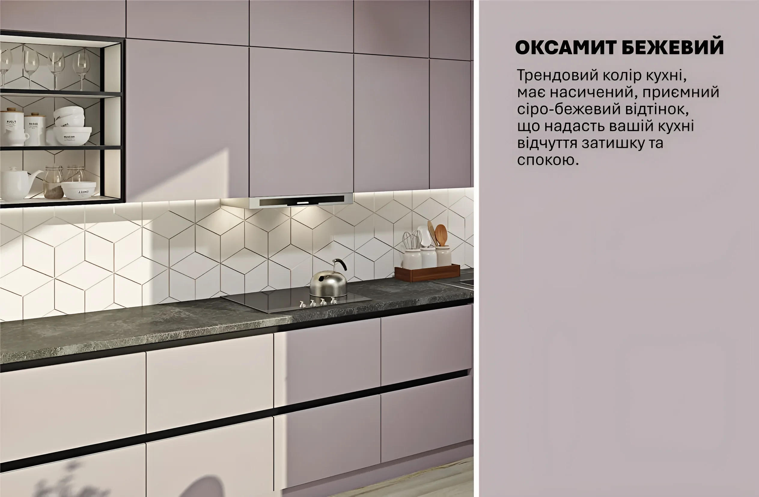 Особое внимание привлекают фасады, выполненные из крашеного матового МДФ. Материал МДФ известен своей прочностью, долговечностью и устойчивостью к влаге и температурным перепадам, что критически важно для кухонной мебели. Матовое покрытие «Бархат бежевый» (изначально «Оксамит бежевый») не только выглядит очень элегантно и современно, но и практично в уходе, так как на нем менее заметны отпечатки пальцев и небольшие загрязнения. Этот теплый, нейтральный оттенок бежевого создает ощущение легкости и простора, прекрасно сочетается с различными элементами декора.