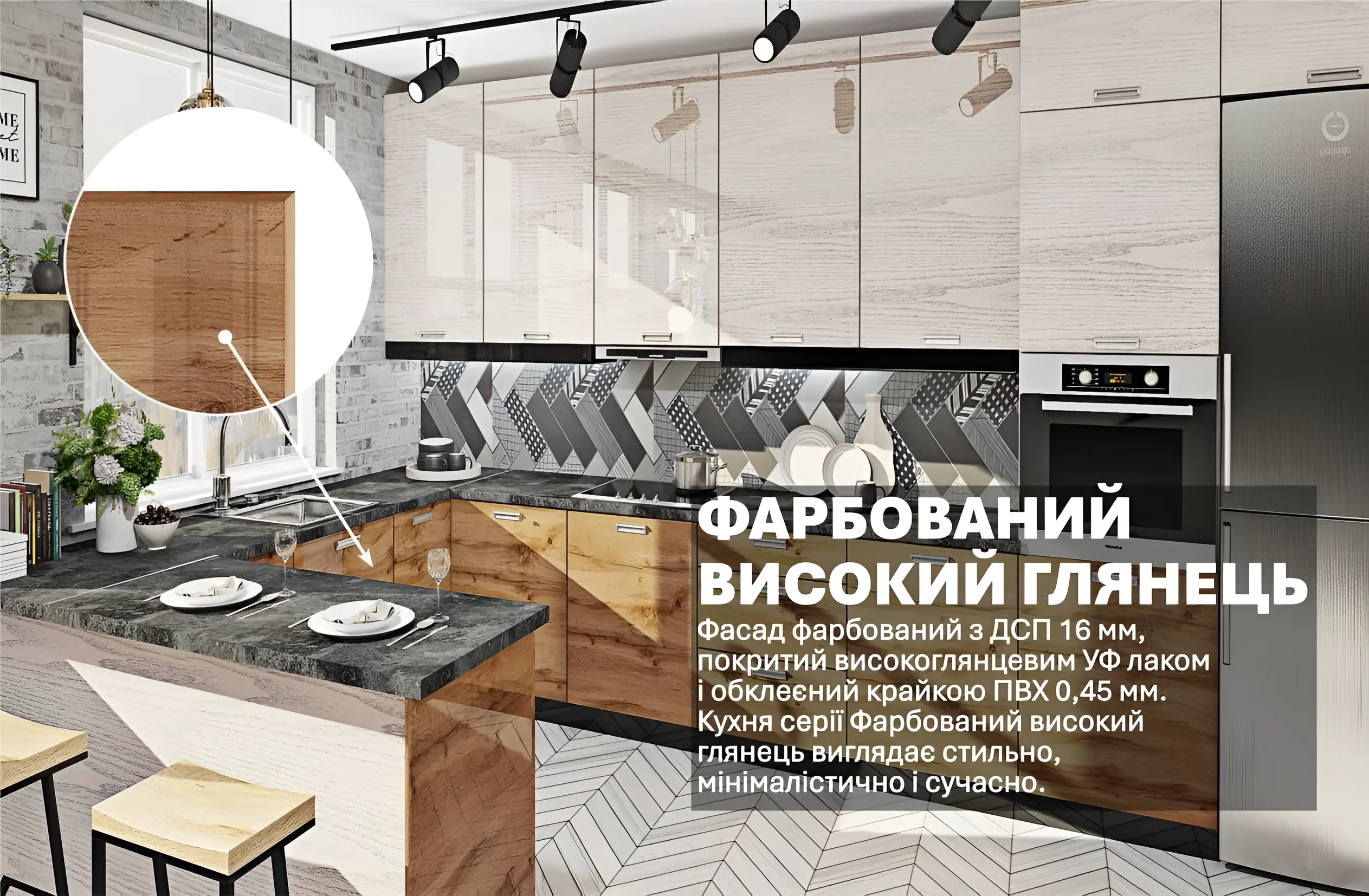 Кухня «Крашеный высокий глянец» 4.2х2.6м Дуб беленый, Дуб золотой – это не просто набор мебели, это инвестиция в комфорт, функциональность и эстетику вашего дома. Она объединяет в себе все необходимые качества для современной кухни: красоту глянцевых фасадов, практичность высококачественных материалов, продуманную эргономику и возможность адаптации под индивидуальные потребности. Создайте кухню, которая будет вдохновлять вас каждый день, станет местом для теплых семейных встреч и кулинарных шедевров. С MebelTops.com ваша мечта об идеальной кухне станет реальностью.