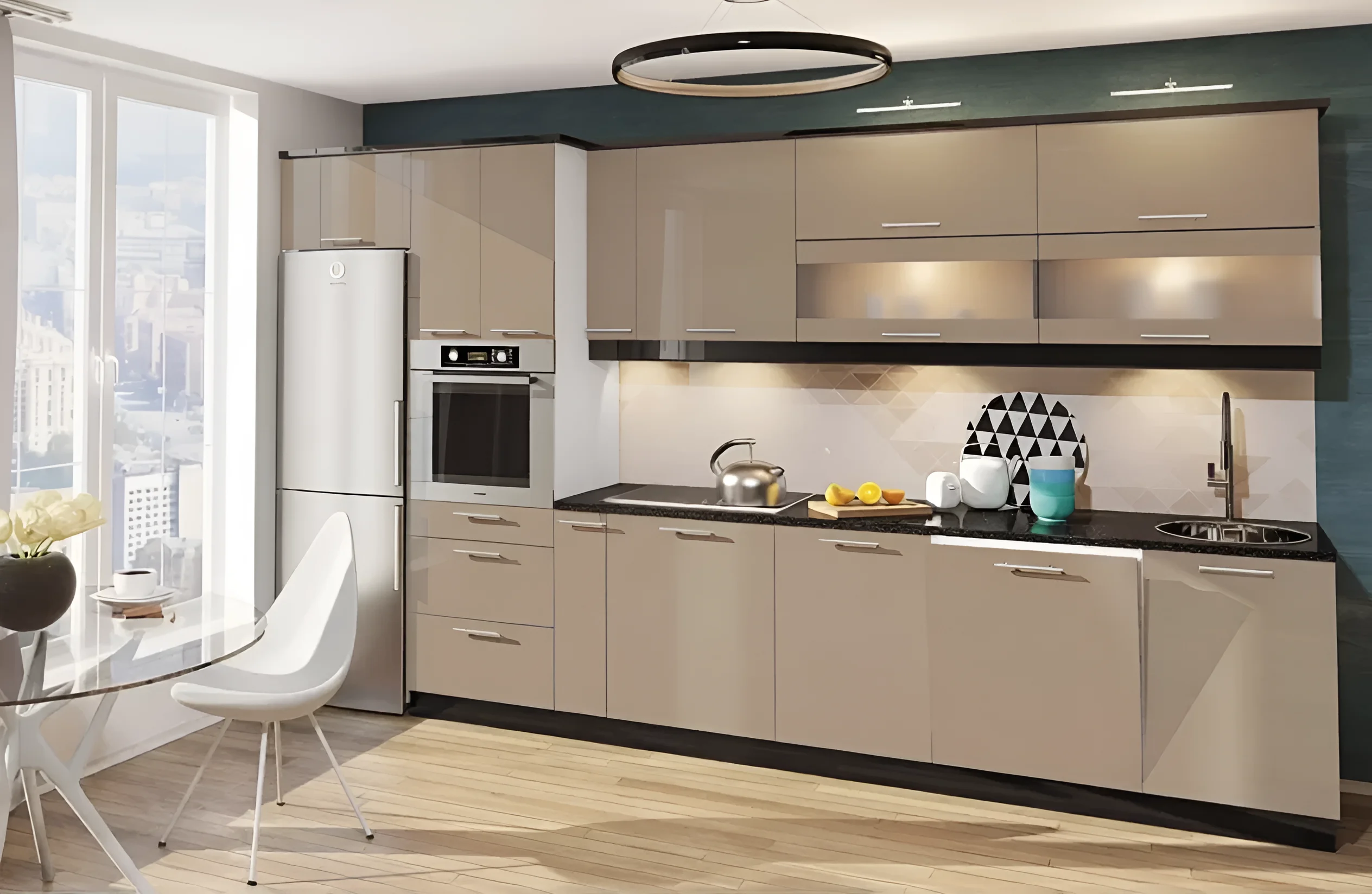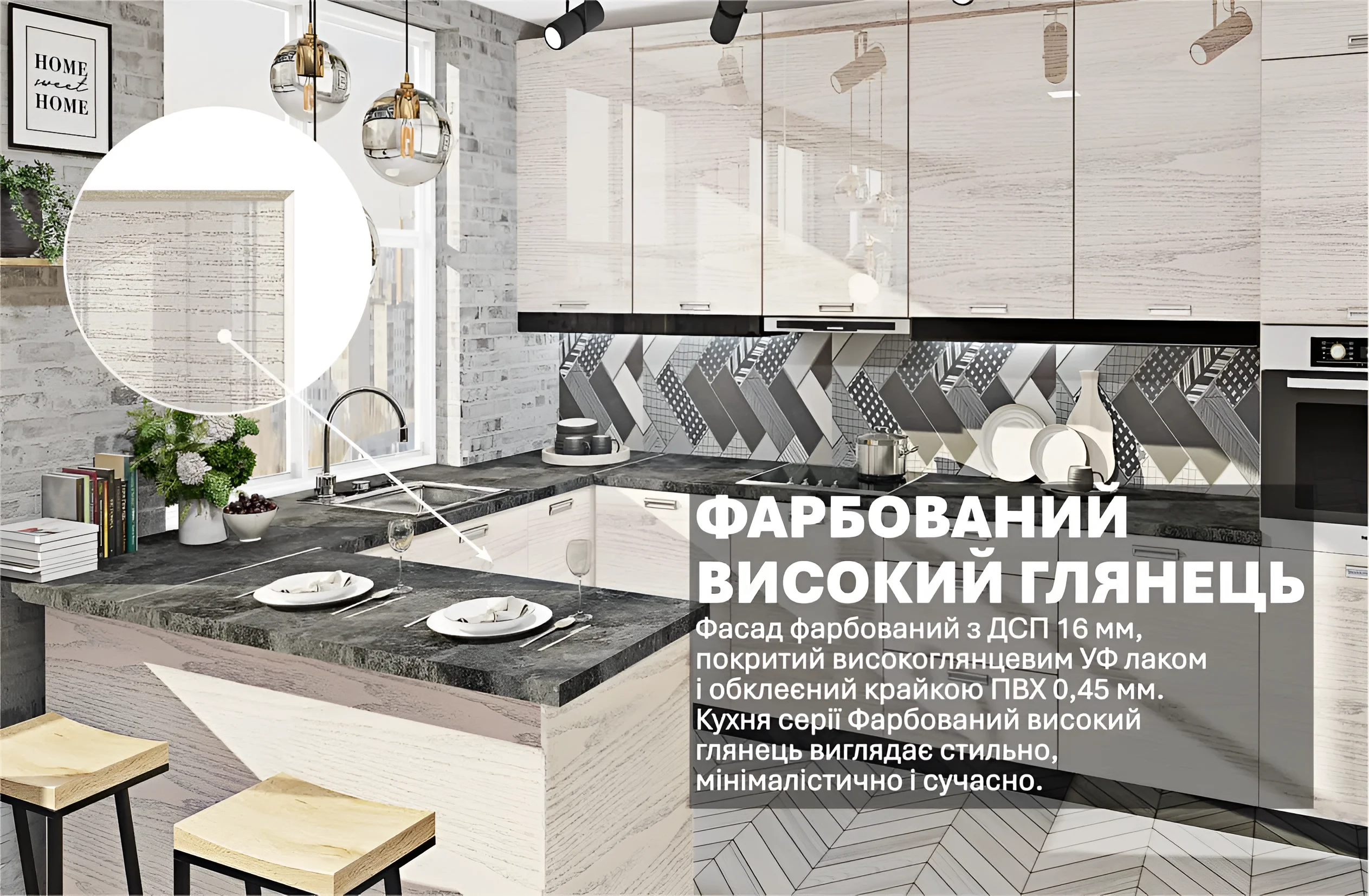 Серия «Крашеный высокий глянец» разработана для тех, кто ценит чистоту линий, современный вид и простоту в уходе. Гладкие поверхности легко очищаются от пятен и пыли, сохраняя первозданный блеск на протяжении многих лет. Эргономичные ручки или их отсутствие (в зависимости от выбранной конфигурации) подчеркивают минималистичный дизайн и делают использование кухни максимально комфортным.