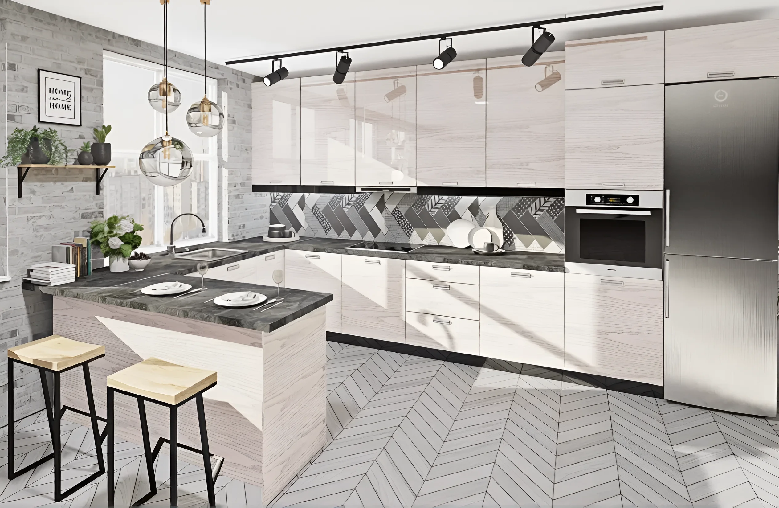 Представляем вам современную кухню из серии «Крашеный высокий глянец» в благородном оттенке «Дуб беленый» от MebelTops.com. Эта модель идеально сочетает в себе изысканный дизайн, высокую функциональность и долговечность, становясь центральным элементом любого интерьера. Обладая впечатляющими размерами 4,2 метра по одной стороне и 2,6 метра по другой, она предлагает продуманное пространство для приготовления пищи, хранения и комфортного времяпровождения.