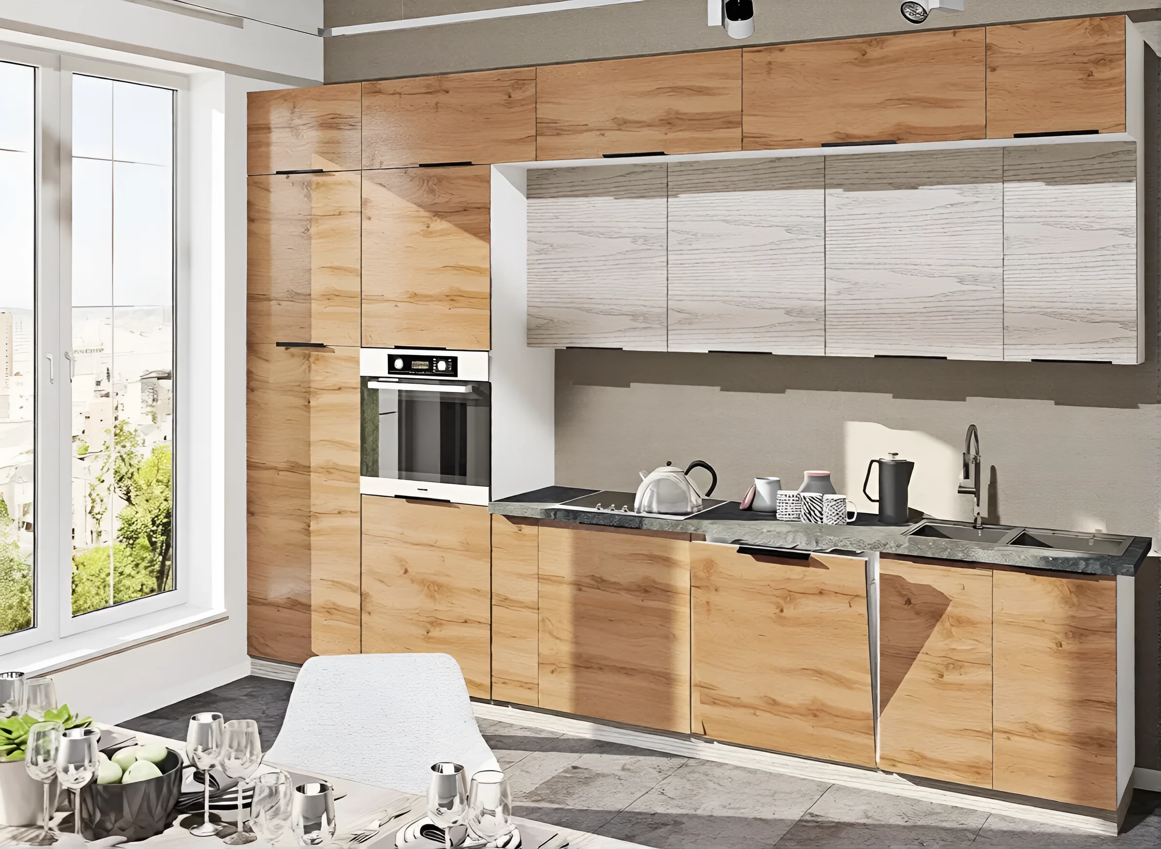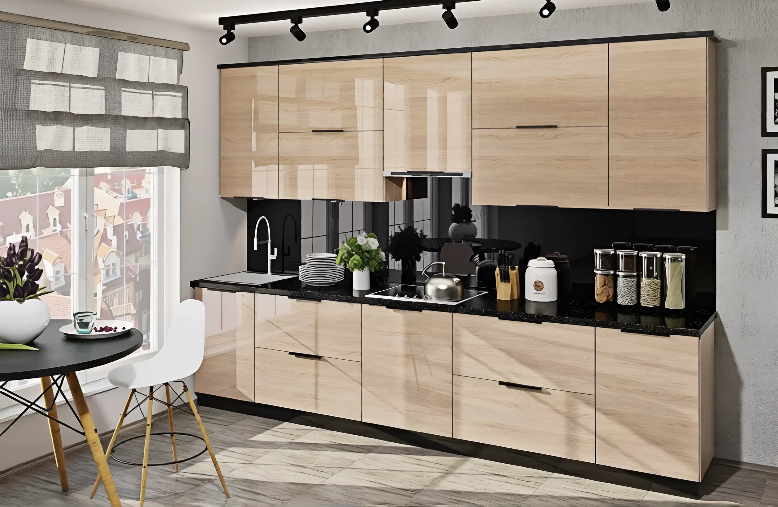 Одной из ключевых особенностей этой кухни являются ее фасады. «Фасады МДФ крашеные глянцевые» – это не просто слова, а гарантия безупречного внешнего вида и практичности. Высокий глянец фасадов, выполненных из МДФ, создает эффектное отражение света, визуально расширяя пространство и наполняя его светом. Цвет «Дуб беленый» придает кухне особую легкость и воздушность, делая ее универсальной для различных стилей – от минимализма до неоклассики. Этот оттенок не только выглядит стильно и актуально, но и прекрасно маскирует мелкие загрязнения, что особенно ценно на кухне. Материал корпуса, выполненный из высококачественного ДСП, обеспечивает прочность и стабильность всей конструкции, гарантируя долгий срок службы.