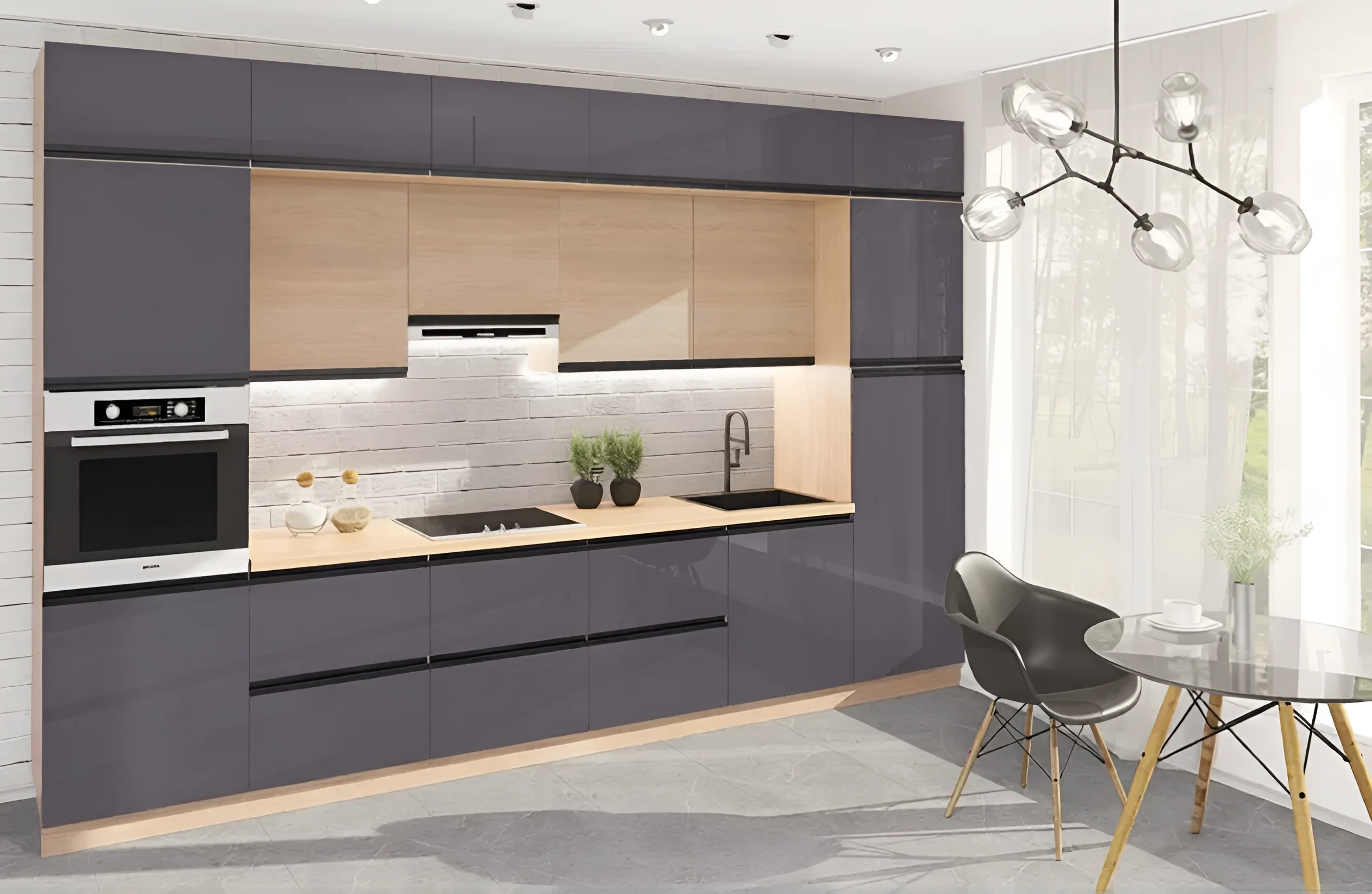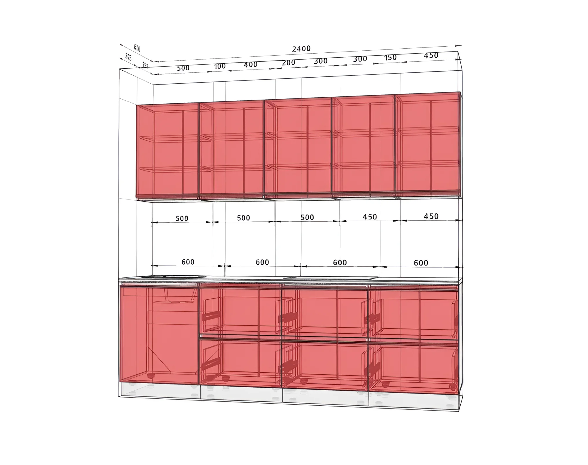 Кухня «Sigma ручка» длиной 2,4 метра разработана с учетом современных требований к эргономике кухонного пространства. Стандартная высота кухни составляет 2,15 метра, что обеспечивает удобный доступ ко всем элементам. Верхние шкафы доступны в двух вариантах высоты – 720 мм и 920 мм, что позволяет оптимизировать пространство для хранения и адаптировать кухню под индивидуальные потребности и высоту потолков. Глубина нижних тумб в 450 мм является стандартной, что гарантирует достаточное внутреннее пространство для посуды и кухонной утвари, не перегружая при этом помещение. Стандартная глубина столешницы 600 мм создает комфортную рабочую зону для приготовления пищи.