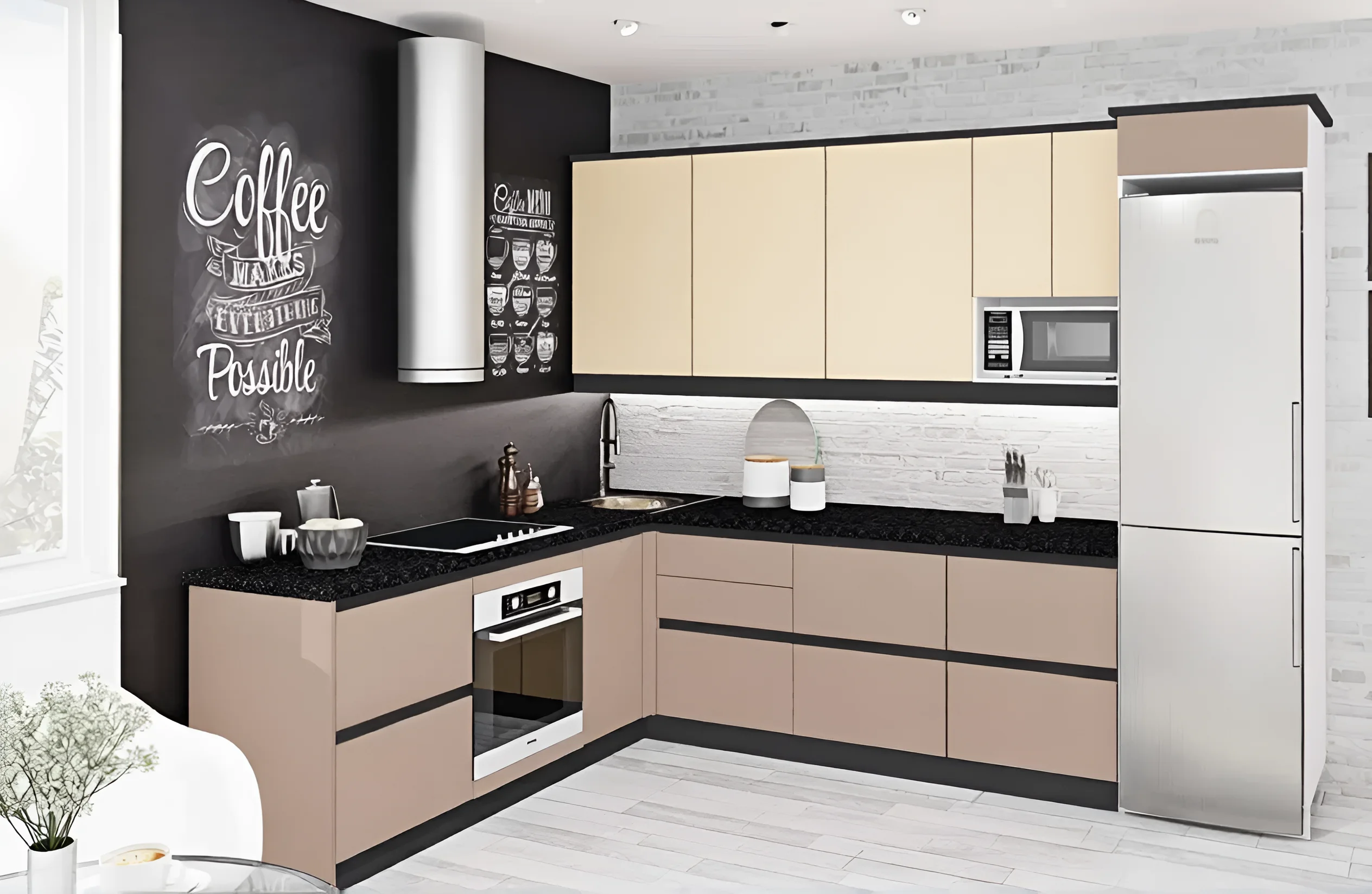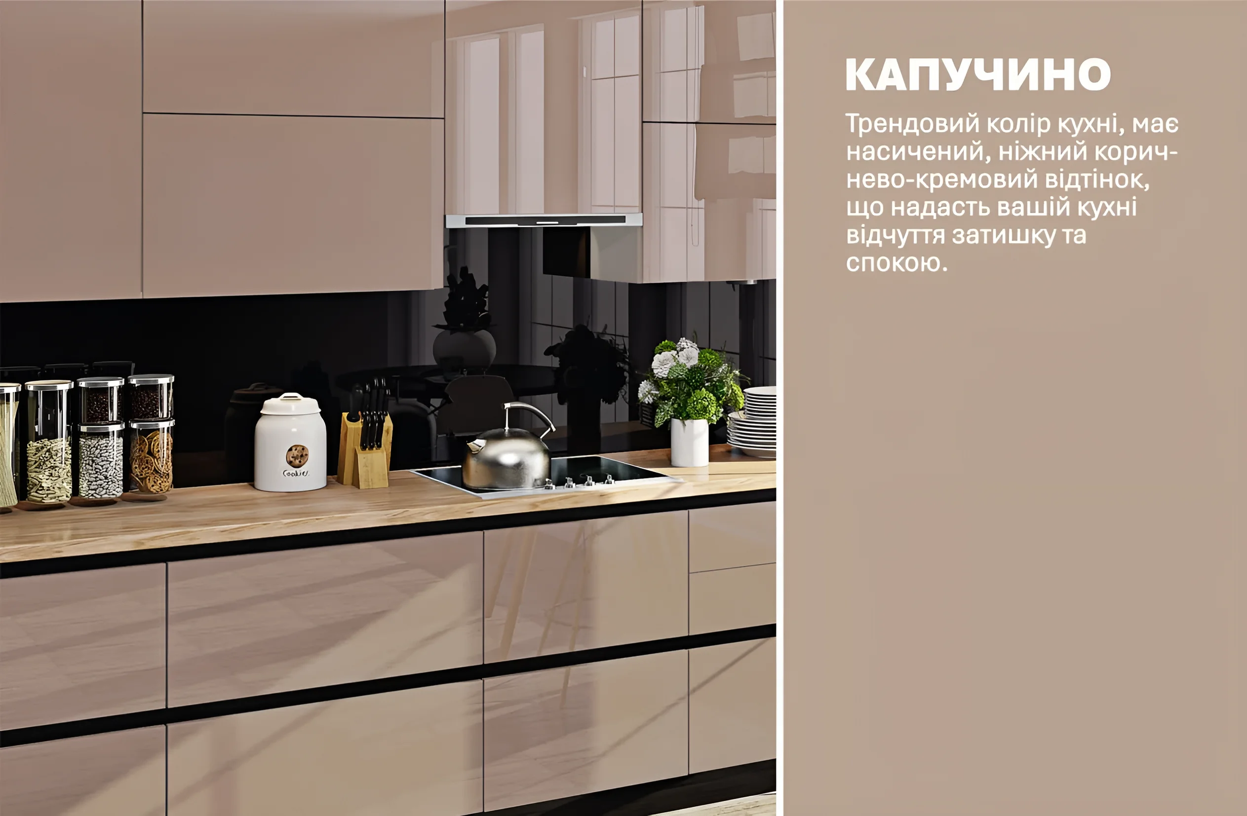 Цвет фасада кухни «Капучино» — это один из самых универсальных и популярных оттенков, который способен привнести в любой интерьер тепло и уют. Этот мягкий, молочно-кофейный тон прекрасно сочетается как с темными, так и со светлыми акцентами, позволяя создавать разнообразные дизайнерские решения. «Капучино» дарит ощущение спокойствия и гармонии, при этом сохраняя элегантность и изысканность. Он не надоедает со временем и всегда выглядит актуально, подчеркивая благородство и статус вашего дома. Глянцевое покрытие фасадов дополнительно усиливает глубину цвета, делая его еще более привлекательным и выразительным.