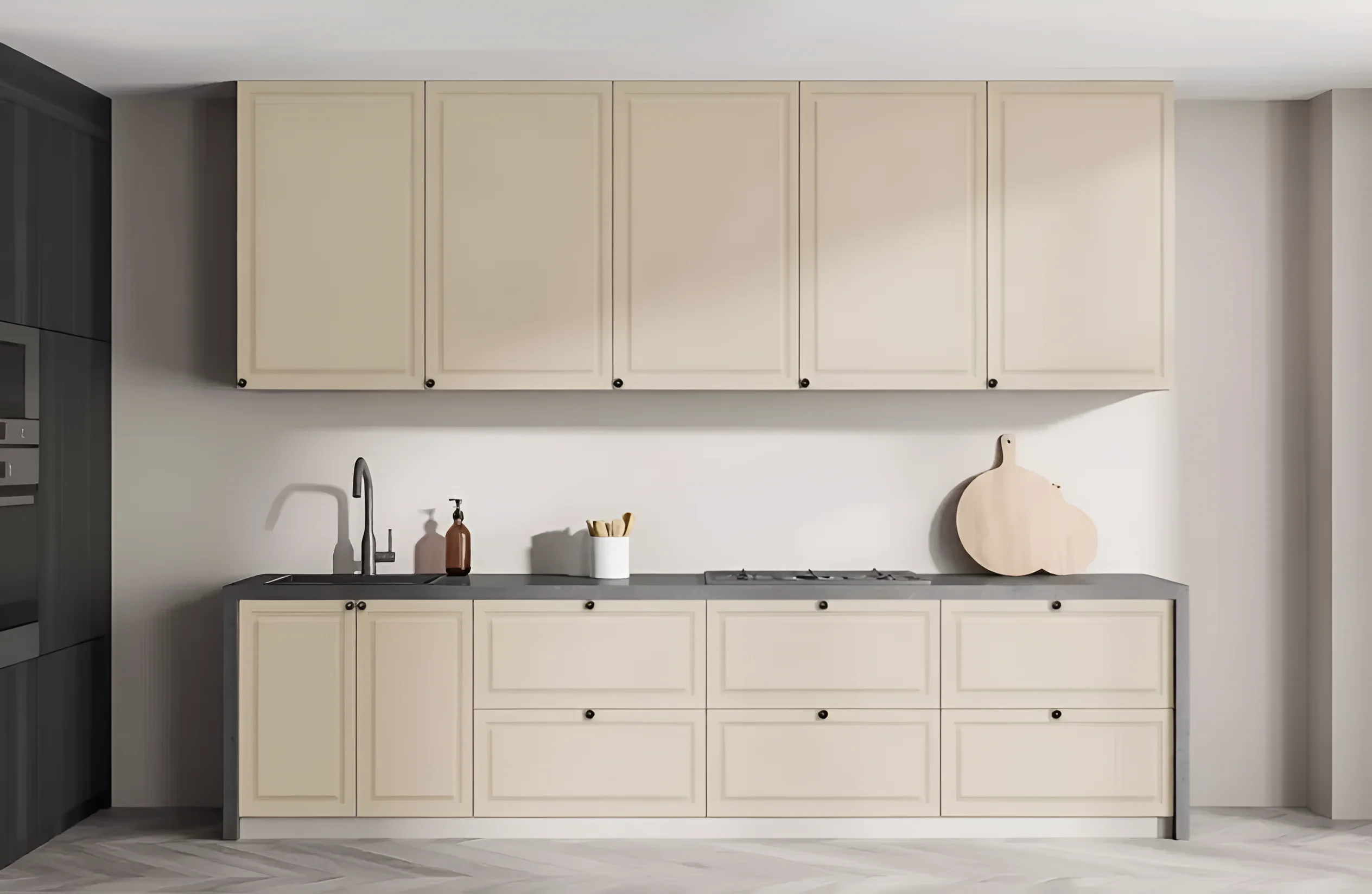 Кухня «Диамант» притягивает взгляды своим современным и в то же время элегантным дизайном. Сочетание цветов Белый и Крем создает ощущение простора, света и чистоты, делая вашу кухню визуально больше и уютнее. Эти универсальные оттенки легко вписываются в любой интерьер, будь то классика, модерн или скандинавский стиль. Выбор между фасадами МДФ, покрытыми плёнкой ПВХ глянец, и фасадами МДФ с плёнкой ПВХ софт тач позволяет вам самостоятельно выбрать желаемую фактуру и эффект. Глянцевые фасады добавят блеска и глубины, отражая свет и визуально расширяя пространство, а софт тач подарит приятные тактильные ощущения и создаст более сдержанный, матовый вид, устойчивый к отпечаткам пальцев.