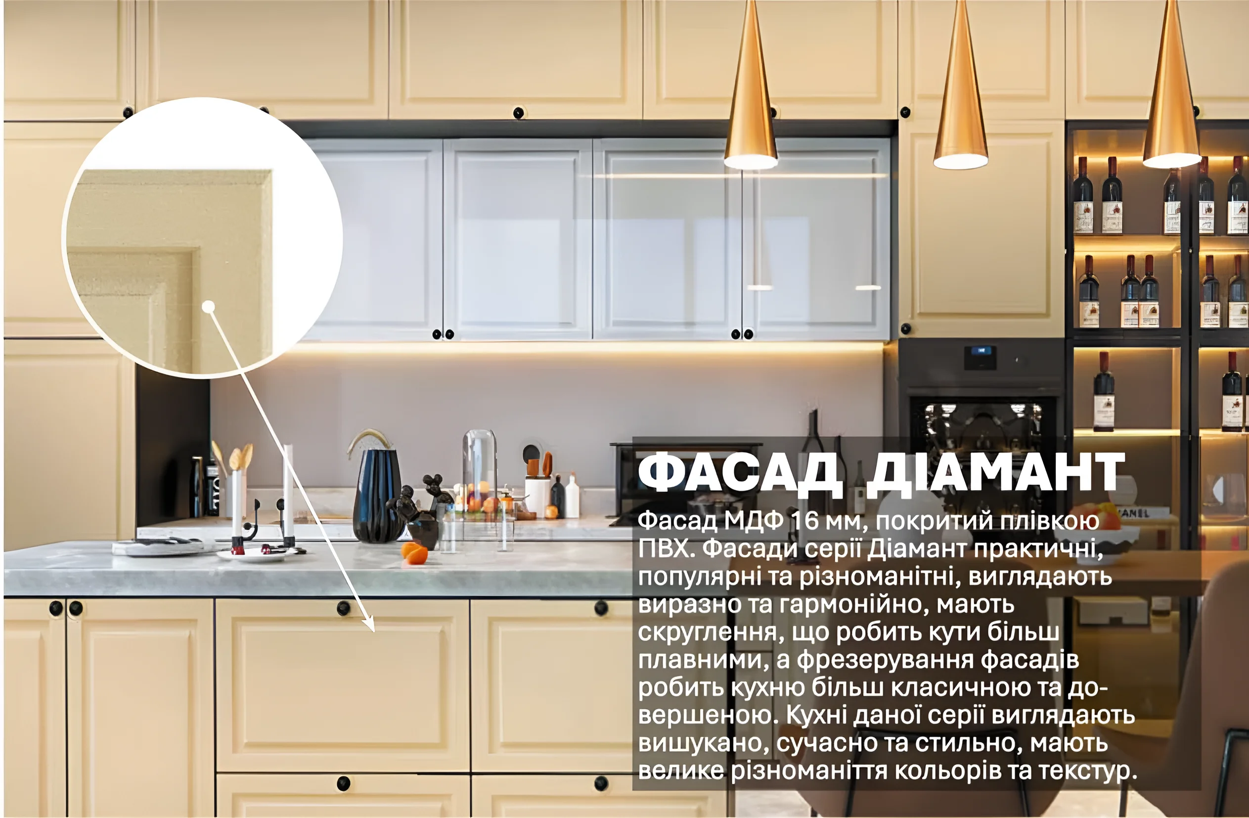 Качество материалов – залог долговечности и надежности вашей кухни. Фасады кухни «Диамант» выполнены из высококачественного МДФ – материала, известного своей прочностью, влагостойкостью и способностью долго сохранять первоначальный вид. Корпус кухни изготовлен из прочного ДСП, что обеспечивает стабильность и надежность всей конструкции. Покрытие фасадов из плёнки ПВХ не только придает им эстетичный вид, но и защищает от механических повреждений, влаги и воздействия бытовой химии, что особенно важно для кухонного пространства. Вы можете быть уверены, что ваша кухня прослужит вам долгие годы, сохраняя свою красоту и функциональность.