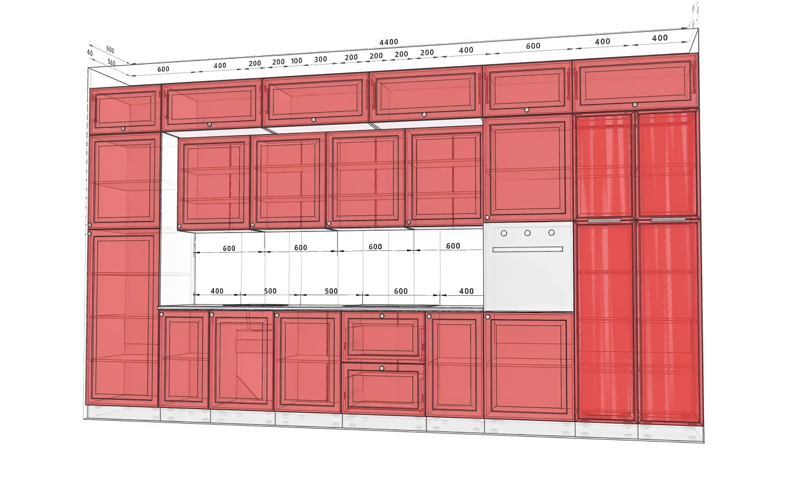 Эта кухня длиной 4.4 метра разработана с учетом максимальной эргономики и удобства использования. Наличие острова не только увеличивает рабочую поверхность, но и создает дополнительное место для хранения или уютную обеденную зону. Высота кухни в 2.5 метра «до потолка» с антресолями позволяет использовать каждый сантиметр пространства, обеспечивая обилие мест для хранения утвари, посуды и запасов. Высота верхних шкафов доступна в двух вариантах: 720 мм и 920 мм, что дает возможность адаптировать кухню под индивидуальные потребности и высоту потолков. Глубина нижних тумб составляет стандартные 450 мм, обеспечивая удобный доступ ко всему содержимому, а глубина столешницы в 600 мм гарантирует комфортную рабочую зону для приготовления пищи.