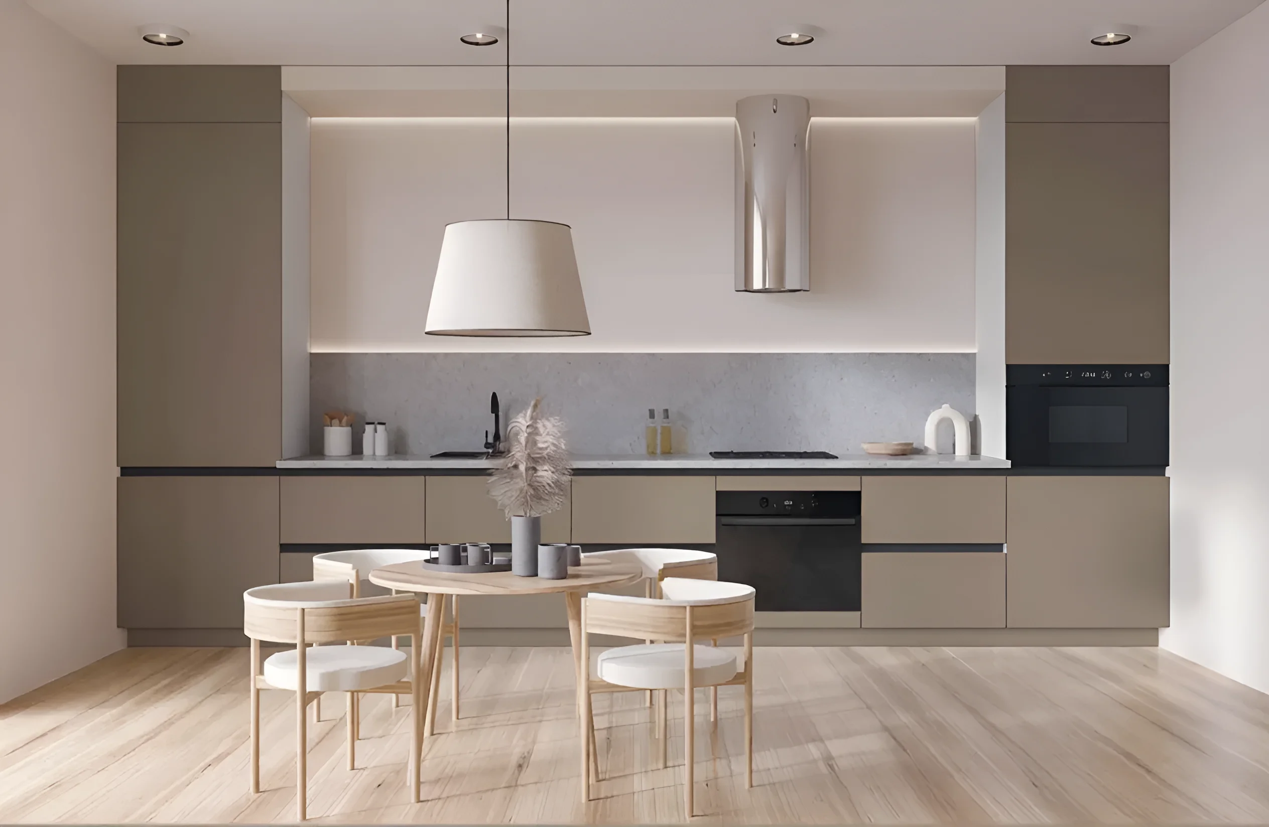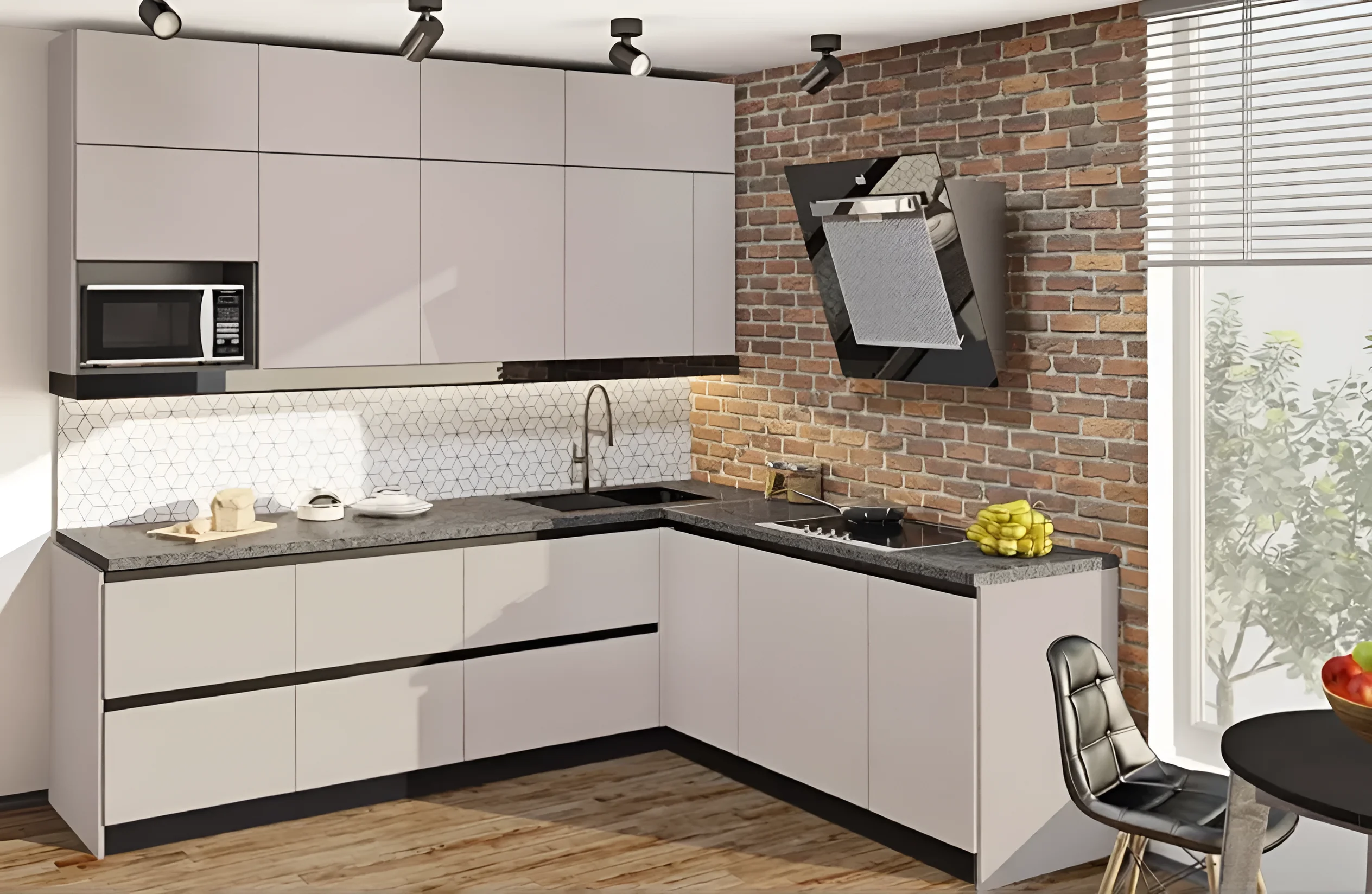 Кухня «Gola ручка» изготовлена из высококачественных материалов, что гарантирует ее долгий срок службы. Корпус кухни выполнен из прочного ДСП, известного своей надежностью и устойчивостью к деформациям. Фасады, как уже было упомянуто, сочетают в себе МДФ рамку и ламинированную ДСП вставку. Такое сочетание обеспечивает оптимальный баланс между эстетикой, прочностью и практичностью. Все материалы соответствуют высоким стандартам качества, обеспечивая безопасность и экологичность вашей кухни.