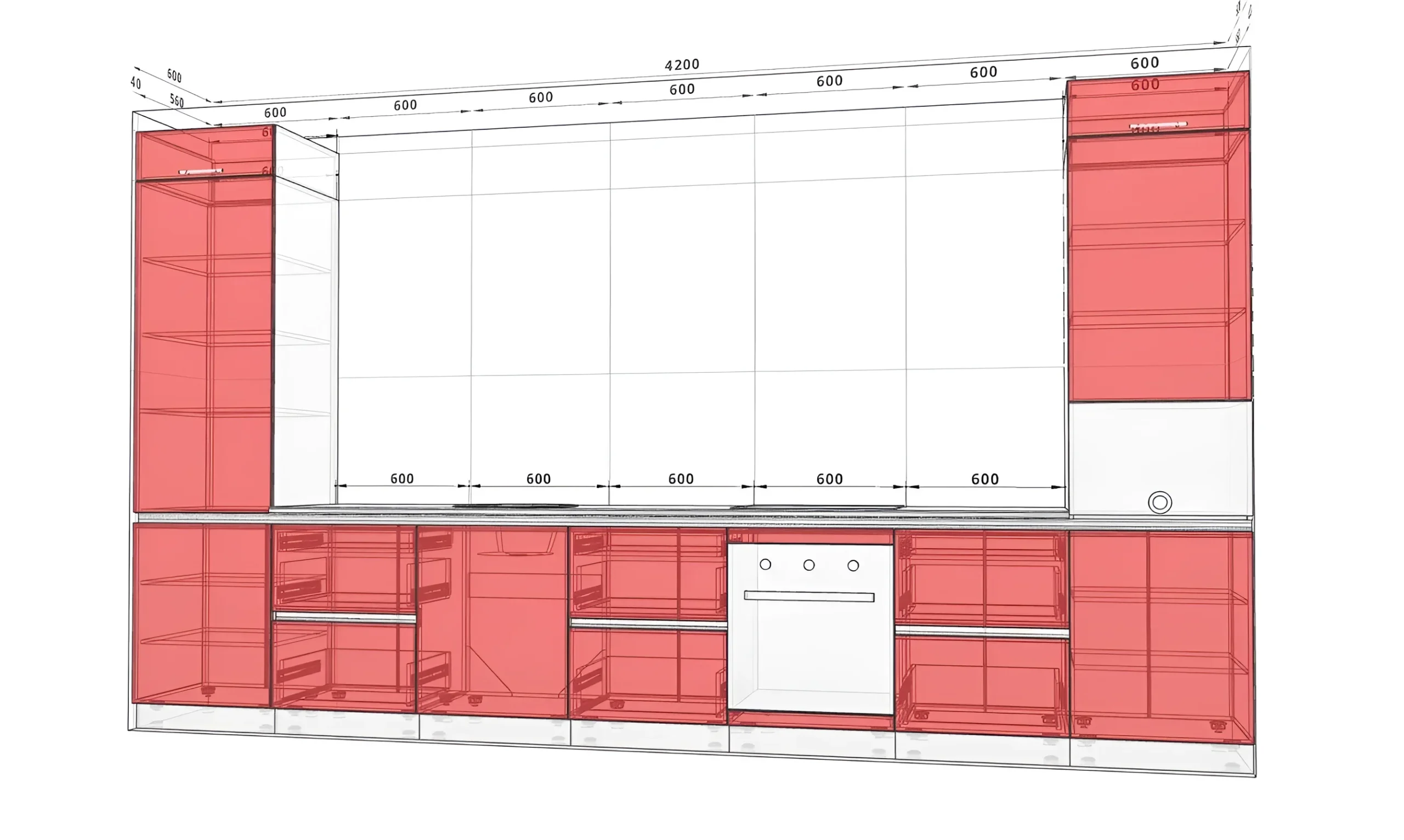 Данная модель кухни имеет общую длину 4.2 метра, что делает ее вместительной и функциональной для комфортного размещения всей необходимой кухонной утвари и бытовой техники. Стандартная высота кухни составляет 2.15 метра, что обеспечивает оптимальный доступ ко всем элементам. Верхние шкафы предлагаются в двух вариантах высоты – 720 мм и 920 мм, позволяя выбрать наиболее подходящую конфигурацию для хранения в зависимости от ваших потребностей и высоты потолков. Глубина нижних тумб составляет стандартные 450 мм, обеспечивая удобное размещение посуды и продуктов. Столешница имеет стандартную глубину 600 мм, что создает достаточно пространства для комфортной готовки и размещения бытовой техники.
