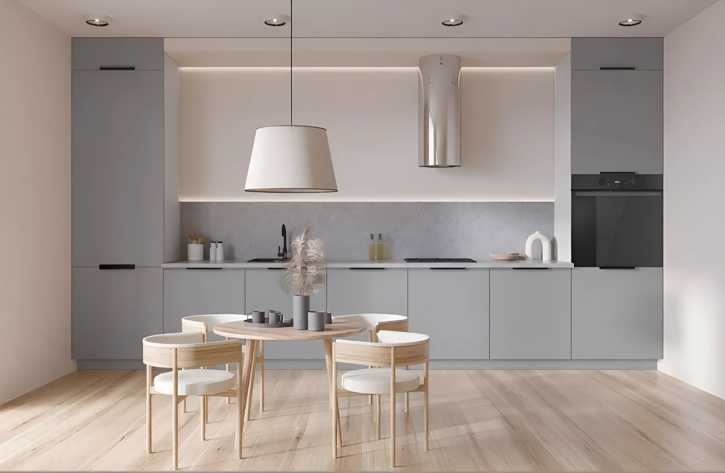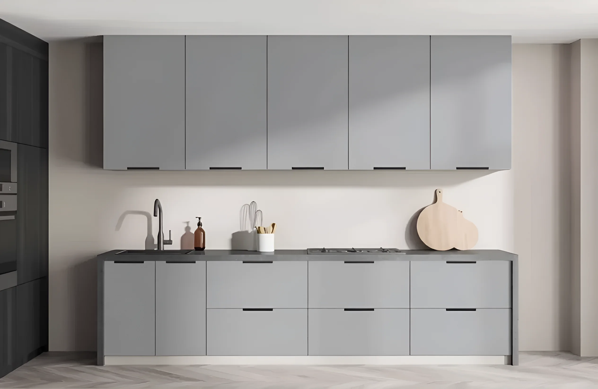 Особое внимание в кухне «Лофт» уделено фасадам. Они изготовлены из МДФ – материала, который зарекомендовал себя как один из лучших для производства кухонной мебели благодаря своей прочности, влагостойкости и долговечности. Фасады крашеные, с матовым покрытием, что придает им изысканный и современный вид. Матовая поверхность не только выглядит очень стильно и благородно, но и обладает практическим преимуществом – на ней менее заметны отпечатки пальцев и мелкие загрязнения, что значительно упрощает уход за кухней. Цвет фасада – Титан – это глубокий, универсальный оттенок серого, который прекрасно гармонирует с различными цветами и текстурами, позволяя легко интегрировать кухню в любой дизайнерский проект.