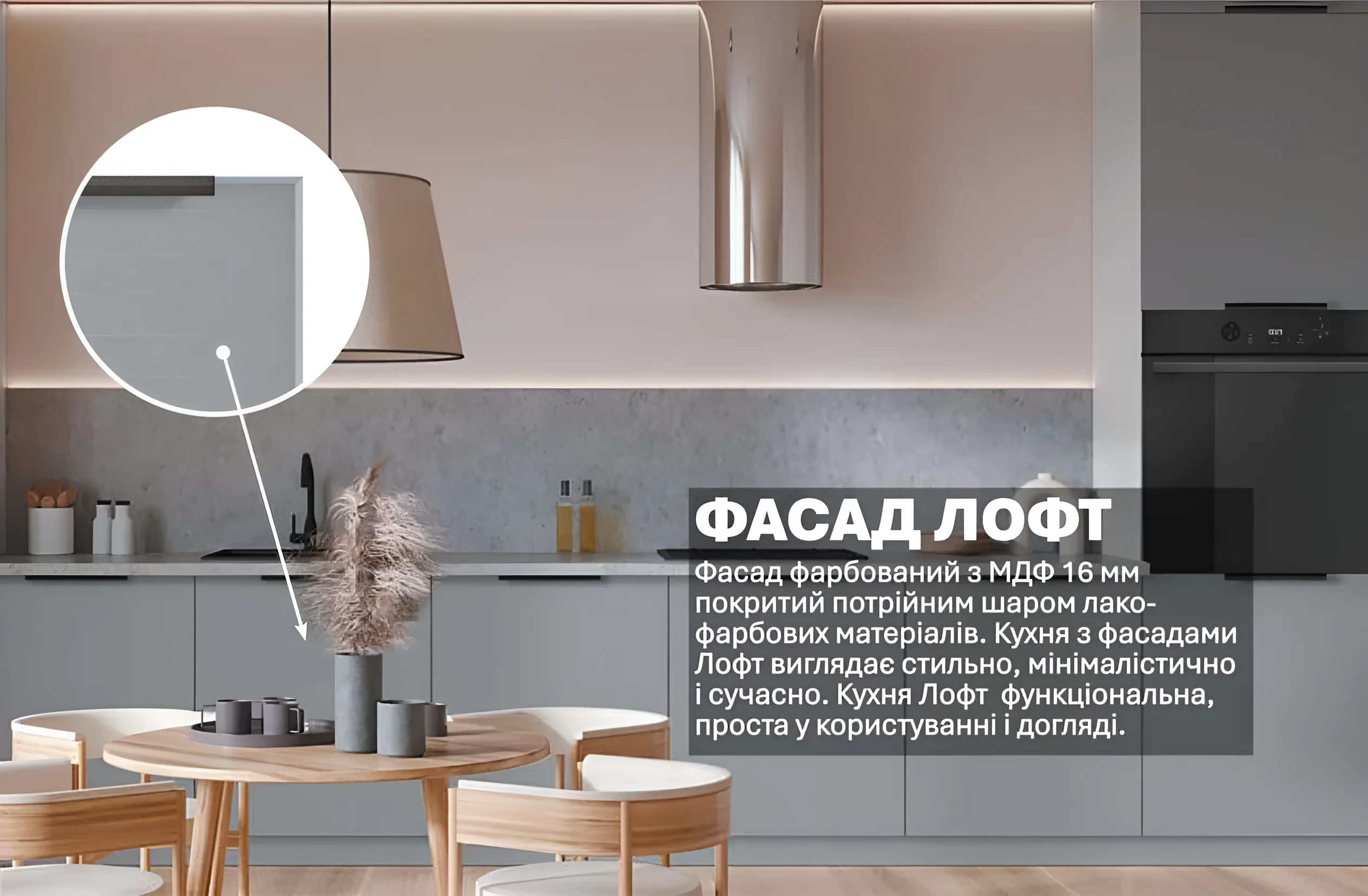 Купить Кухня одноуровневая «Лофт» 4,2 метра крашеный МДФ Титан в Украине вы можете на сайте MebelTops.com.