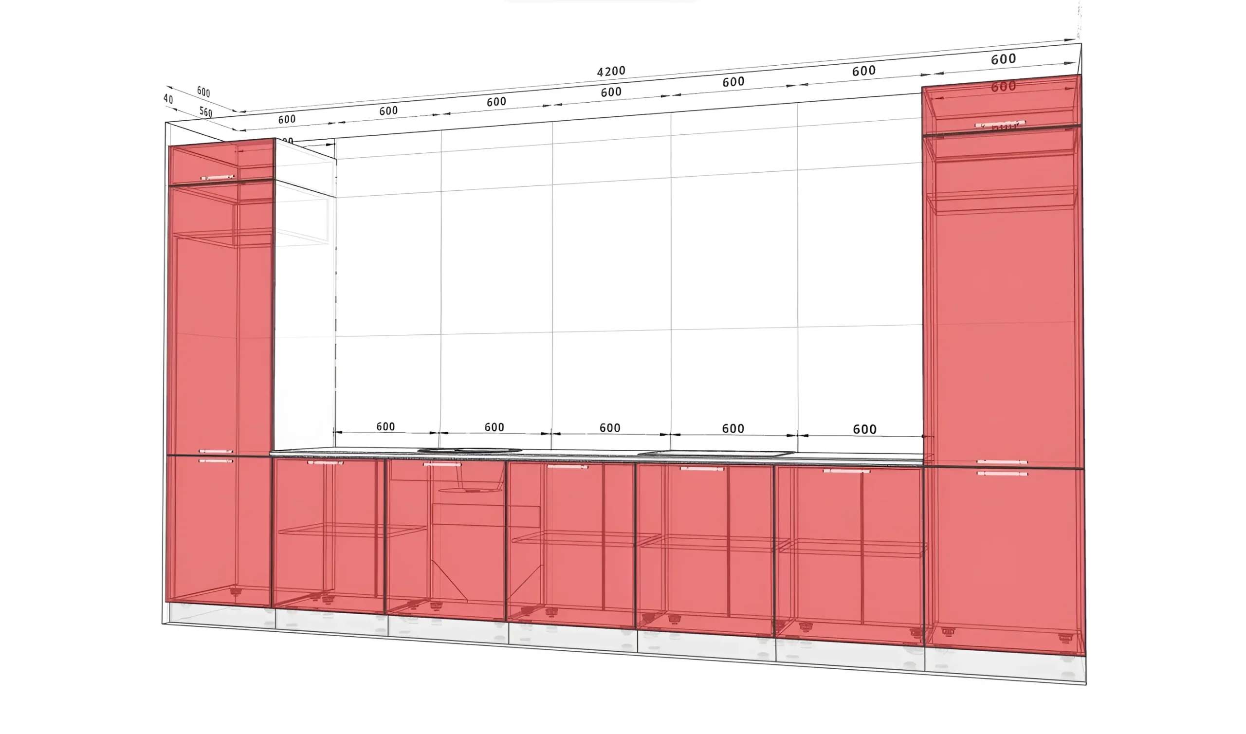 Эта кухня разработана с учетом современных требований к эргономике и эстетике. Общая высота кухни составляет 2,15 метра, что является стандартным и наиболее удобным показателем для большинства помещений. Длина в 4,2 метра позволяет разместить все необходимые элементы кухонного гарнитура, включая рабочие поверхности, варочную панель, мойку и достаточное количество мест для хранения. Продуманное одноуровневое расположение создает ощущение простора и свободы, характерное для стиля лофт, при этом сохраняя максимальную функциональность.