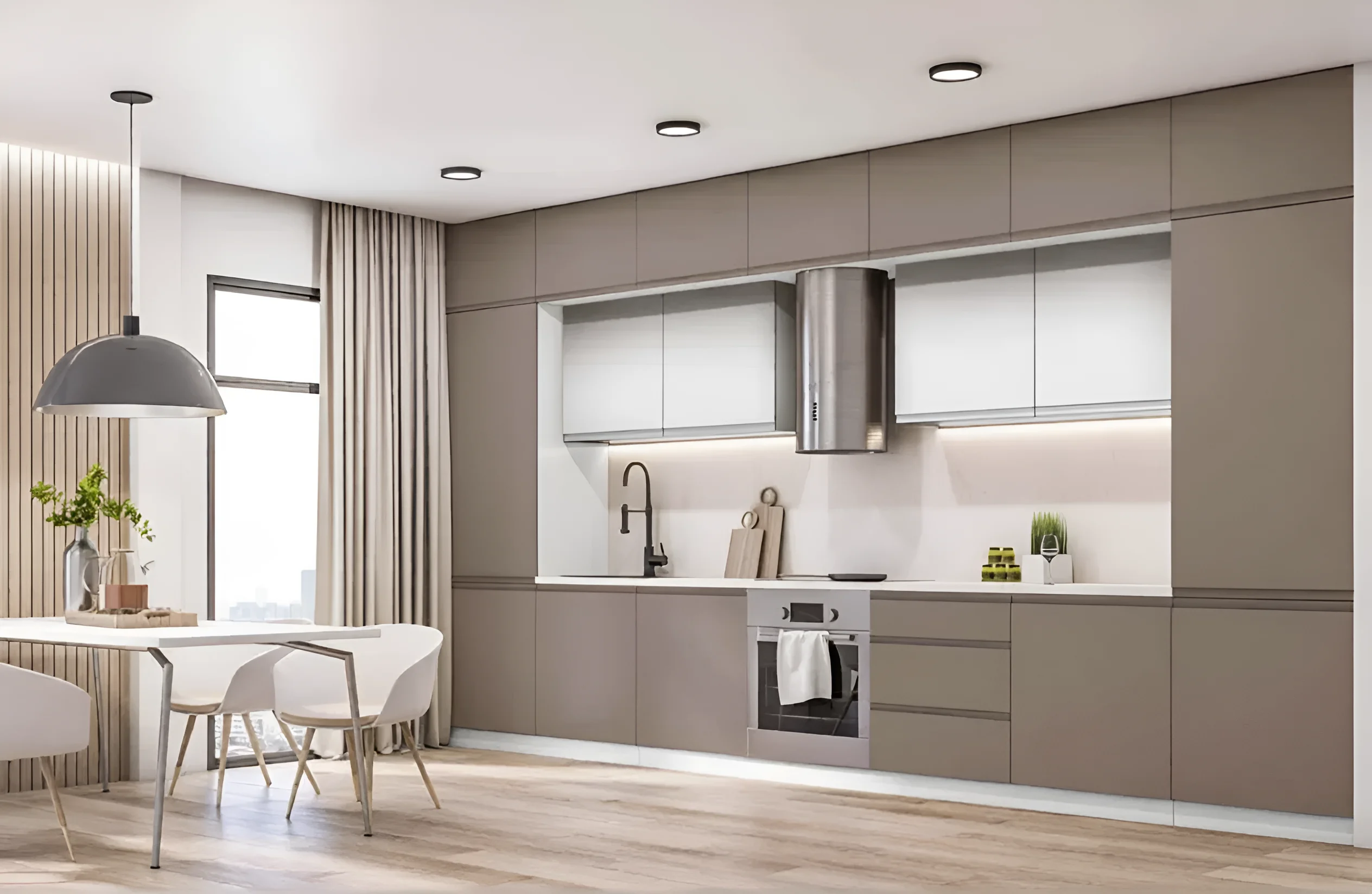 Серия «Альфа ручка» характеризуется минималистичным дизайном без выступающих ручек, что подчеркивает ее современный стиль и обеспечивает легкость в уходе. Отсутствие внешних ручек создает чистые линии и гладкую поверхность, что особенно важно для глянцевых фасадов. Верхние шкафы предлагаются в двух вариантах высоты – 1080 мм и 1280 мм, что позволяет создать индивидуальную конфигурацию, идеально подходящую под ваши потребности и рост. Глубина нижних тумб составляет стандартные 450 мм, обеспечивая удобный доступ к содержимому, в то время как глубина столешницы в 600 мм гарантирует достаточно места для комфортной готовки и размещения мелкой бытовой техники. Каждый элемент кухни продуман для вашего максимального удобства.