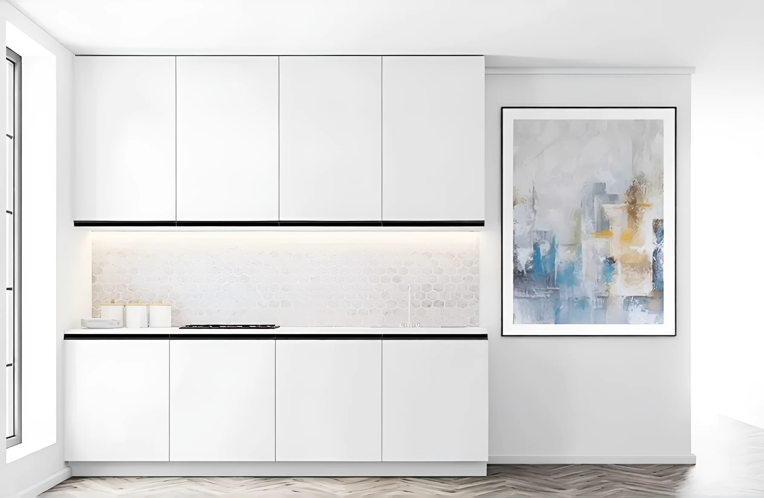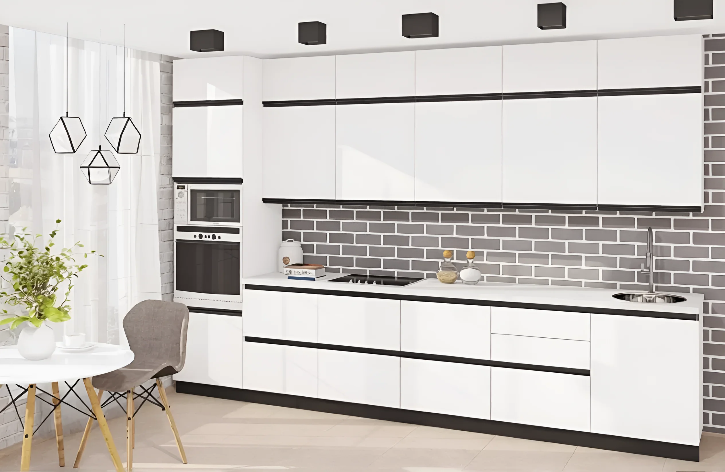 Фасады выполнены из ДСП, что является практичным и долговечным решением. Покрытие фасадов представляет собой комбинацию МДФ рамки и ламинированной вставки из ДСП, что придает им стильный вид и обеспечивает дополнительную прочность. Белый цвет фасада кухни создает ощущение чистоты и свежести, делая интерьер более воздушным и просторным. Такой выбор цвета идеально гармонирует с различными стилями оформления, от минимализма до скандинавского.