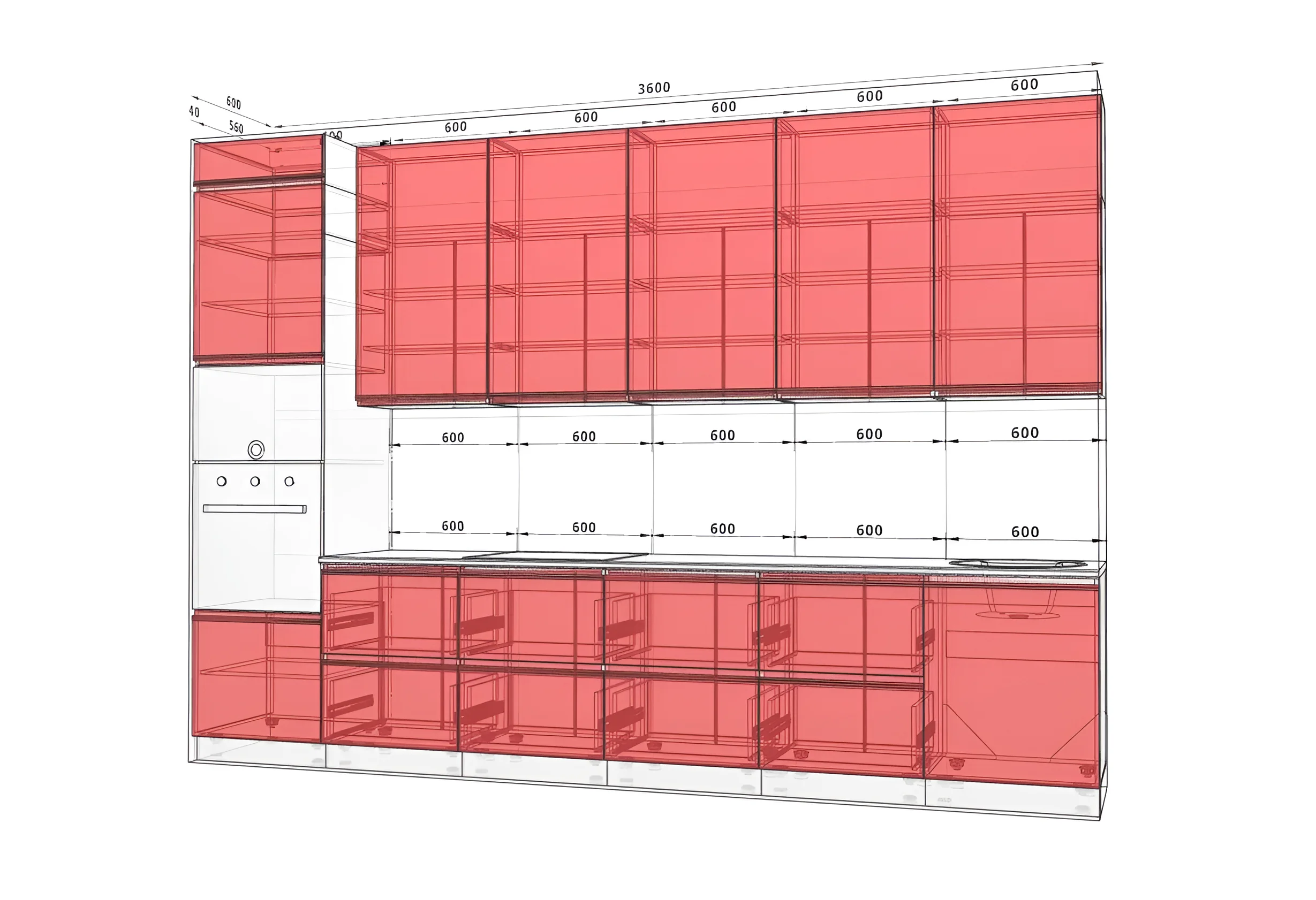 Одной из ключевых особенностей кухни «Тренд» является ее дизайн «под потолок». Эта концепция не только придает кухне современный и монолитный вид, но и значительно увеличивает полезный объем для хранения, что особенно актуально для больших семей или тех, кто ценит порядок и минимализм. Общая высота кухни составляет впечатляющие 2,5 метра, что достигается за счет использования высоких верхних шкафов и антресолей, позволяющих максимально эффективно задействовать вертикальное пространство. Длина кухни в 3,6 метра обеспечивает достаточно места для размещения всей необходимой бытовой техники и комфортной рабочей зоны.