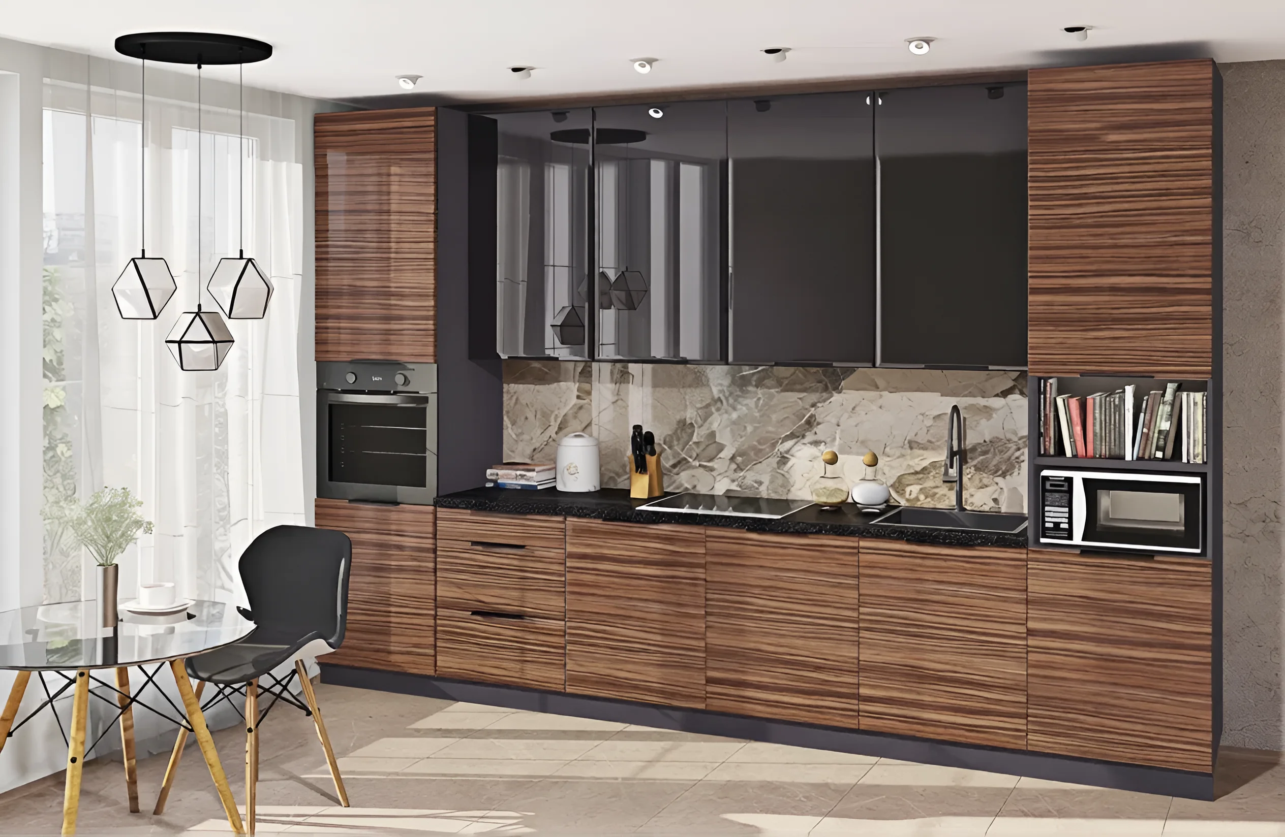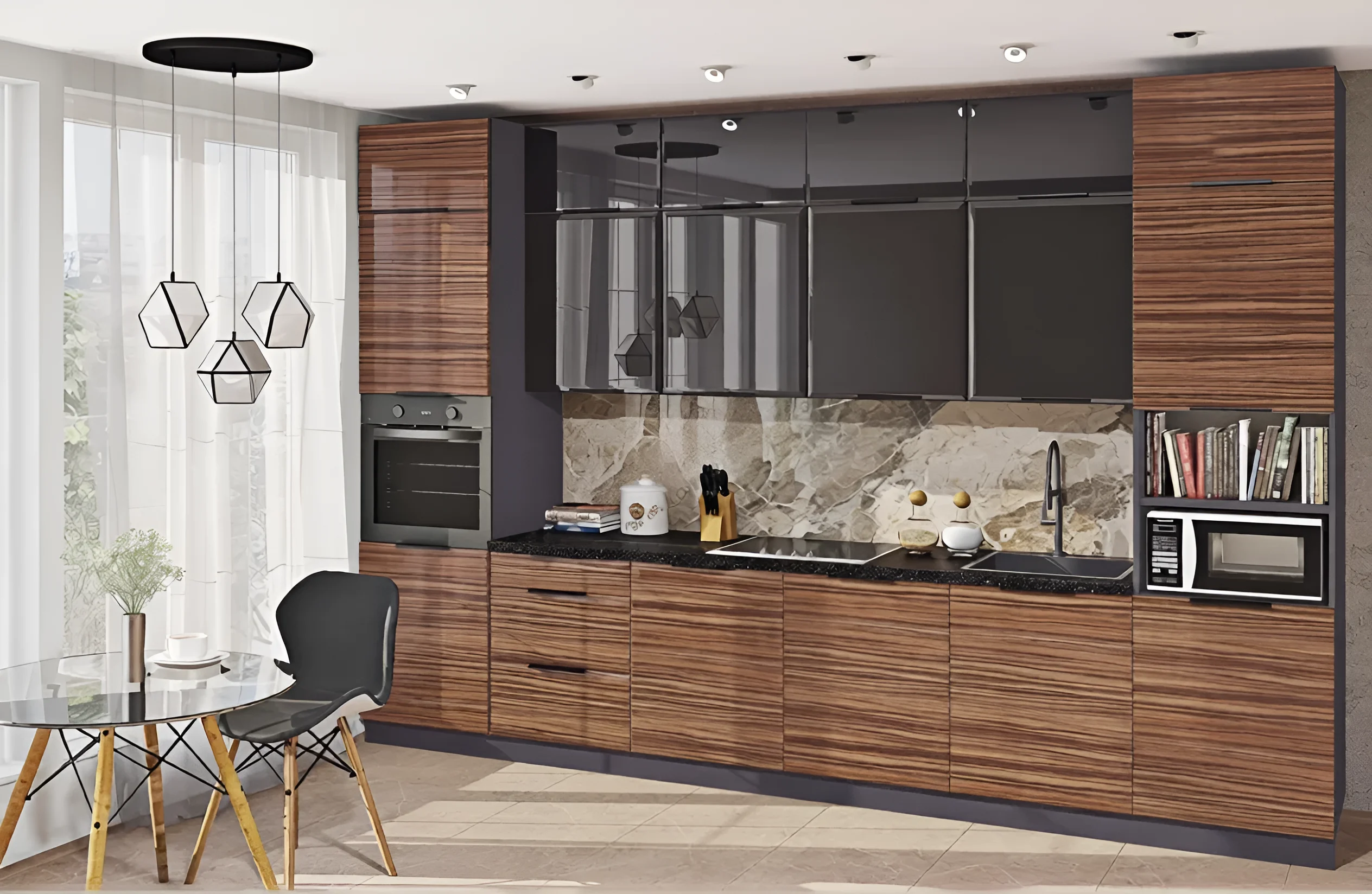 Кухня «Хай-тек» — это воплощение минимализма, функциональности и передовых технологий. Ее длина составляет 3,6 метра, что делает ее оптимальным решением как для просторных, так и для средних по размеру кухонных помещений. Отличительной особенностью этой модели является ее высота — 2,5 метра, что означает «до потолка». Такое решение с антресолями не только выглядит эффектно и современно, но и обеспечивает максимальное использование вертикального пространства для хранения, что особенно ценно в условиях городской квартиры. Фасады кухни выполнены из МДФ с различными вариантами покрытия: часть фасадов имеет плёнку ПВХ с глянцевым эффектом, придавая кухне роскошный и отражающий блеск, а другая часть — текстурированную плёнку ПВХ, добавляющую глубину и природную эстетику имитации дерева «Зебрано светлое». Контрастное сочетание «Зебрано светлое» и «Асфальт» придает кухне особую выразительность и подчеркивает ее принадлежность к стилю хай-тек.