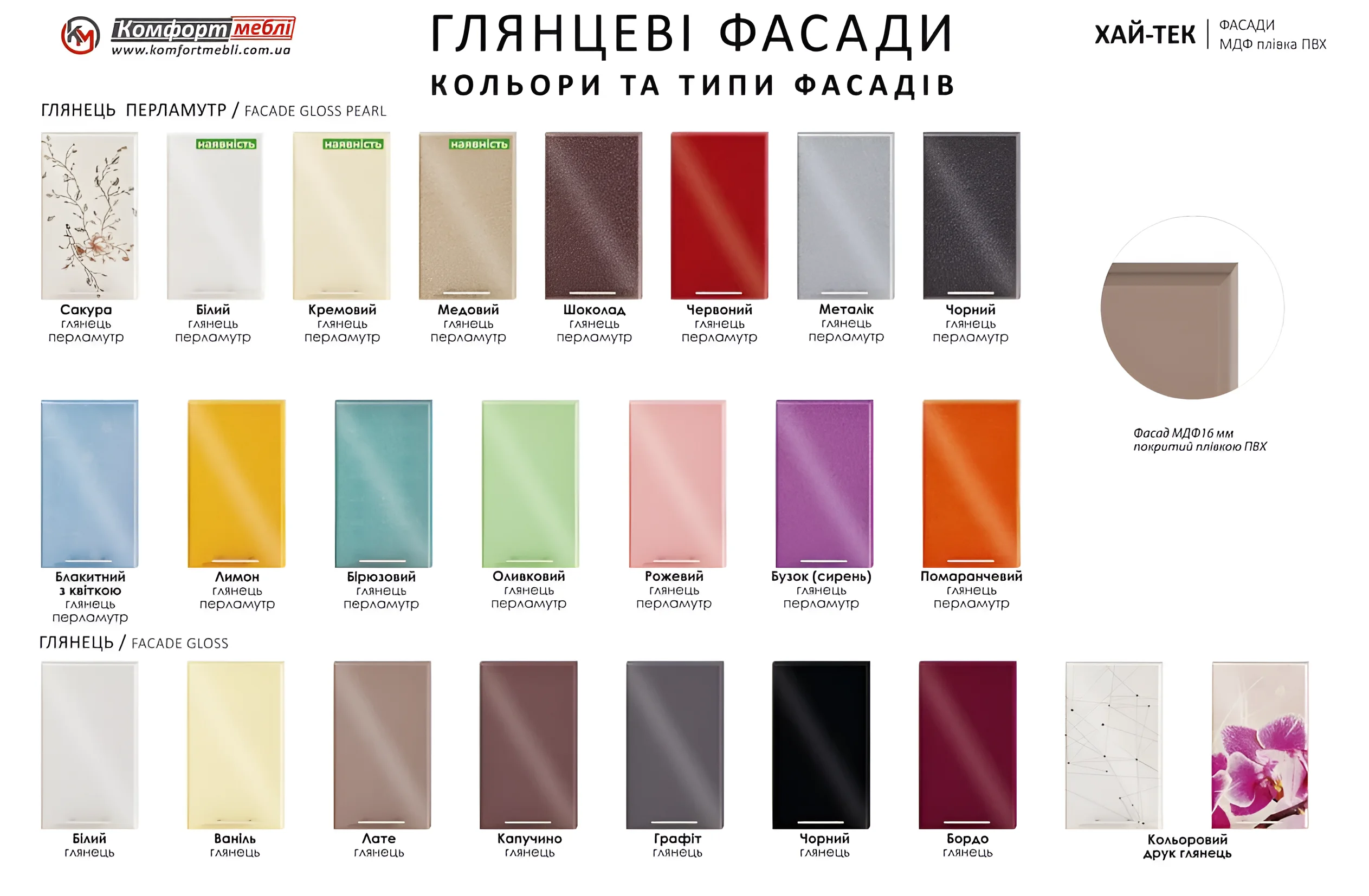 | Покрытие фасадов | Фасады МДФ, плёнка ПВХ глянец, Фасады МДФ, плёнка ПВХ текстурированная |