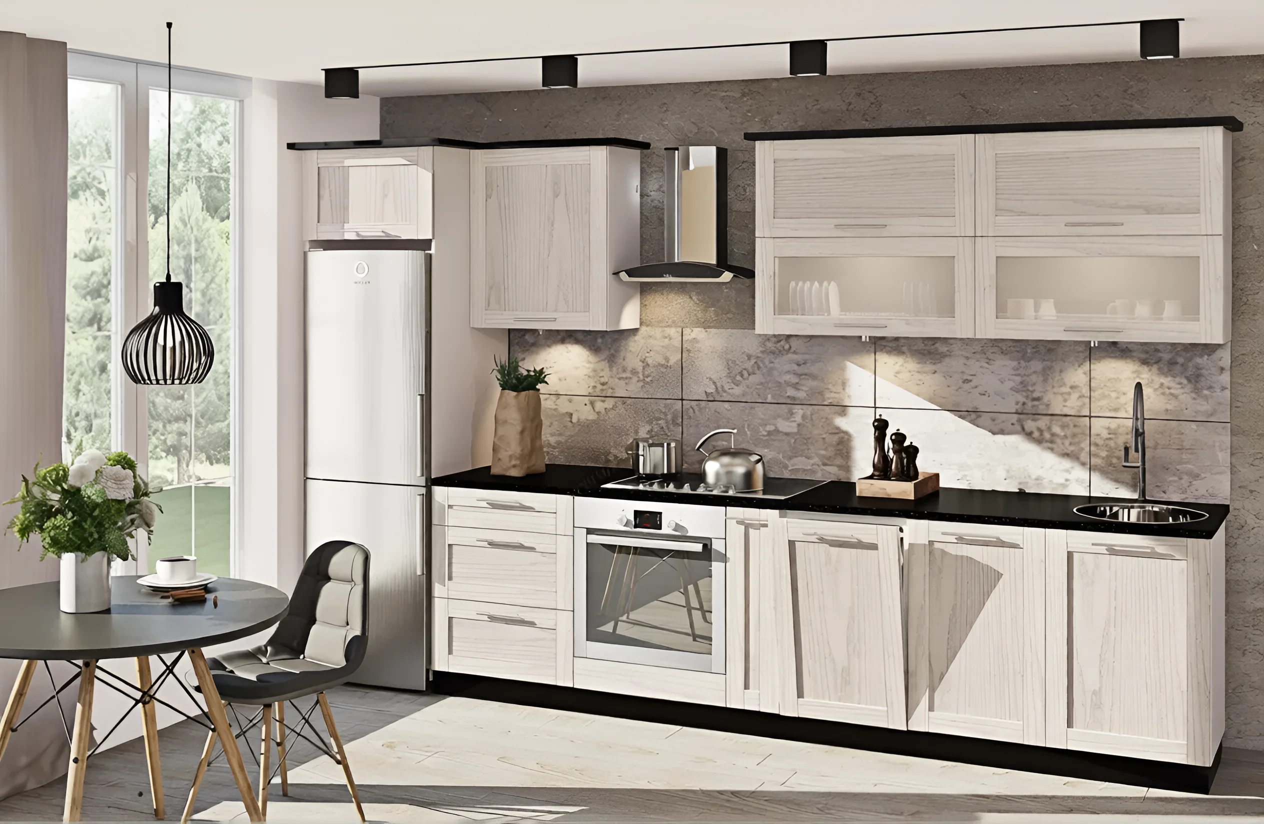 При производстве кухни «Престиж» используются только проверенные и долговечные материалы, гарантирующие ее безупречную эксплуатацию на долгие годы. Корпус кухни выполнен из высококачественного ДСП, известного своей прочностью и устойчивостью к влаге и температурным перепадам. Фасады, являющиеся лицом любой кухни, изготовлены из МДФ рамки с покрытием из ламинированного ДСП. Это сочетание придает им не только привлекательный внешний вид с выразительной текстурой Дуба беленого, но и обеспечивает высокую износостойкость. Ламинированное покрытие легко чистится, устойчиво к царапинам и выцветанию, что делает уход за кухней максимально простым и необременительным. Цвет фасада Дуб беленый – это универсальное решение, которое прекрасно сочетается с различными стилями интерьера, от скандинавского до современного минимализма, и создает светлую, открытую атмосферу.