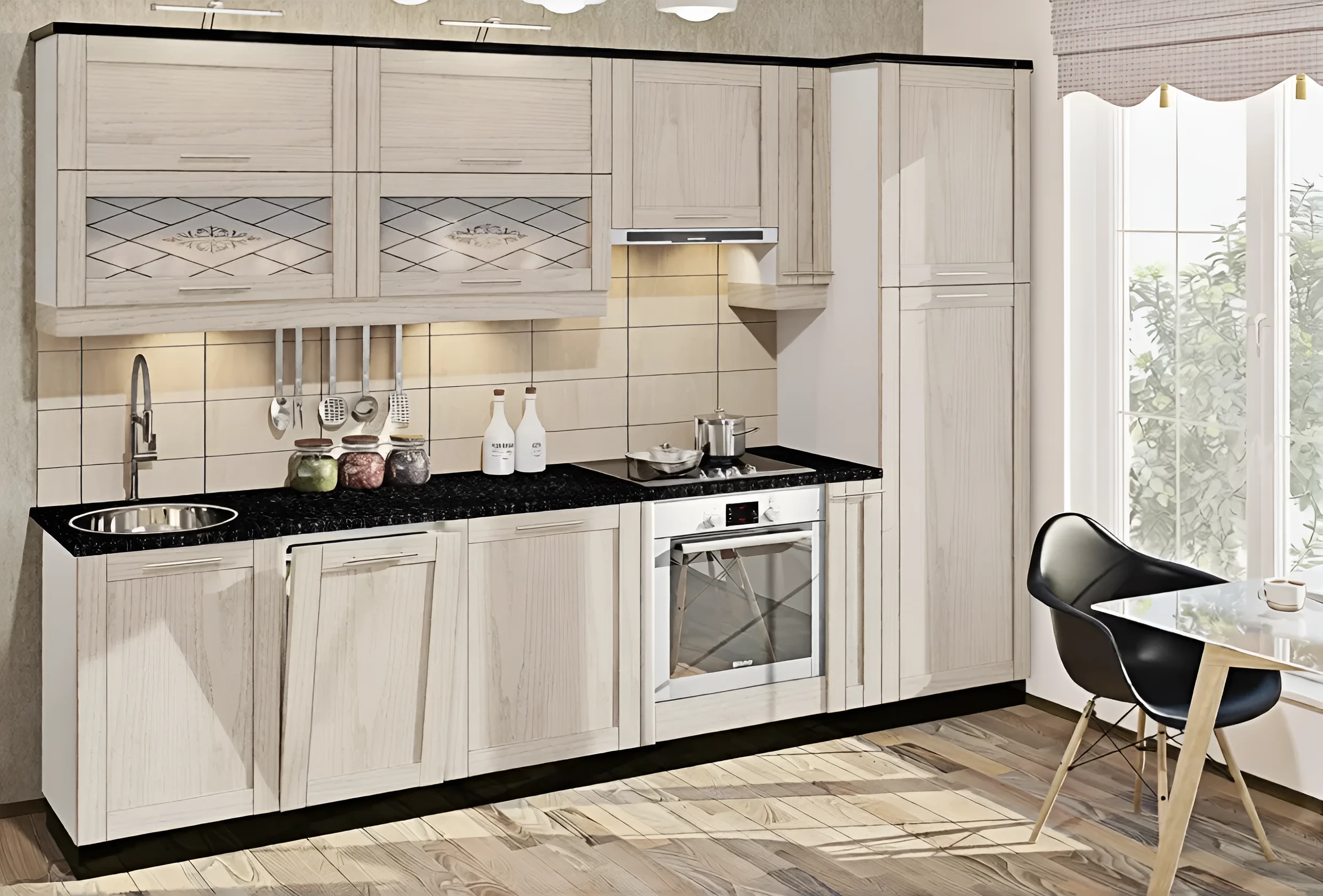 Разработчики кухни «Престиж» уделили особое внимание эргономике. Глубина нижних тумб составляет стандартные 450 мм, что обеспечивает легкий доступ к содержимому и при этом сохраняет достаточное пространство для прохода в кухонной зоне. Столешница глубиной 600 мм предоставляет обширную рабочую поверхность, на которой удобно размещать кухонную утварь, мелкую бытовую технику и проводить все этапы приготовления пищи без стеснения. Каждая деталь спроектирована таким образом, чтобы минимизировать усилия и максимизировать комфорт при использовании кухни. Удобство использования подтверждается тем, что все элементы расположены интуитивно понятно и функционально, позволяя вам наслаждаться процессом готовки и общения.