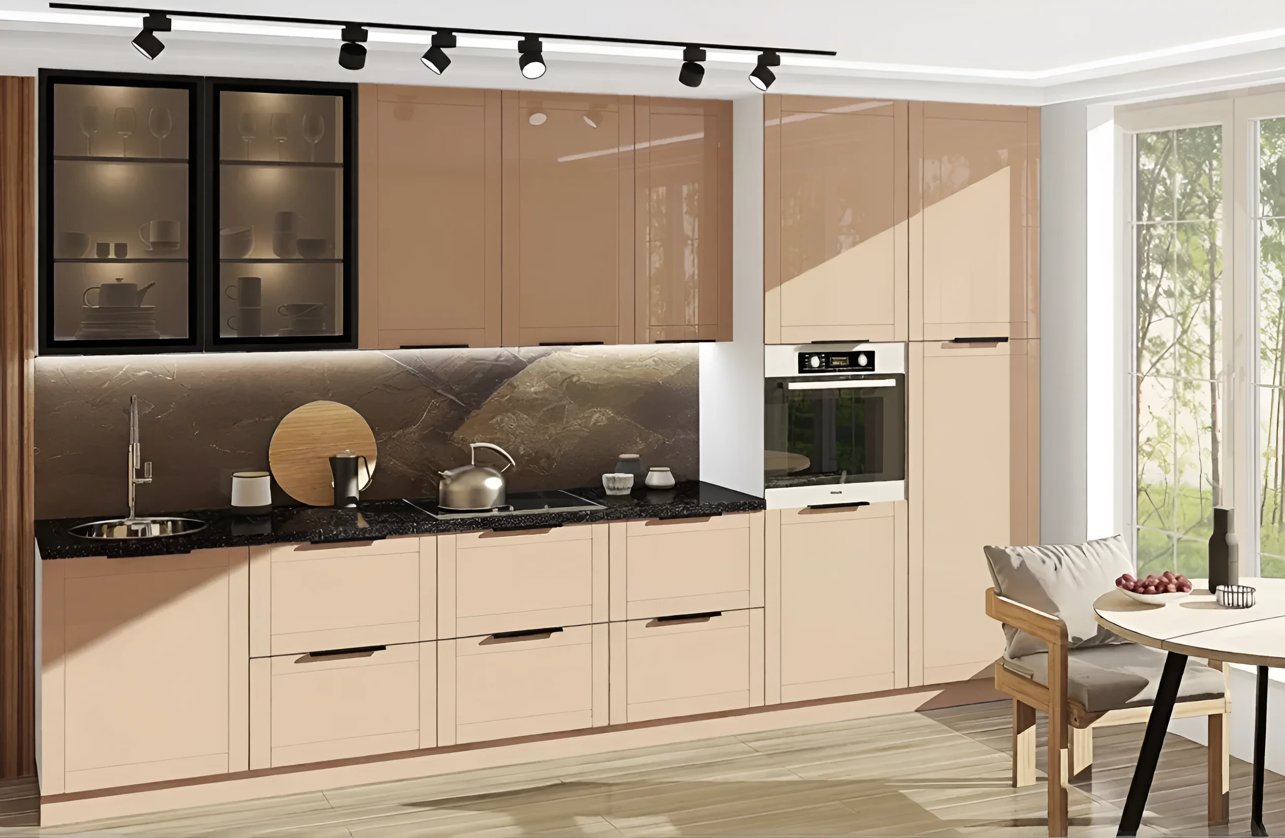 Серия «Рамка» известна своим классическим, но при этом актуальным дизайном. Фасады кухни изготовлены из крашеного глянцевого МДФ, что придает им особый шарм и блеск. Глянцевое покрытие не только выглядит роскошно, но и визуально расширяет пространство, наполняя его светом. Сочетание цветов Капучино и Крем – это беспроигрышный вариант для создания светлого, воздушного и очень стильного интерьера. Эти оттенки универсальны и прекрасно гармонируют как с современными, так и с более традиционными элементами декора. Угловая конфигурация 3х2 метра идеально подходит для эффективного использования каждого квадратного метра вашей кухни, обеспечивая удобное расположение рабочих зон и достаточно места для хранения.